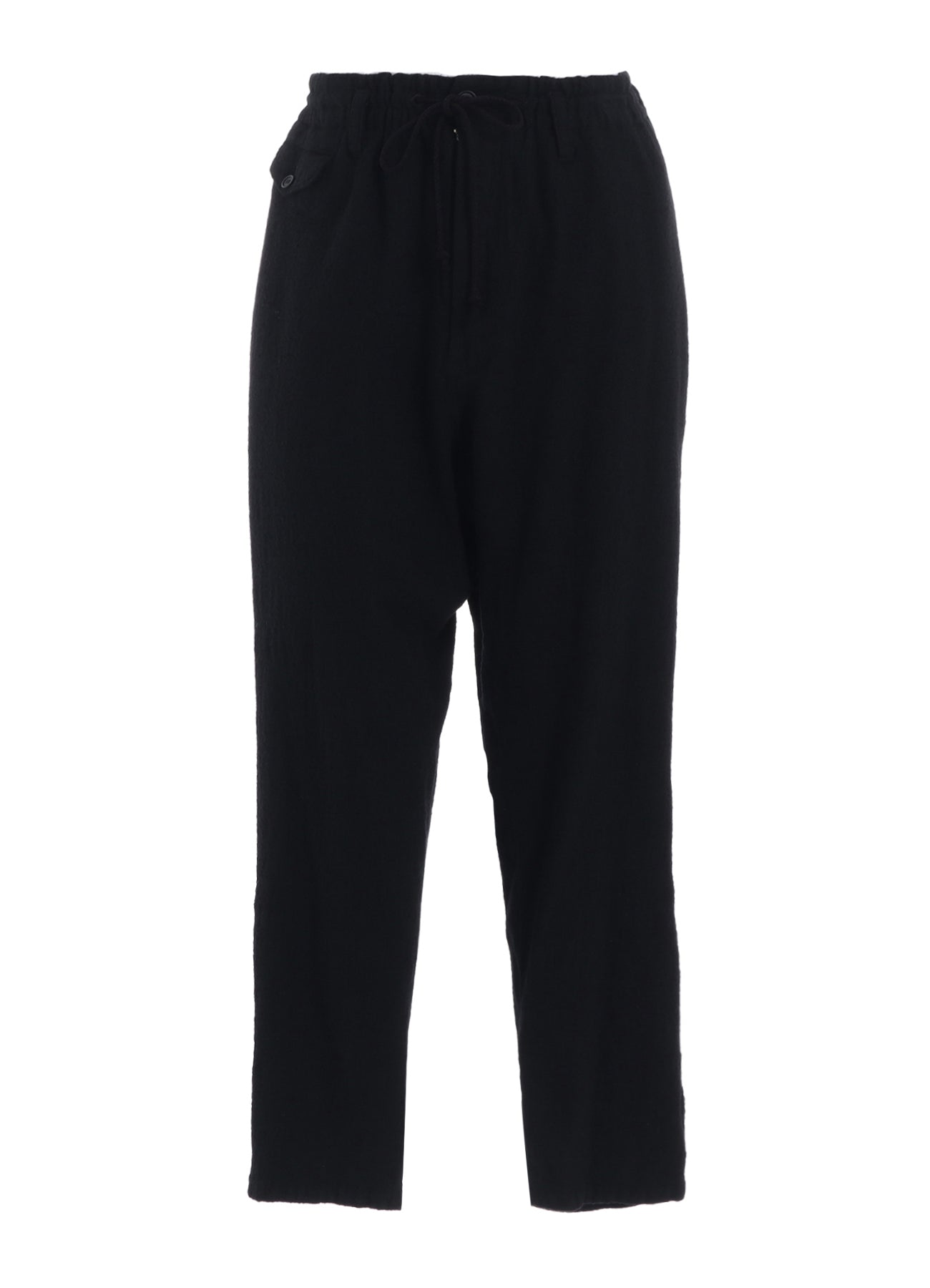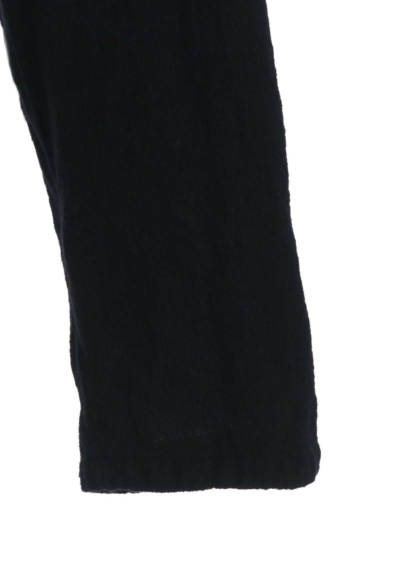 These pants, crafted from Bishu wool gauze, offer a light and warm feel, thanks to fulling. The watch pocket adds subtle accent while the elastic waistband with drawstring ensures comfort. Ideal for casual styling, these pants provide elegance with ease and are perfect as daily wear in fall and winter.
