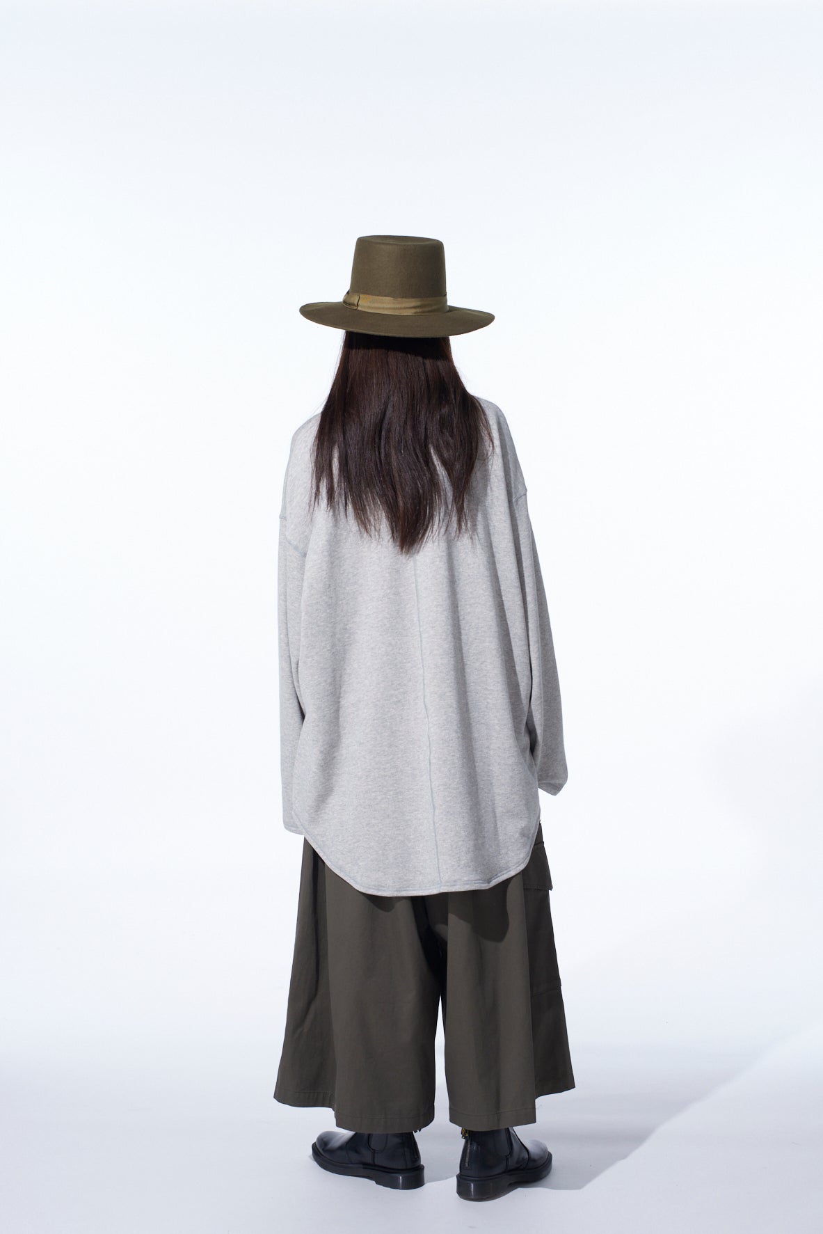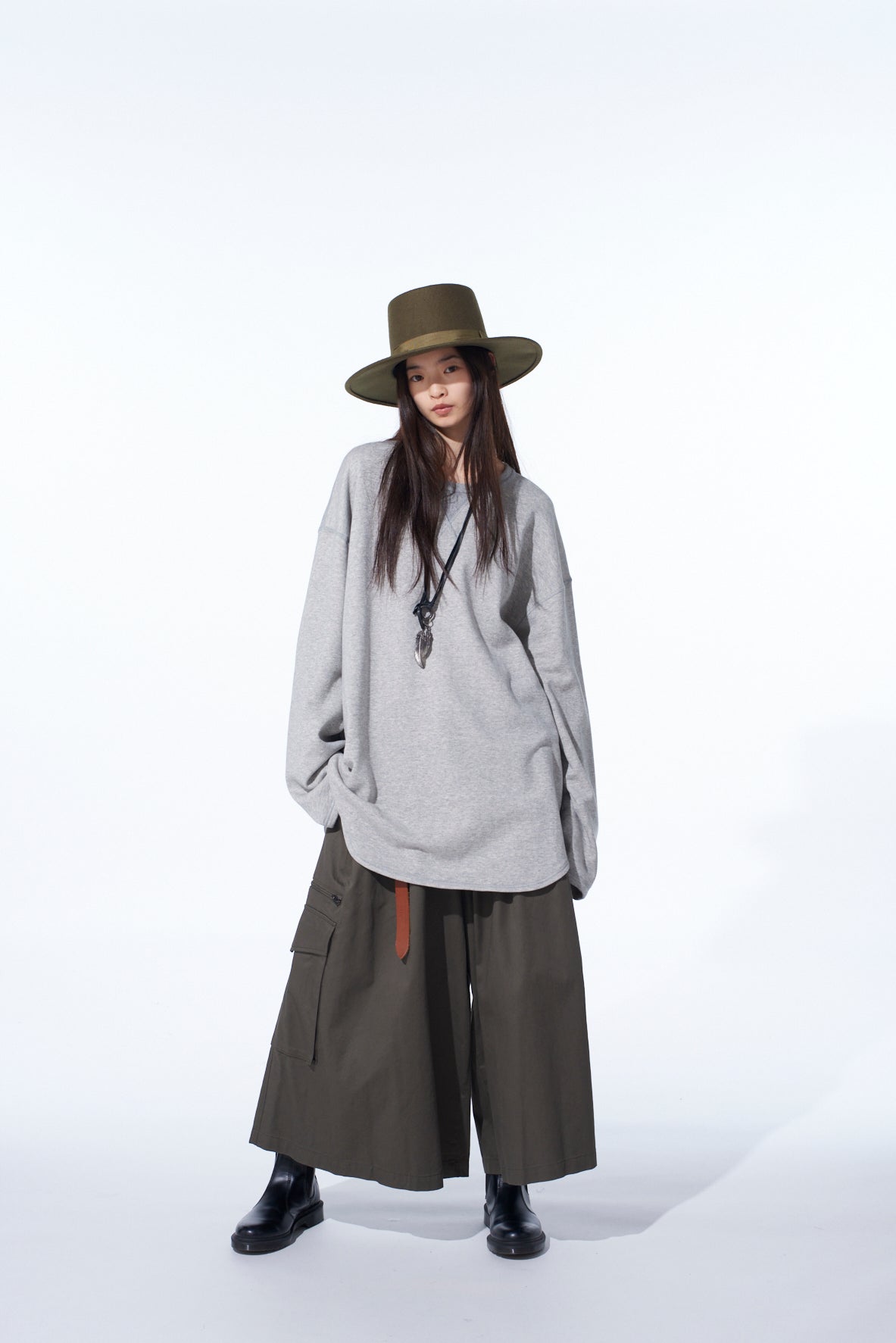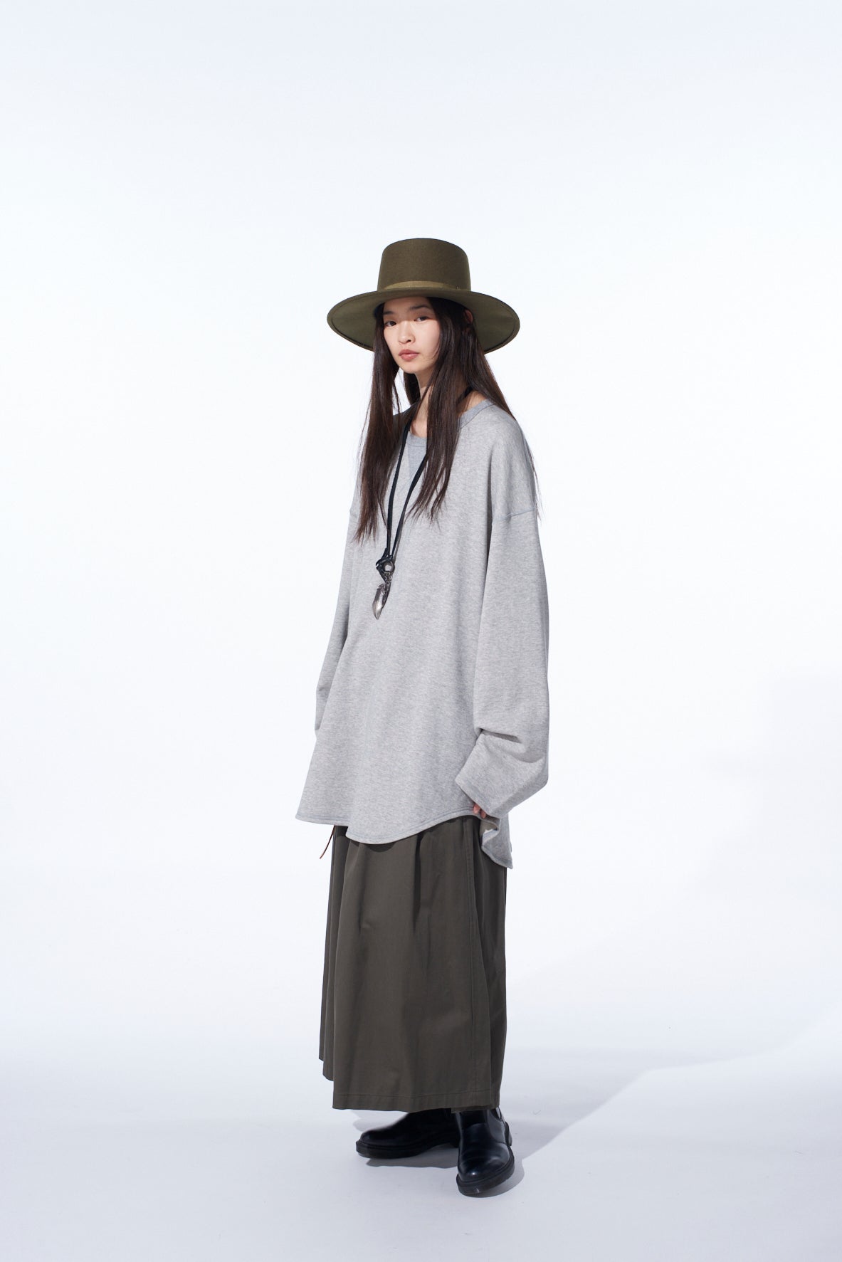 This long T-shirt is made from domestic fleece fabric, meticulously knitted and dyed. The looped back surface uses combed yarn for a plush feel. Featuring a gusset detail at the neckline, it offers a relaxed fit with an oversized silhouette, making it ideal for everyday wear with its focus on material and detail.