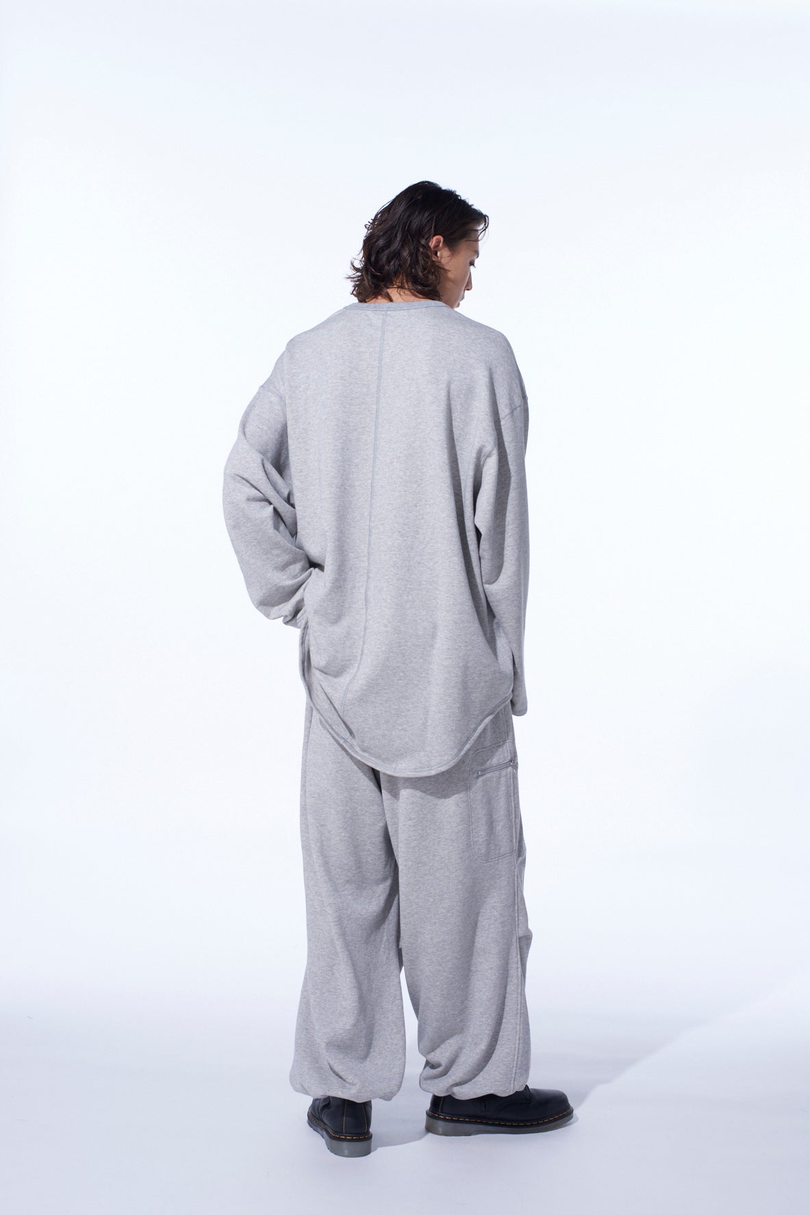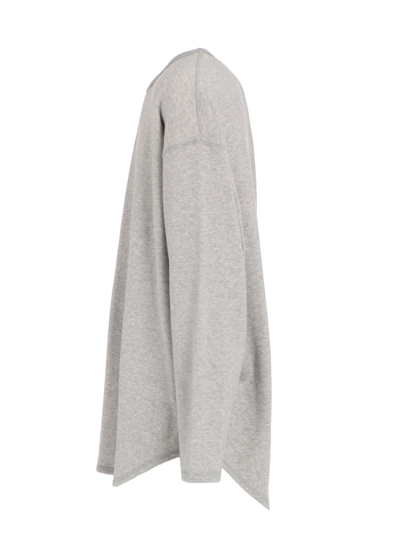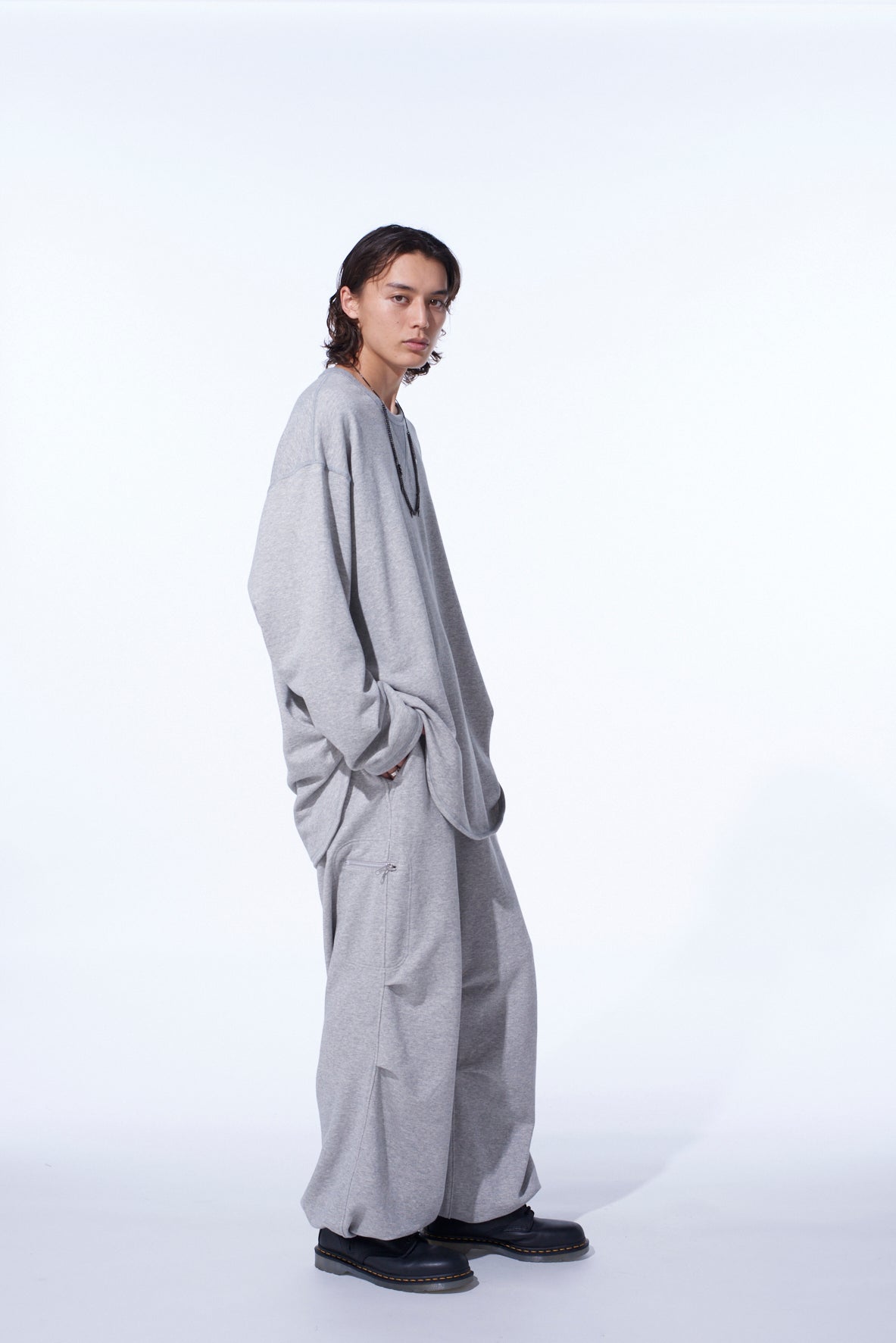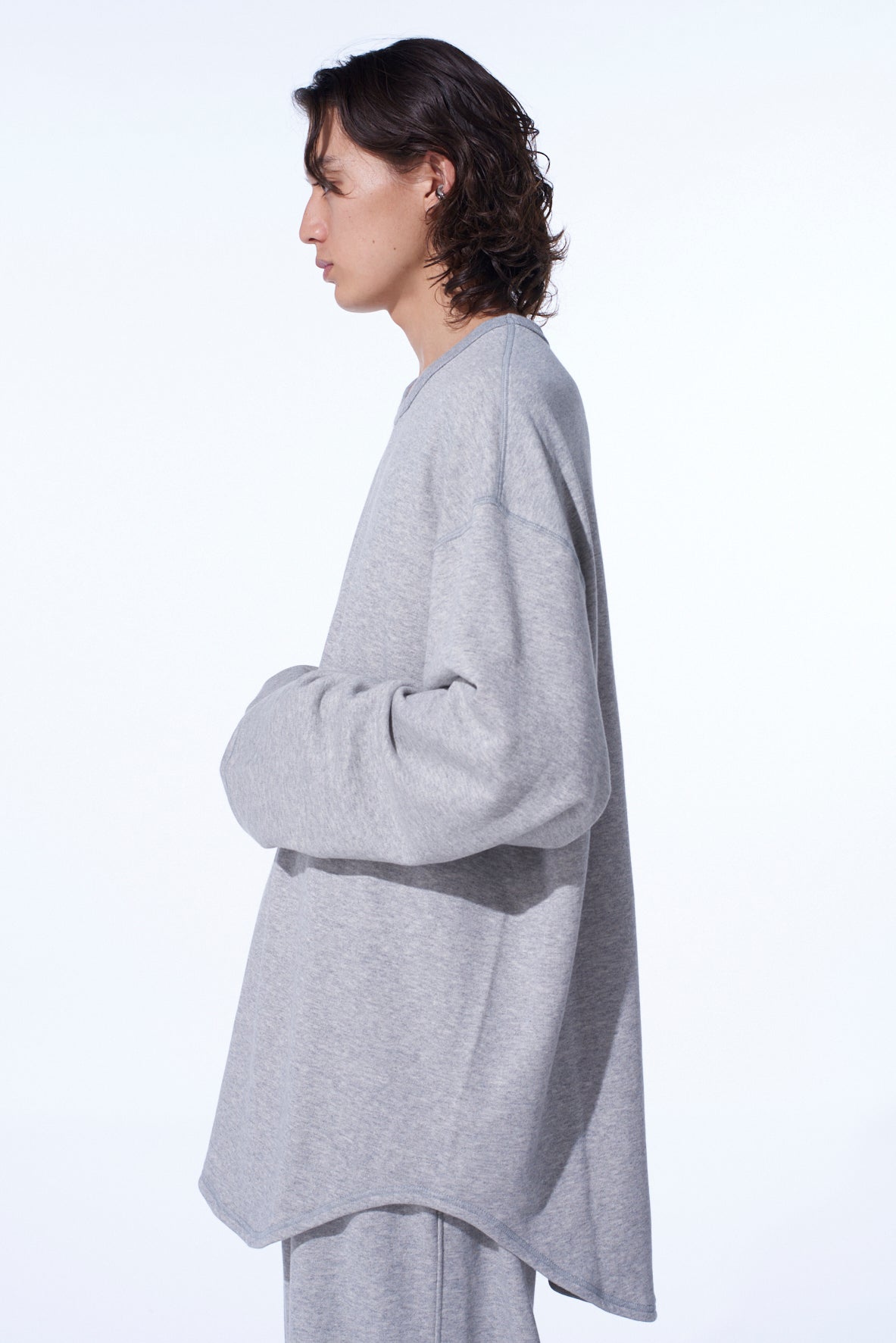 This long T-shirt is made from domestic fleece fabric, meticulously knitted and dyed. The looped back surface uses combed yarn for a plush feel. Featuring a gusset detail at the neckline, it offers a relaxed fit with an oversized silhouette, making it ideal for everyday wear with its focus on material and detail.