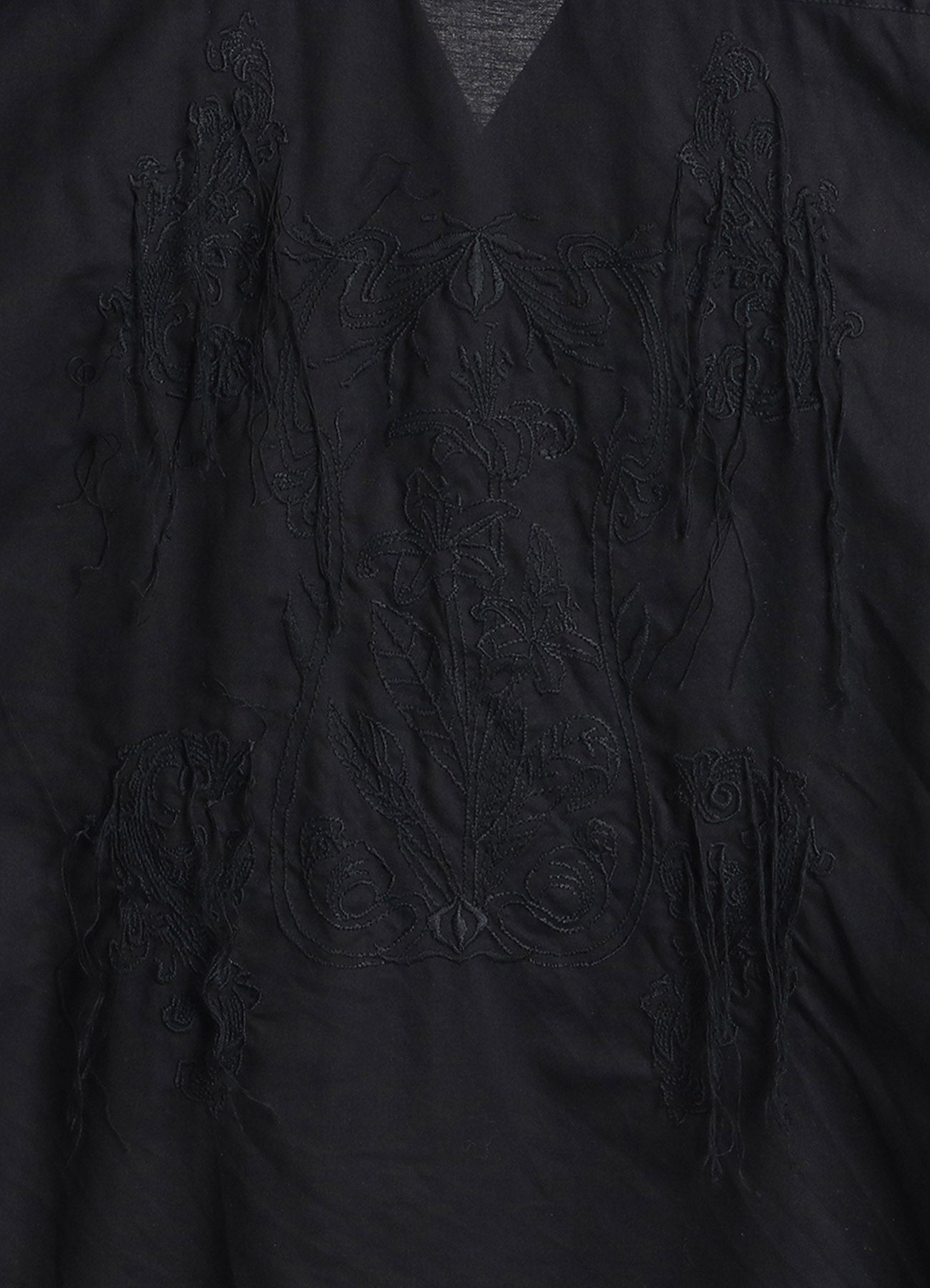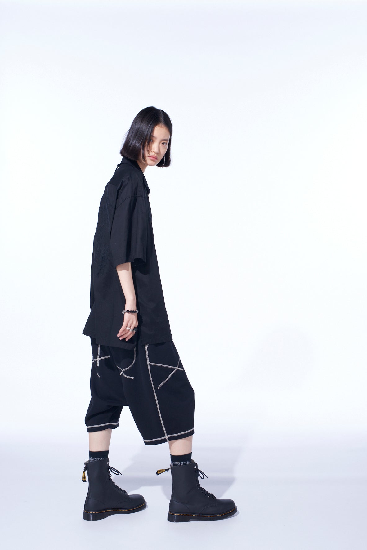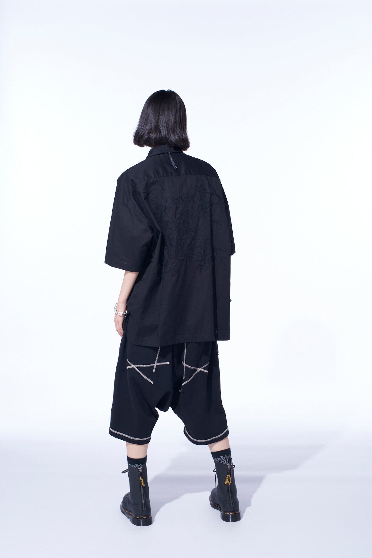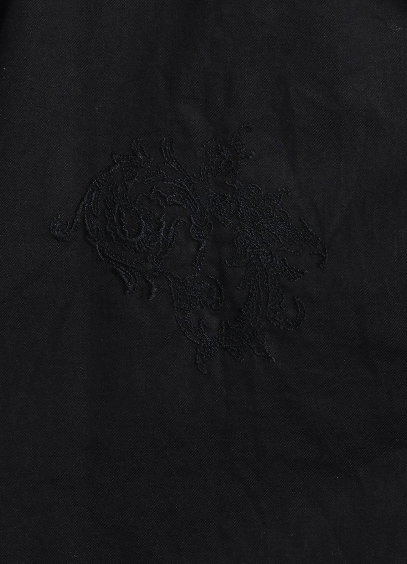 This open-collar shirt features baroque-style embroidery on the collar, chest, and back. The large back embroidery design boasts intricate outlines with long threads that sway in the breeze. Made from durable, soft, and lightweight cotton twill, it offers a neutral silhouette for diverse pant pairings.