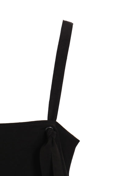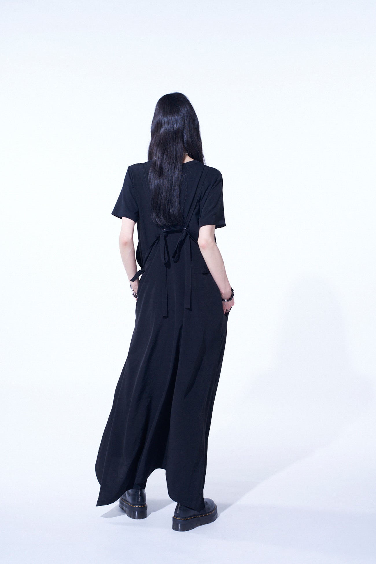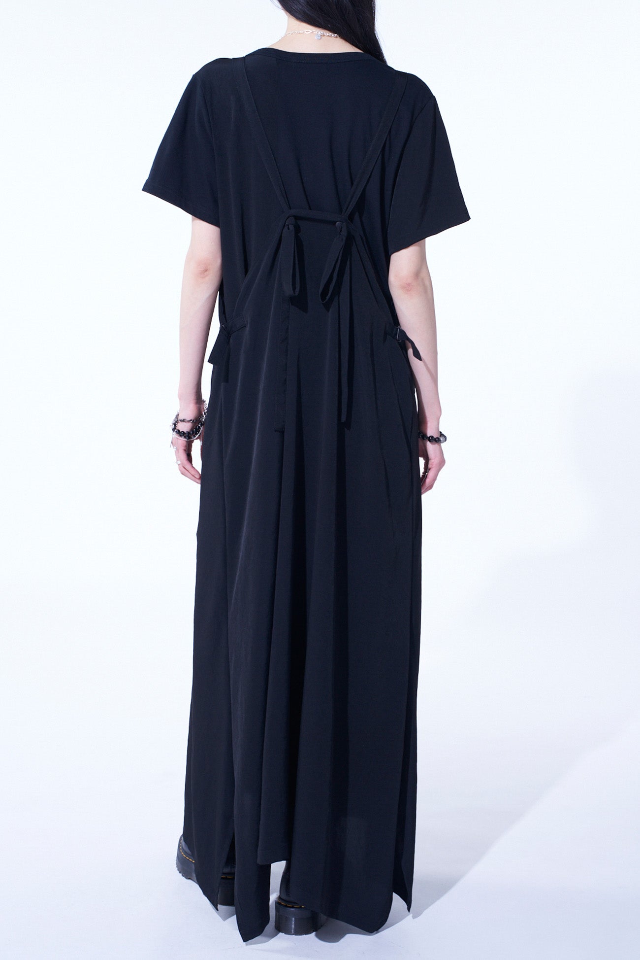 This salopette skirt captivates with its light and variable silhouette, glossy sheen, and airy comfort. Originally a casual workwear piece, it’s transformed with dressy material to fit a modern mode. Its adjustable straps and pockets offer practical convenience, making it functional like no other dress.