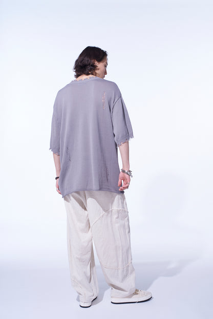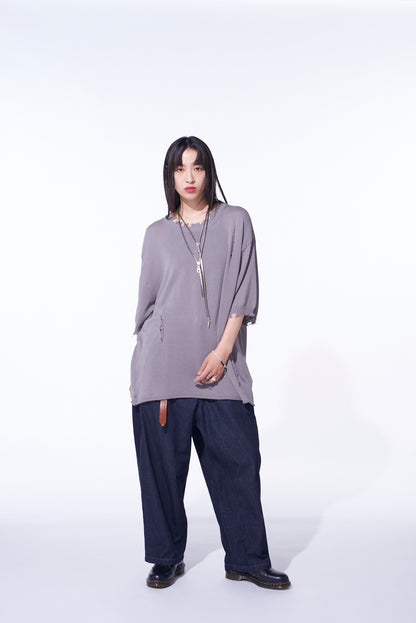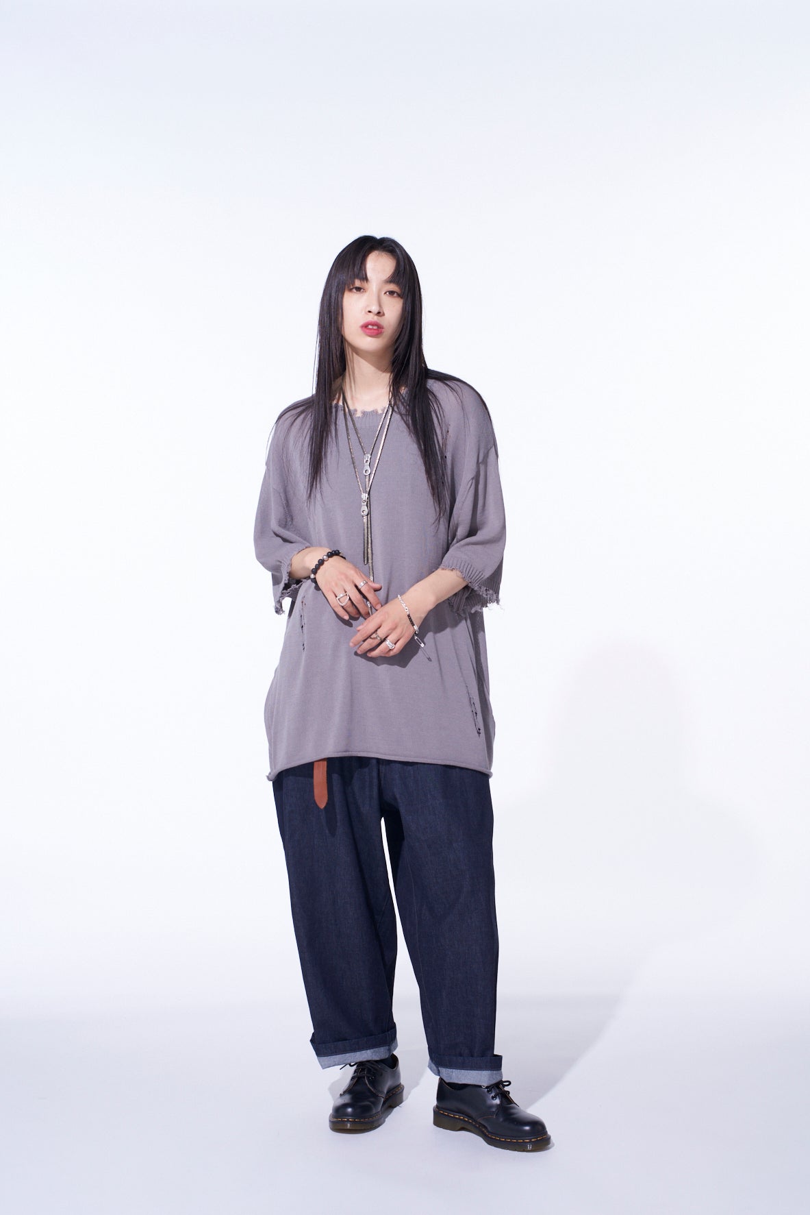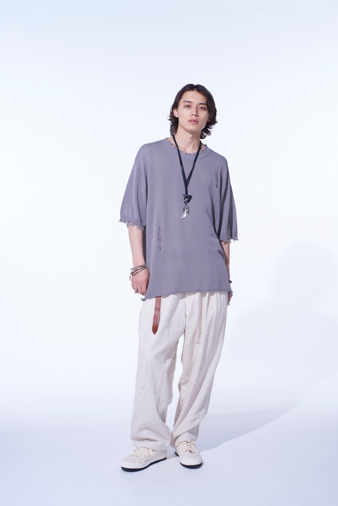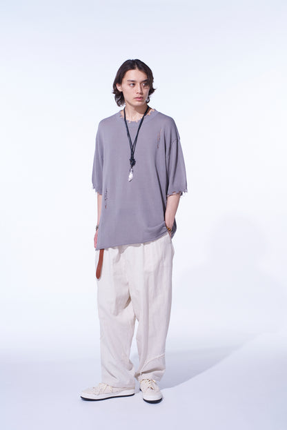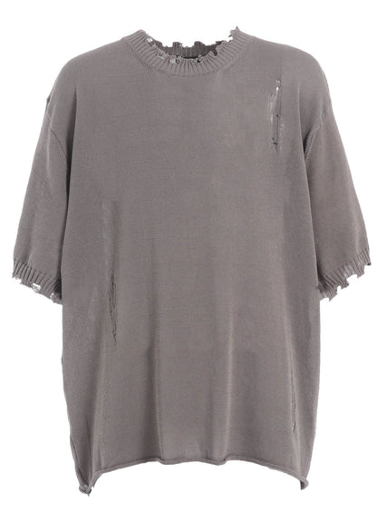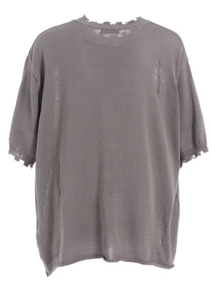 This crew neck short sleeve knit by S’YTE offers a smooth texture free of pilling. Bold distressing at the sleeves and neck, coupled with subtle distress details on the body, provide a distinctive rag-like look. Made from 100% cotton, it is cool for hot weather and layers well in cooler seasons.