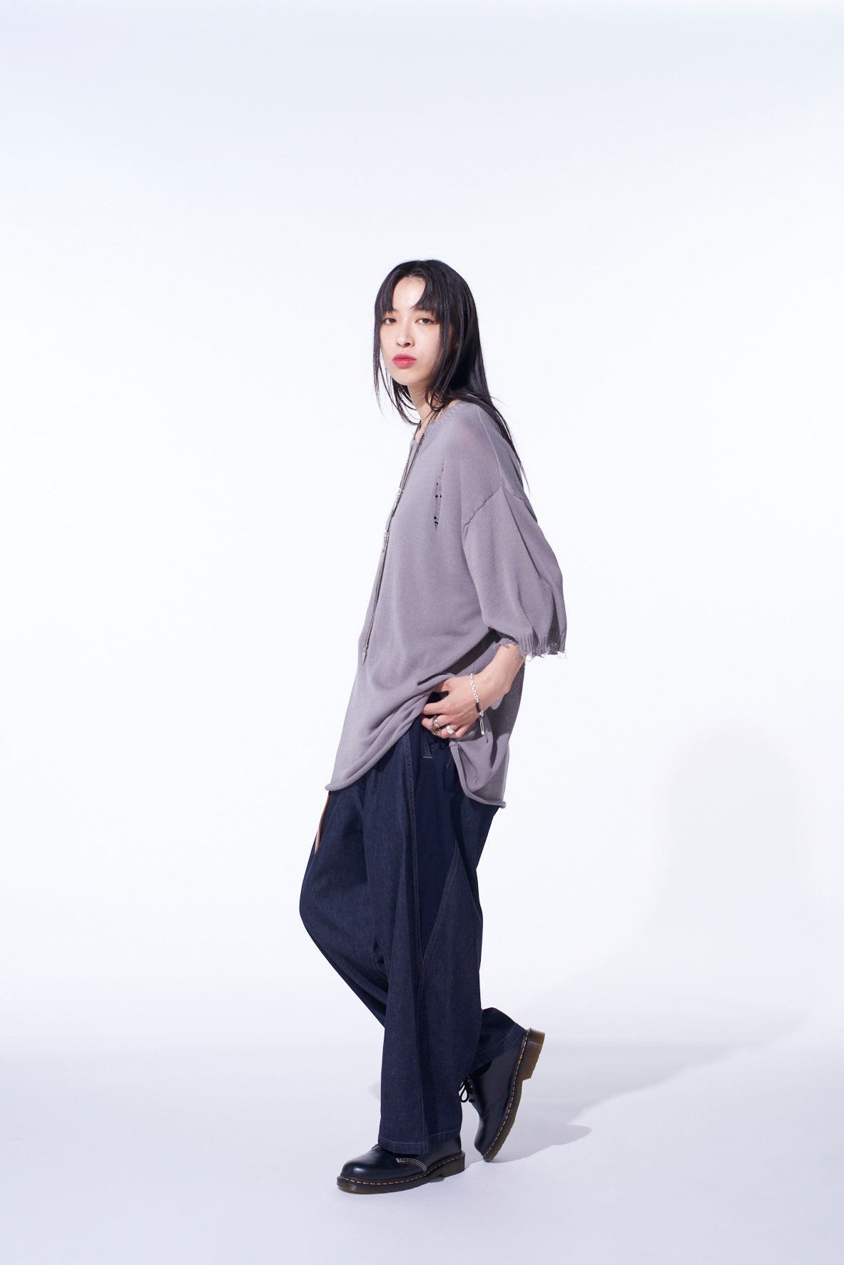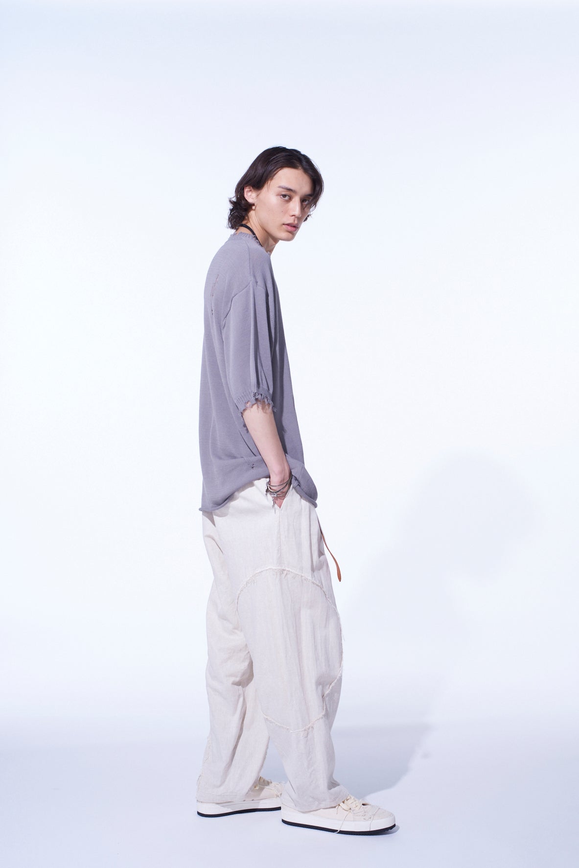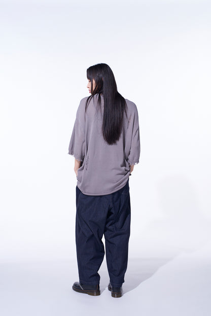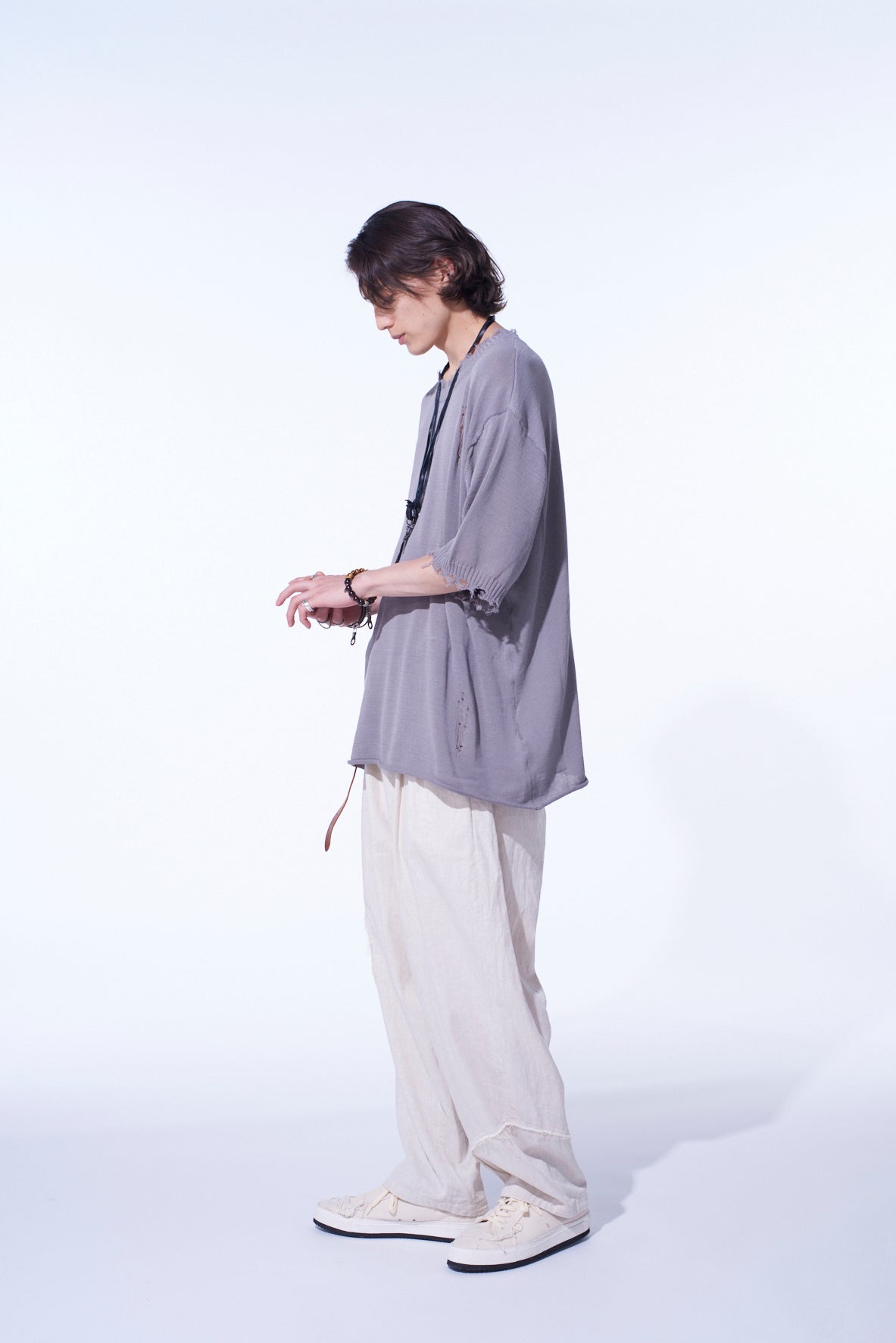 This crew neck short sleeve knit by S’YTE offers a smooth texture free of pilling. Bold distressing at the sleeves and neck, coupled with subtle distress details on the body, provide a distinctive rag-like look. Made from 100% cotton, it is cool for hot weather and layers well in cooler seasons.