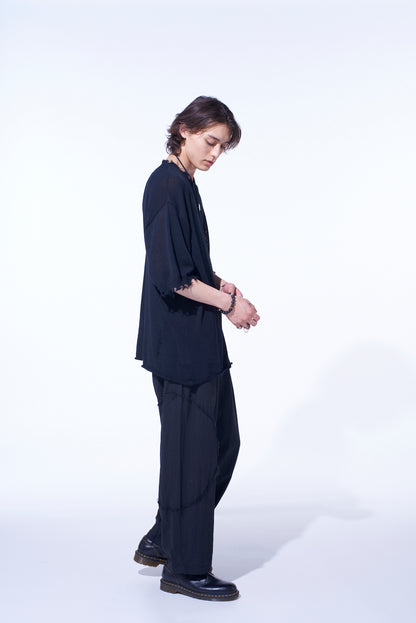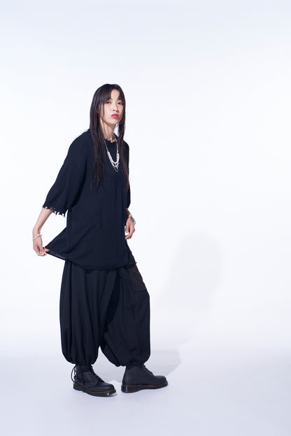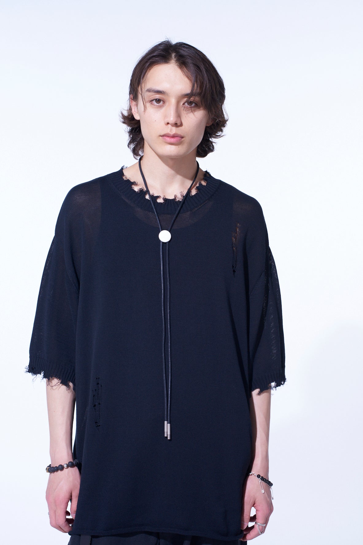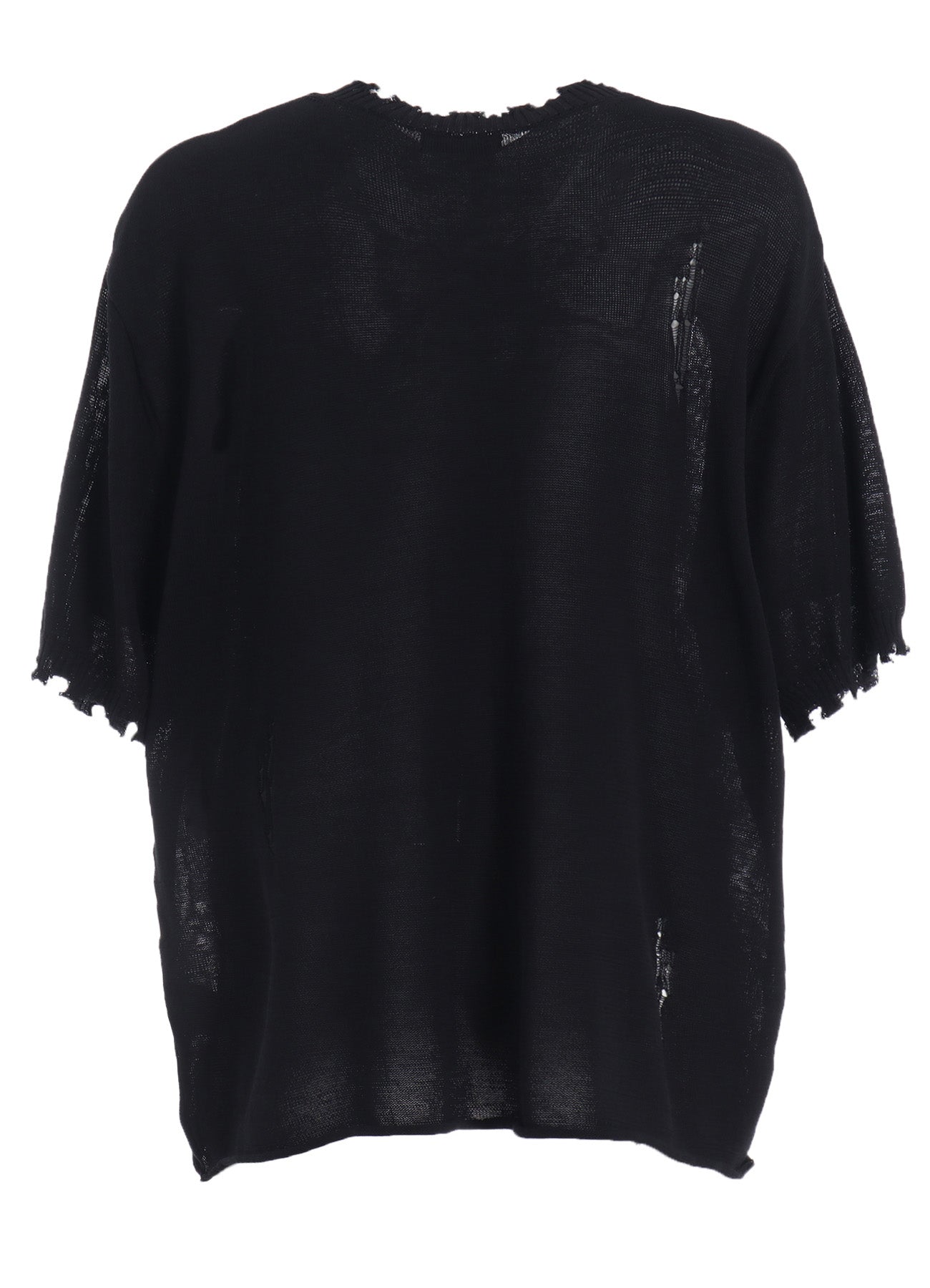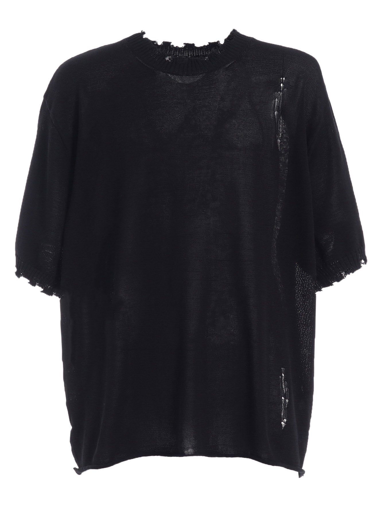 This crew neck short sleeve knit by S’YTE offers a smooth texture free of pilling. Bold distressing at the sleeves and neck, coupled with subtle distress details on the body, provide a distinctive rag-like look. Made from 100% cotton, it is cool for hot weather and layers well in cooler seasons.