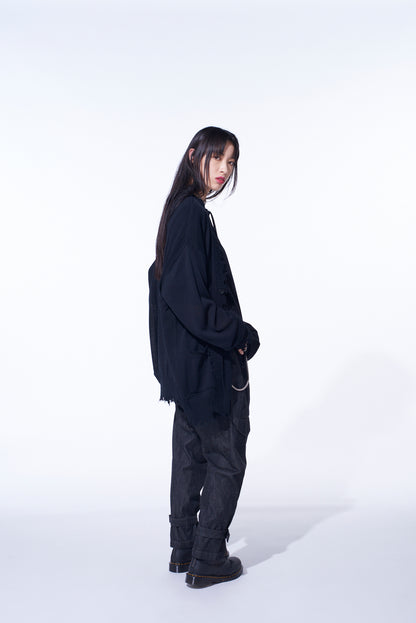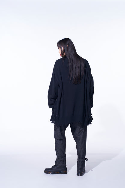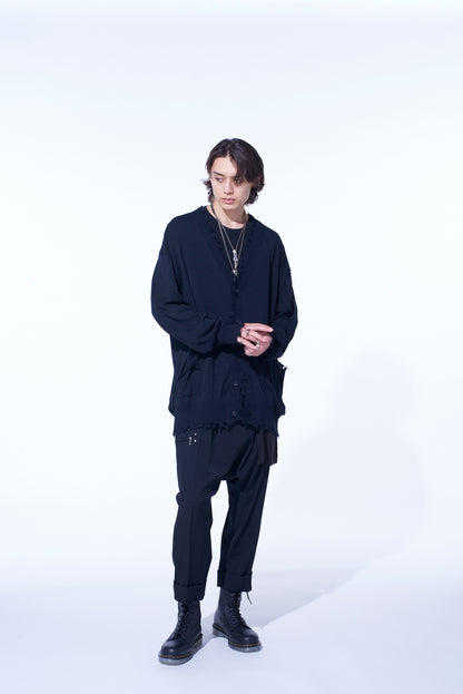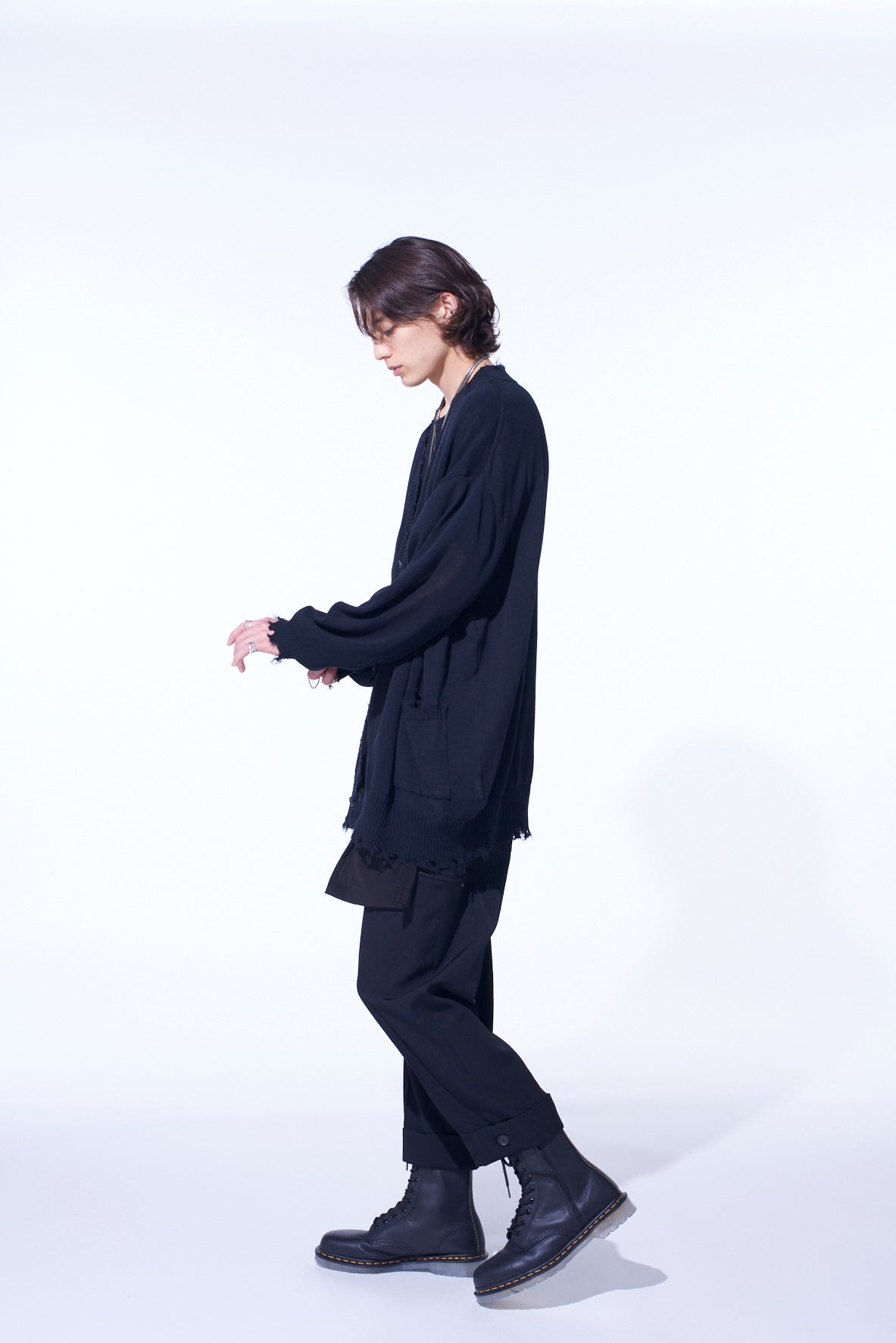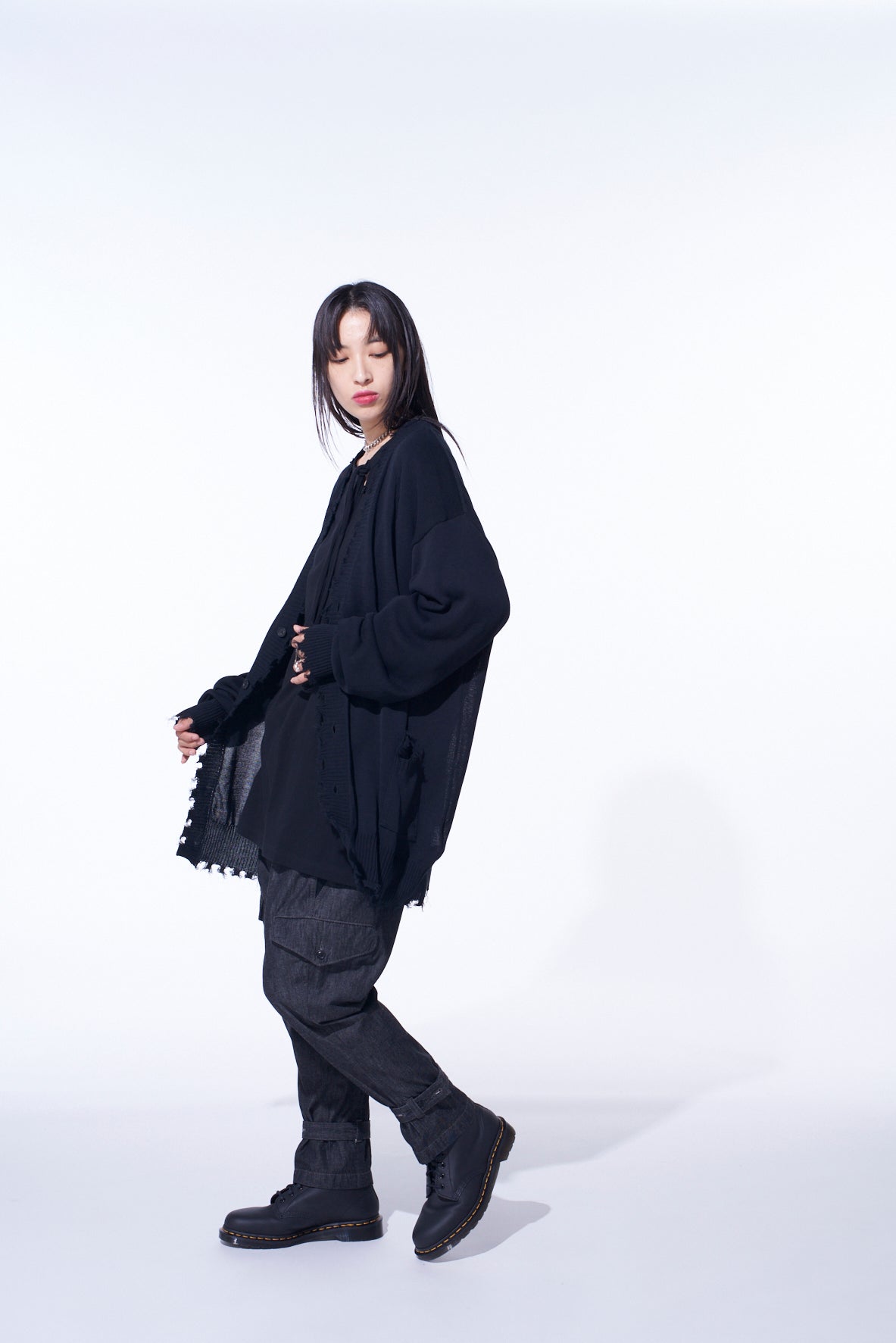 A V-neck knit cardigan with a smooth touch, free from fuzz, offering comfort and style. Featuring bold damage processing on cuffs and neck, and subtle damage on the body for a layered effect typical of S’YTE’s decadent rag-like look. The 100% cotton body has a moderate transparency, making it suitable for year-round use.