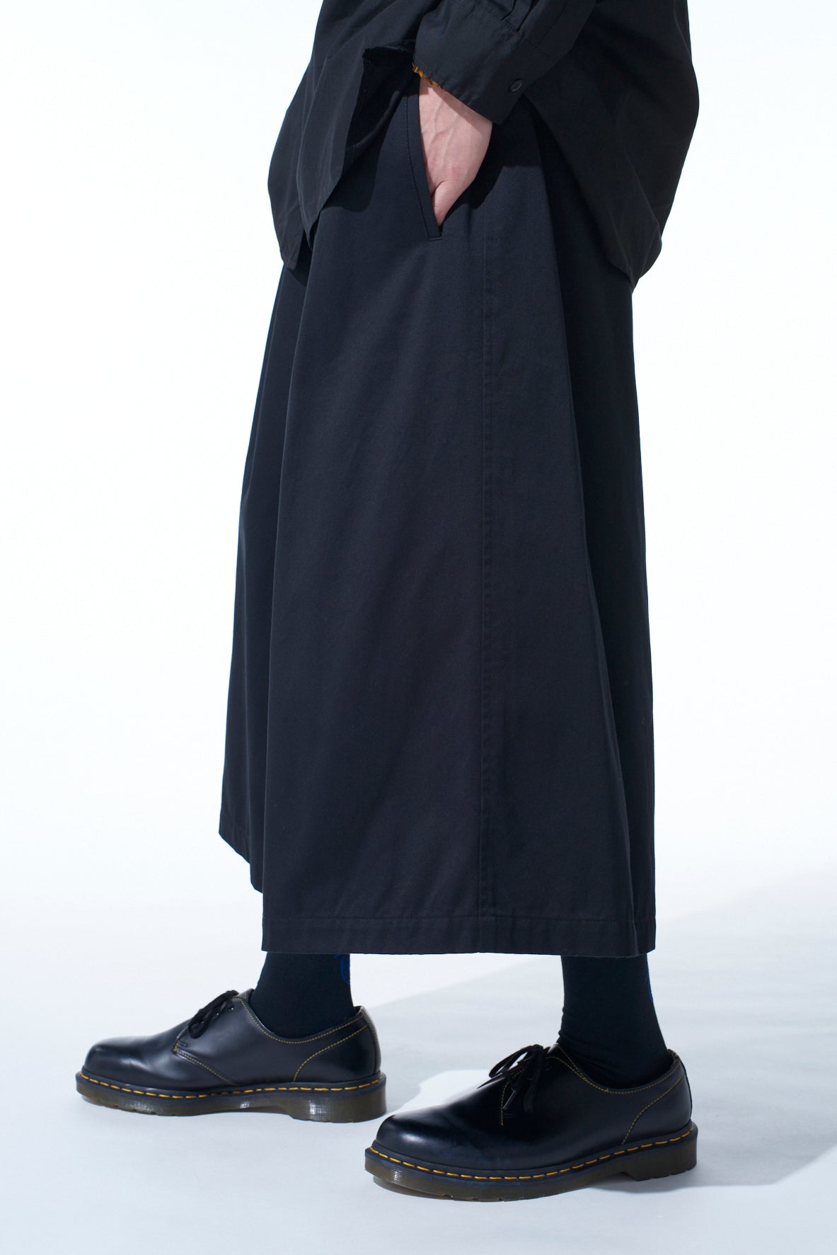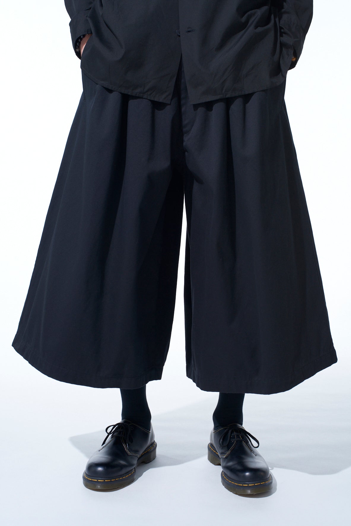 This S’YTE signature culotte pants are tailored from Weapon Cloth, originating from military wear, featuring a durable, glossy finish. The gaucho-style wide silhouette can easily transform the wearer's appearance. The 7/8-length offers versatility, pairing well with boots, sneakers, or sandals, while its cotton material evolves for a unique look over time.