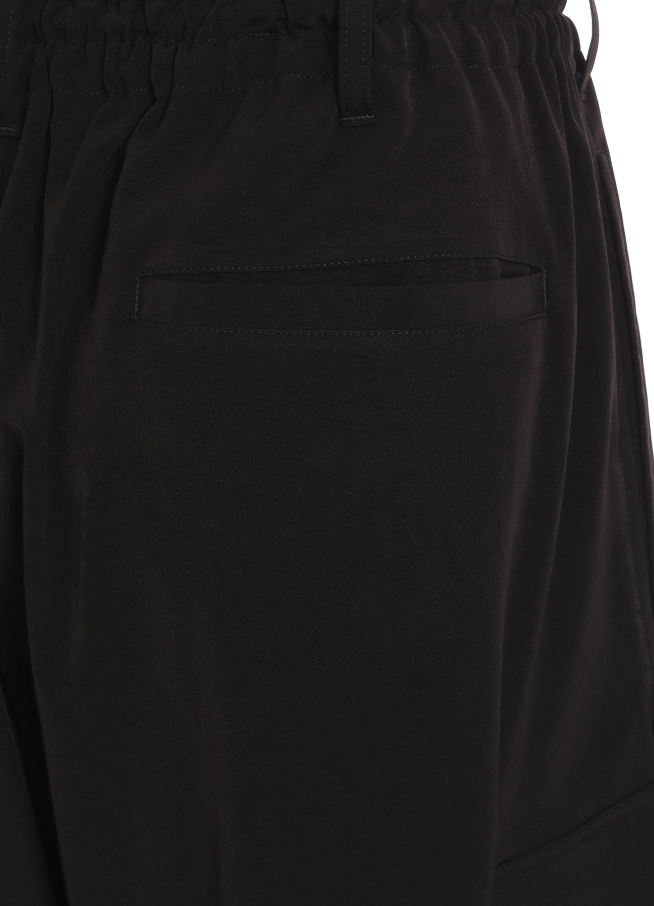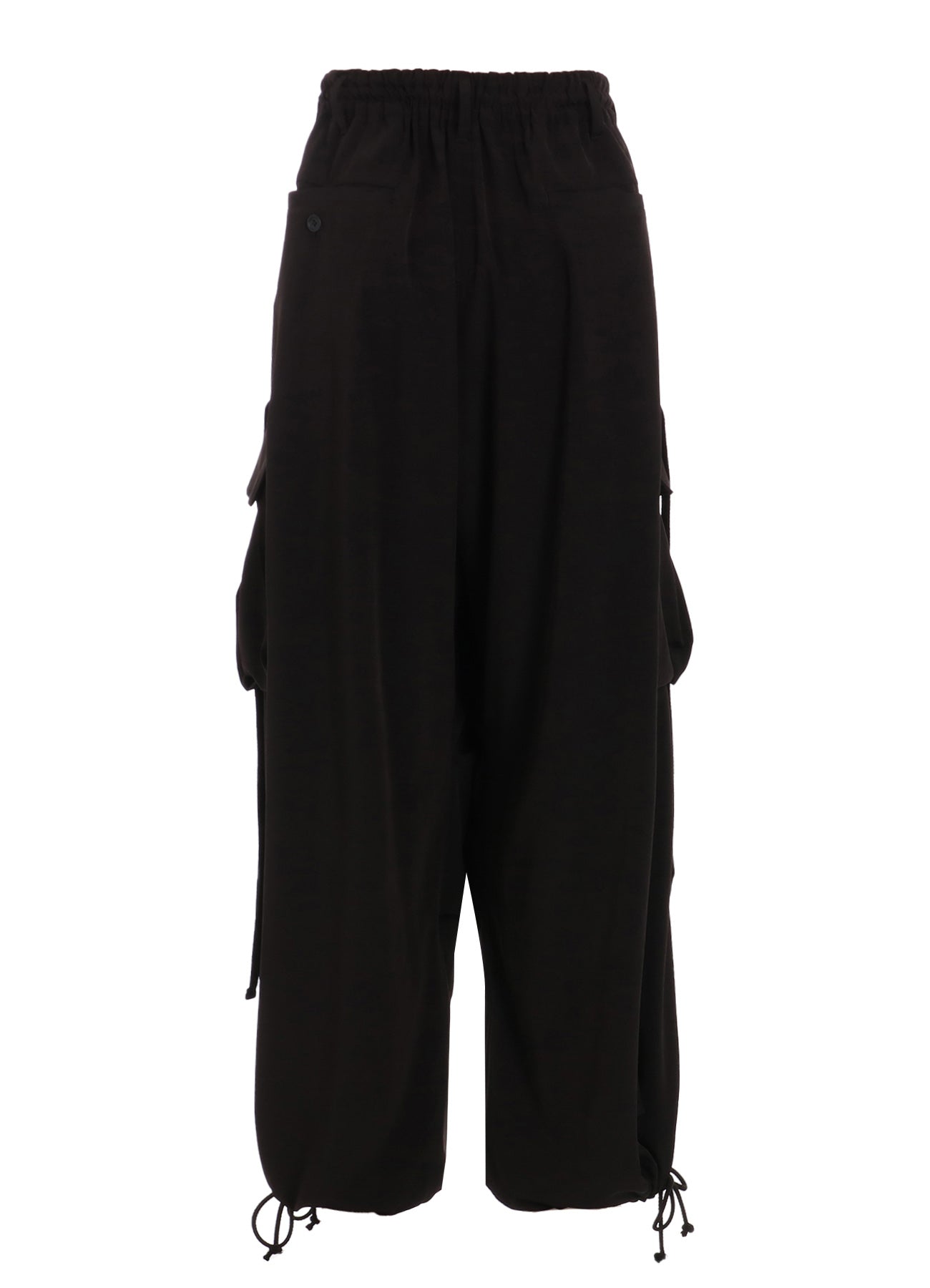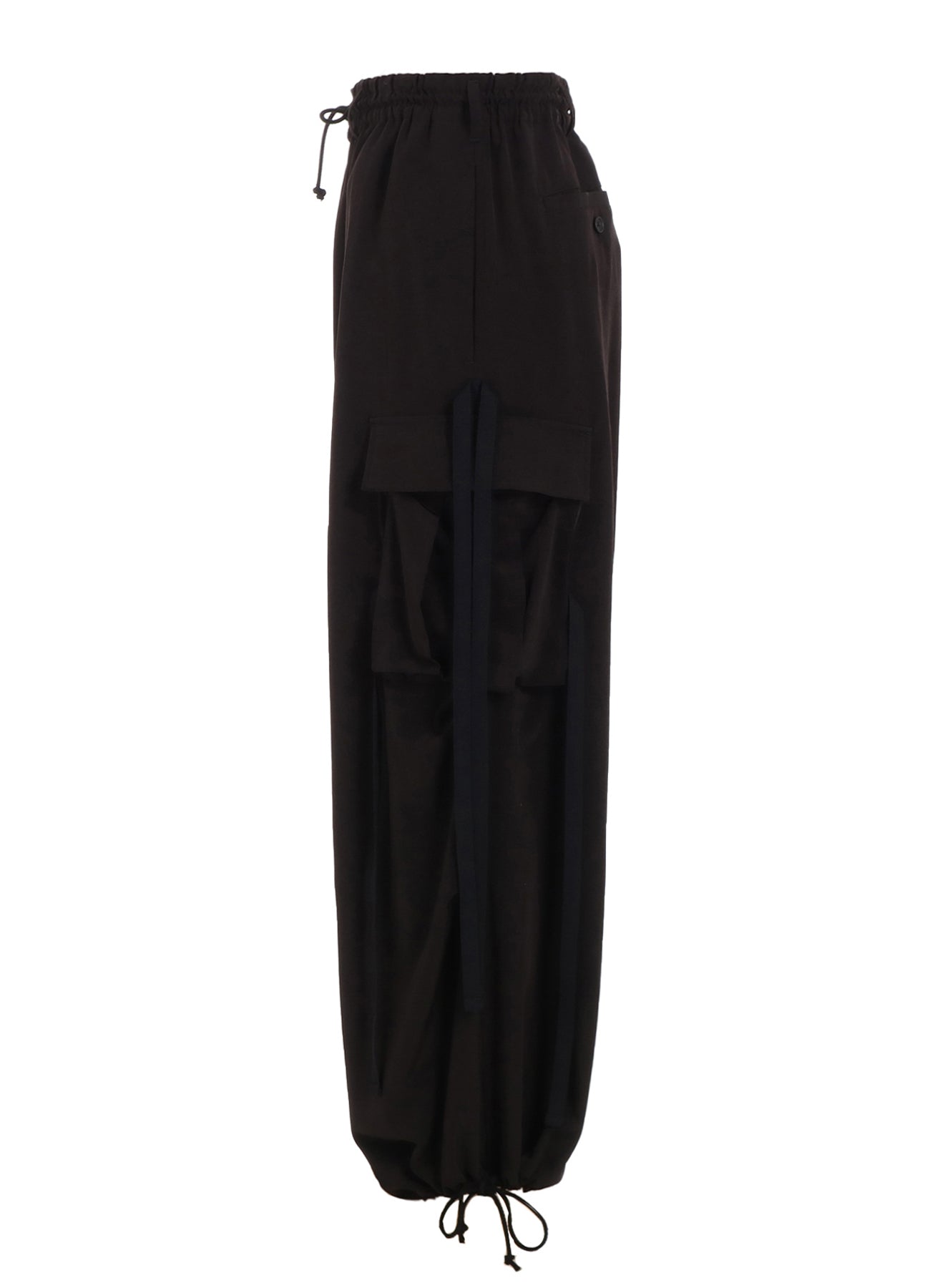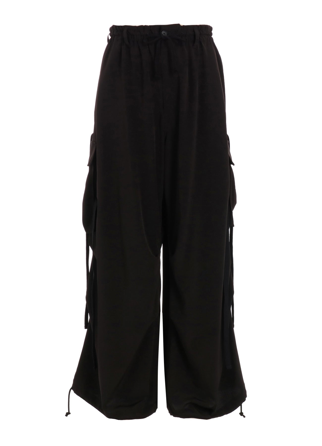 These Techno Pants are a distinctive fusion of rugged military aesthetics and elegance by S’YTE, inspired by U.S. Military M65 Field Pants and reimagined in the U.K. with unique tape and pocket arrangements. The design prominently features numerous dangling tapes and a wide silhouette, allowing for versatile styling.