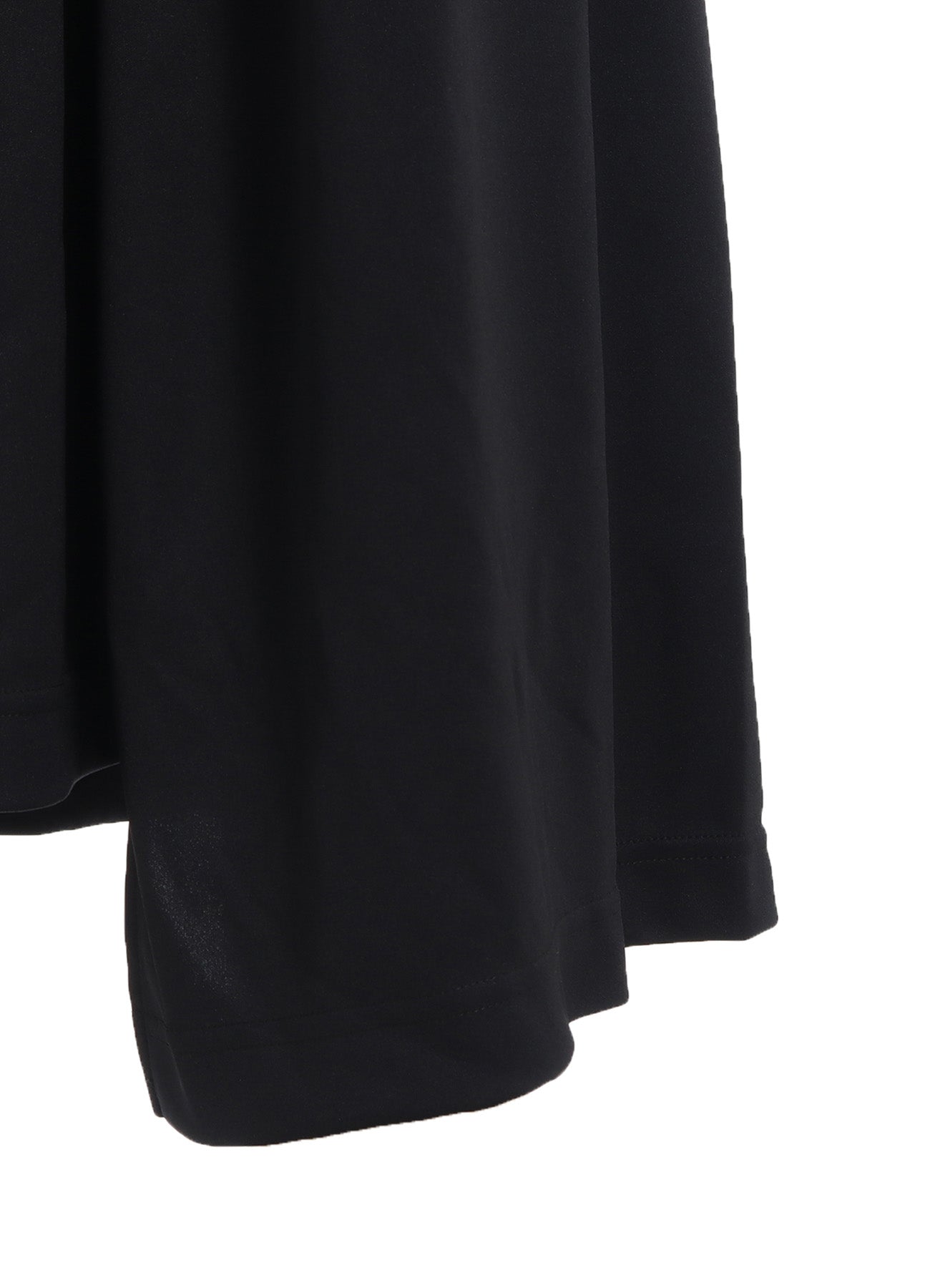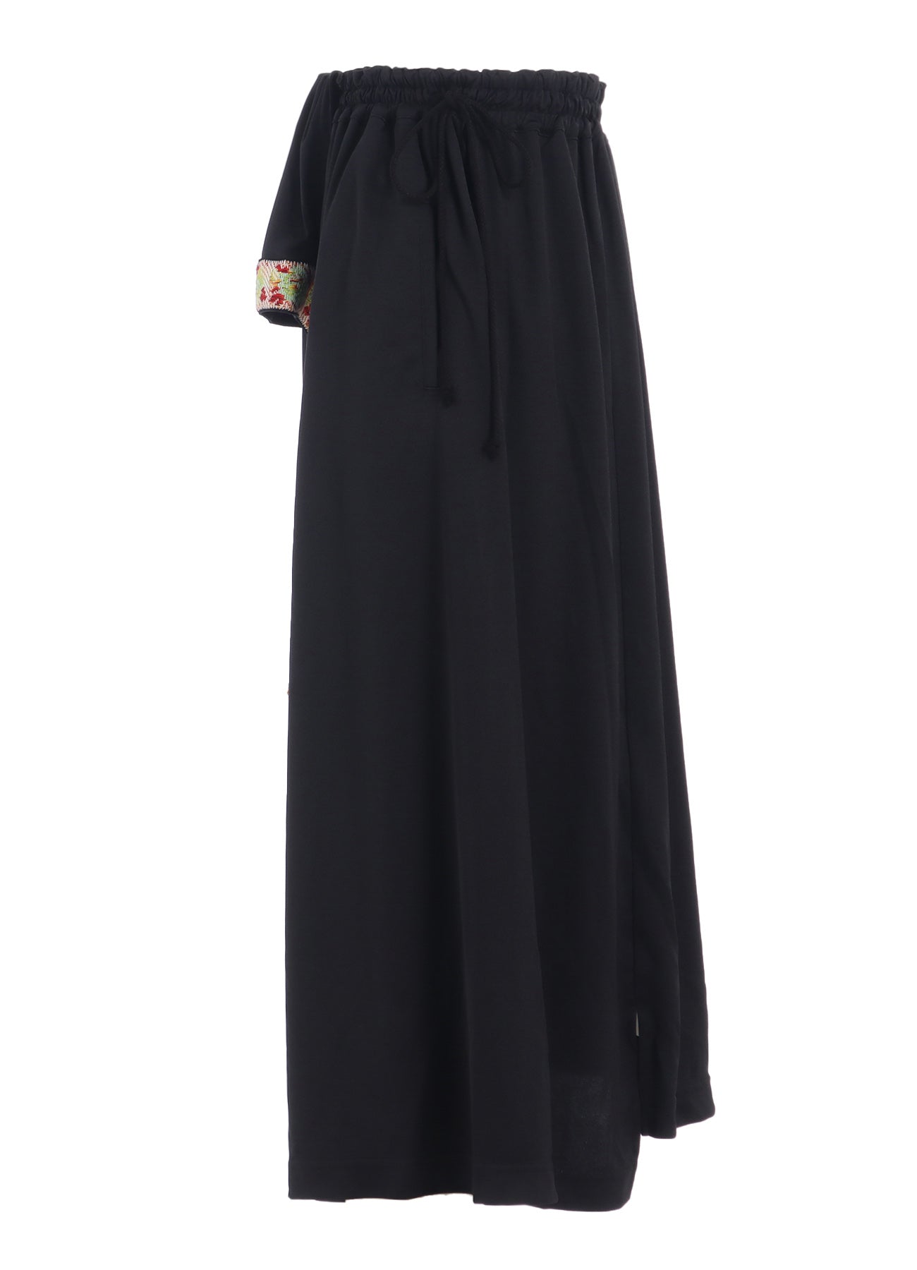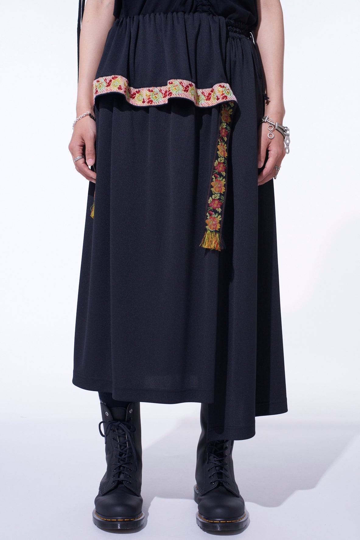 This gathered skirt features jersey fabric with an ethnic touch from partially used Tyrolean tape. The unisex waistband has an elastic and drawstring for easy adjustment, allowing you to change lengths as desired. The asymmetric hemline adds a distinctive accent, enhancing the beauty of fabric movement and silhouette.