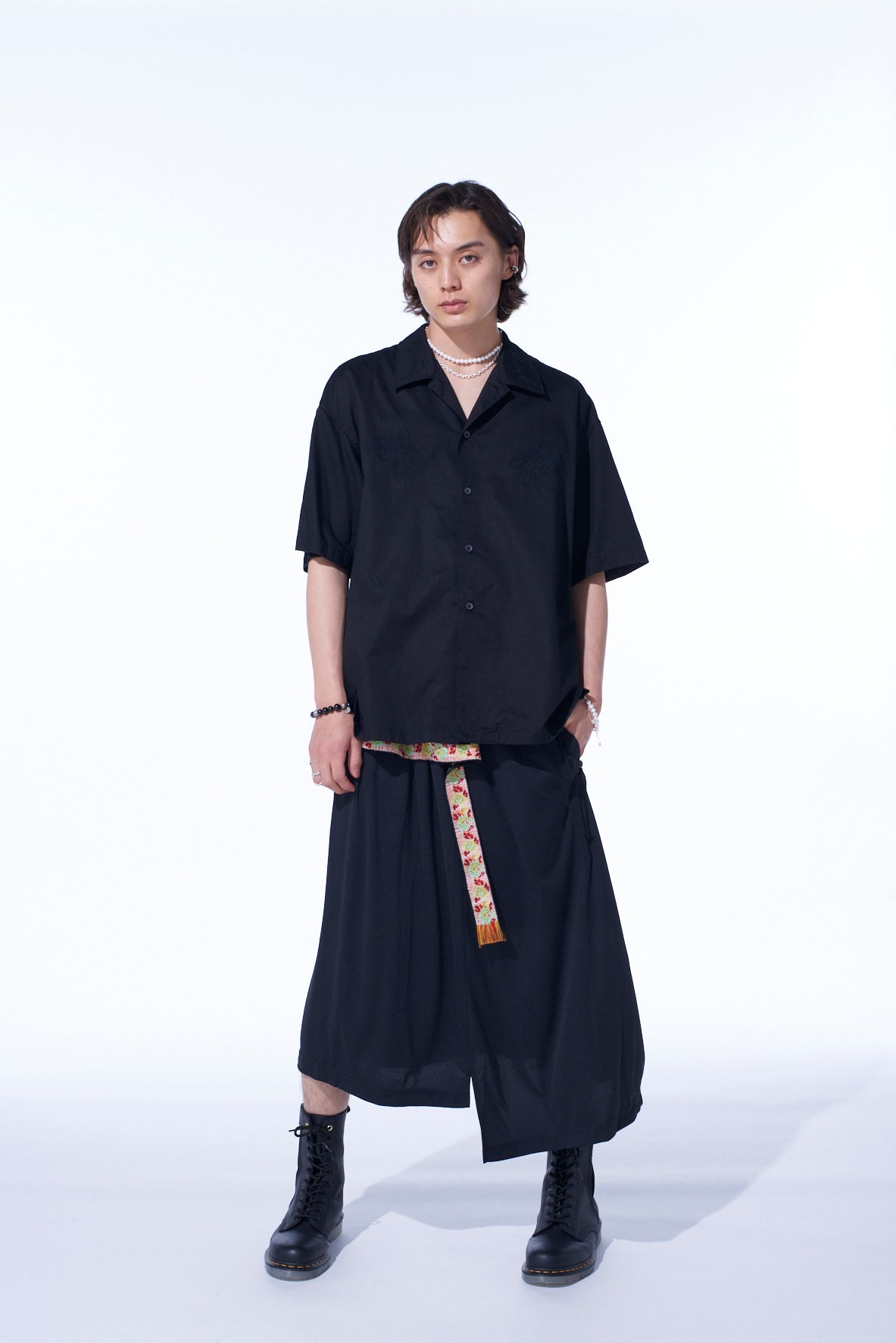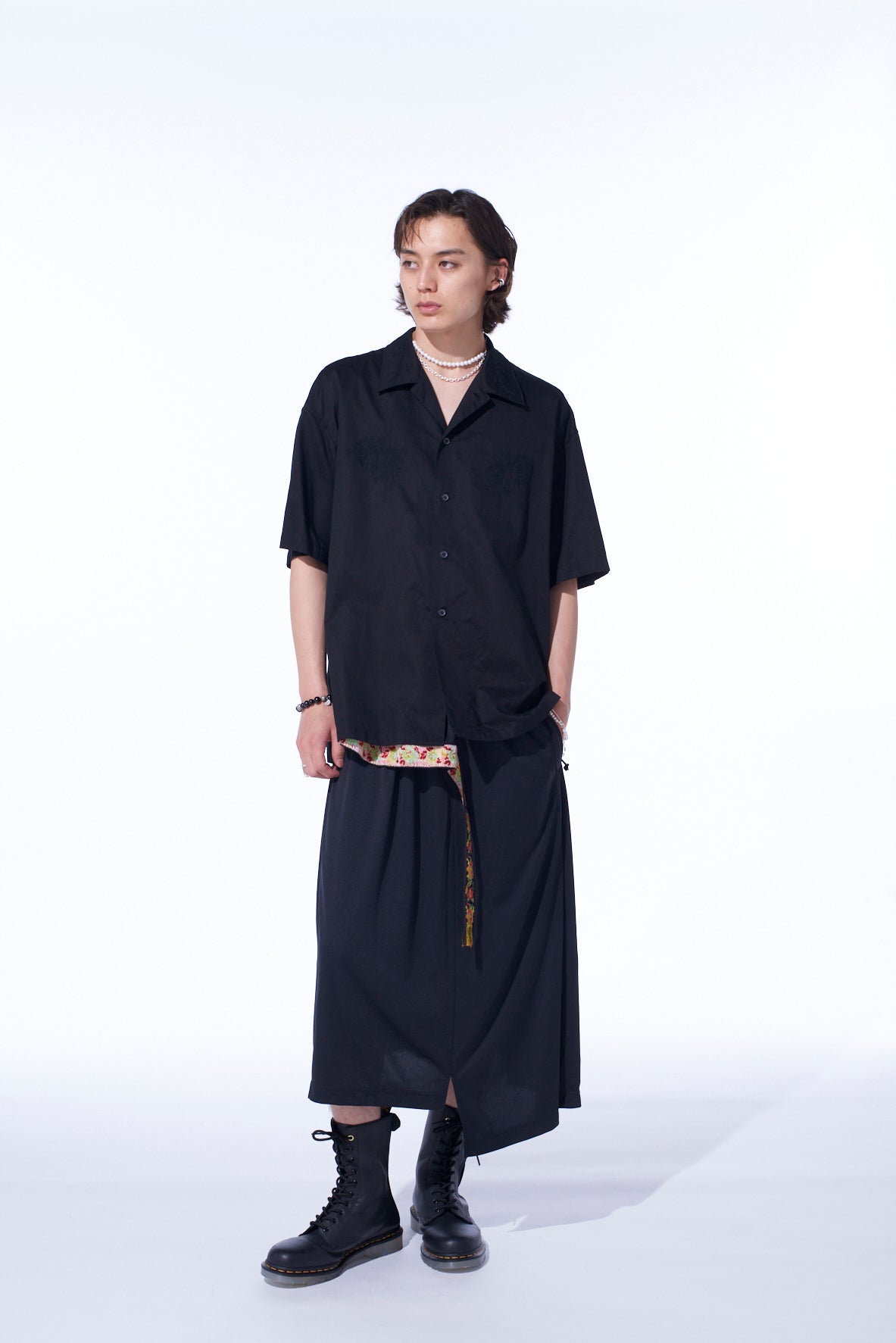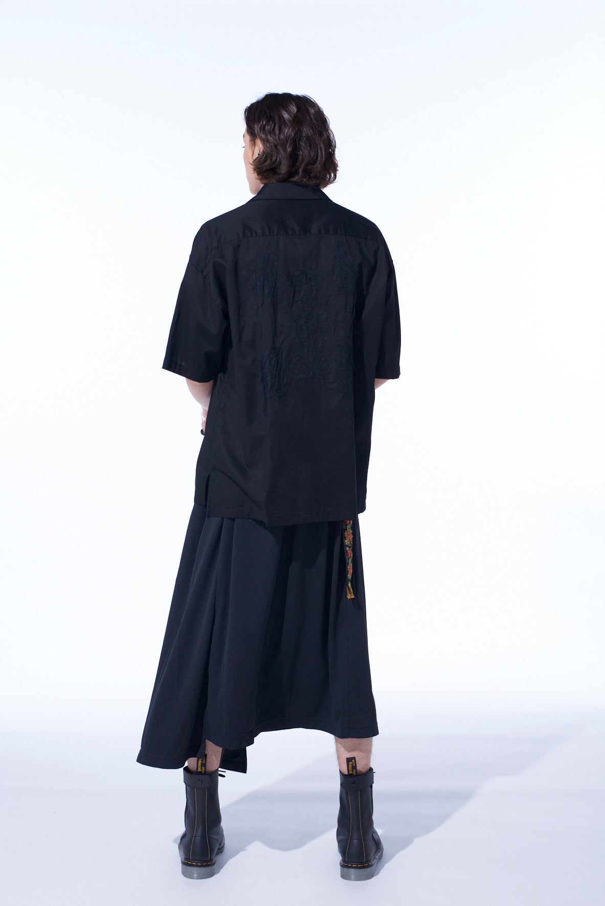 This gathered skirt features jersey fabric with an ethnic touch from partially used Tyrolean tape. The unisex waistband has an elastic and drawstring for easy adjustment, allowing you to change lengths as desired. The asymmetric hemline adds a distinctive accent, enhancing the beauty of fabric movement and silhouette.