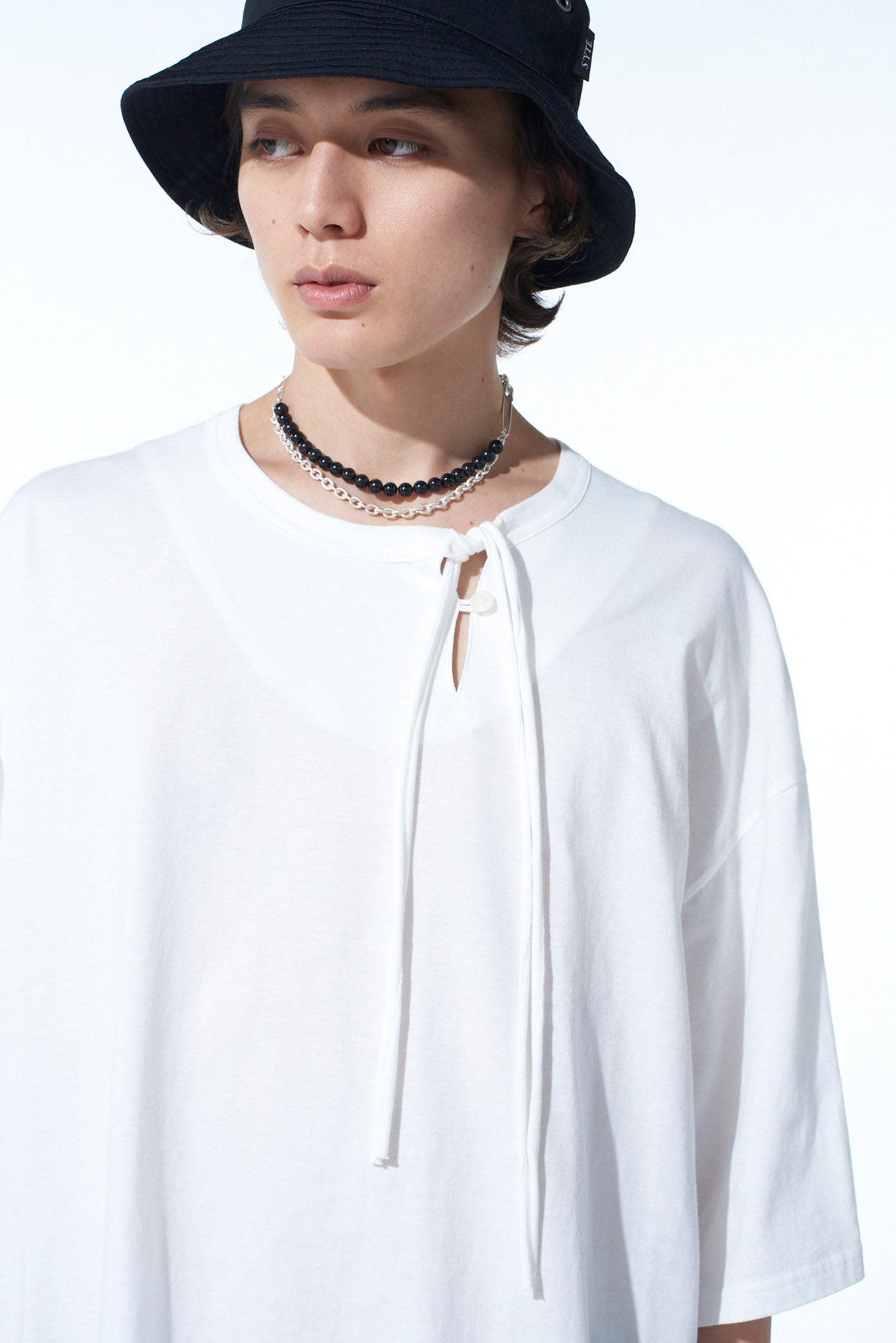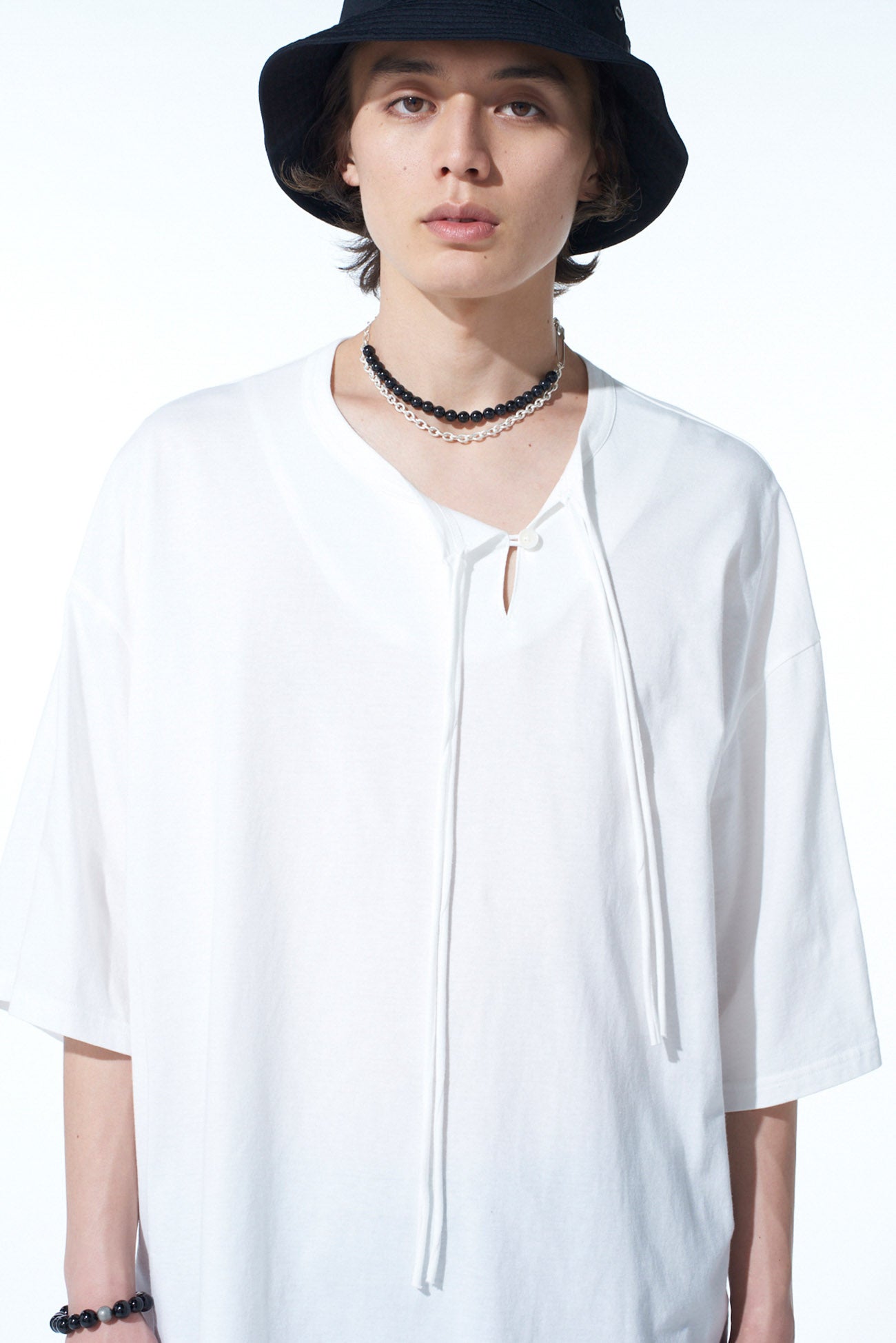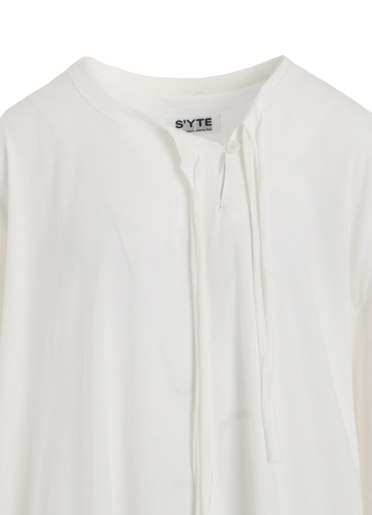 This asymmetric skippable top features a binder draped from the neckline, adding an accent to the collar. The loop closure lets you adjust the neckline's opening. The binder can also be tied for a new look. Made from soft plain stitch fabric, it’s durable and easy to care for daily wear.