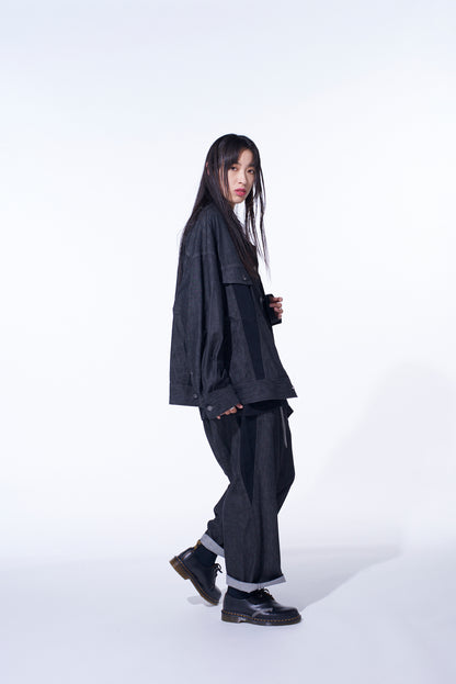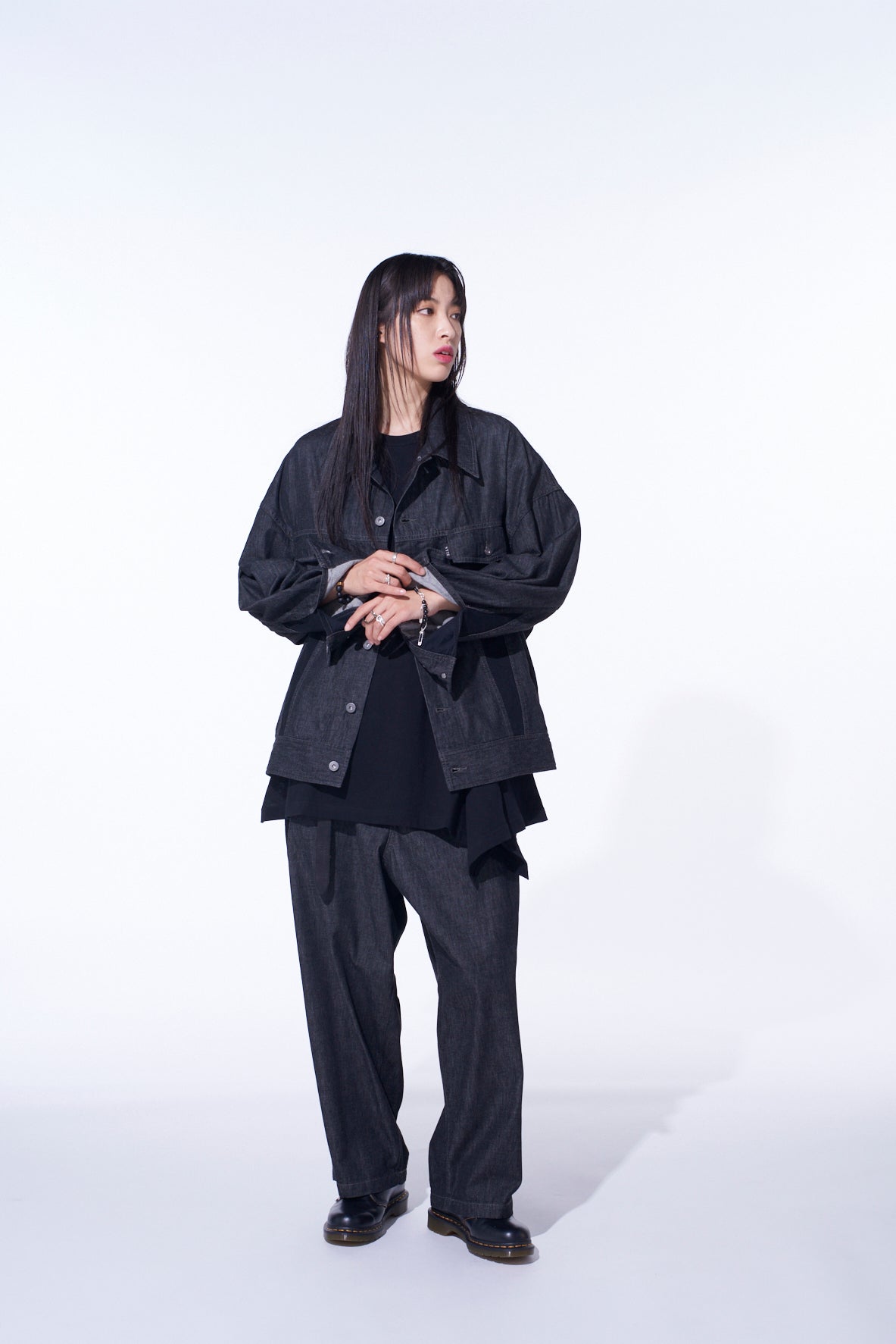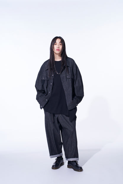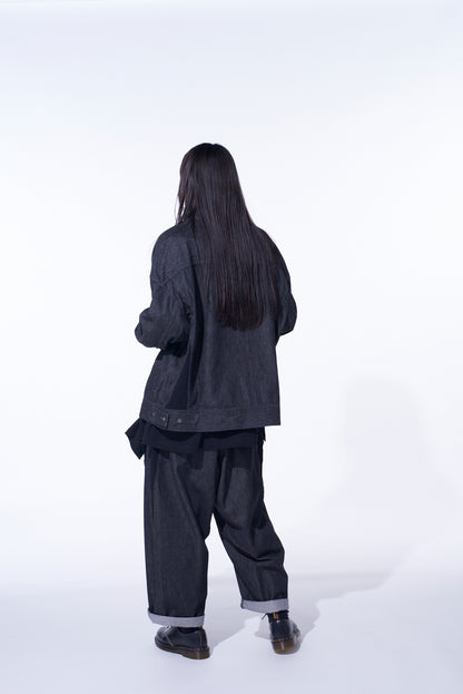 This oversized Trucker Jacket is crafted from 7oz denim from Fukuyama. Its lightweight feel and dropped shoulder style offer comfort, while a genderless design suits all body types. A two-tone combination allows for a unique color gradient over time, and it’s available in navy and black.