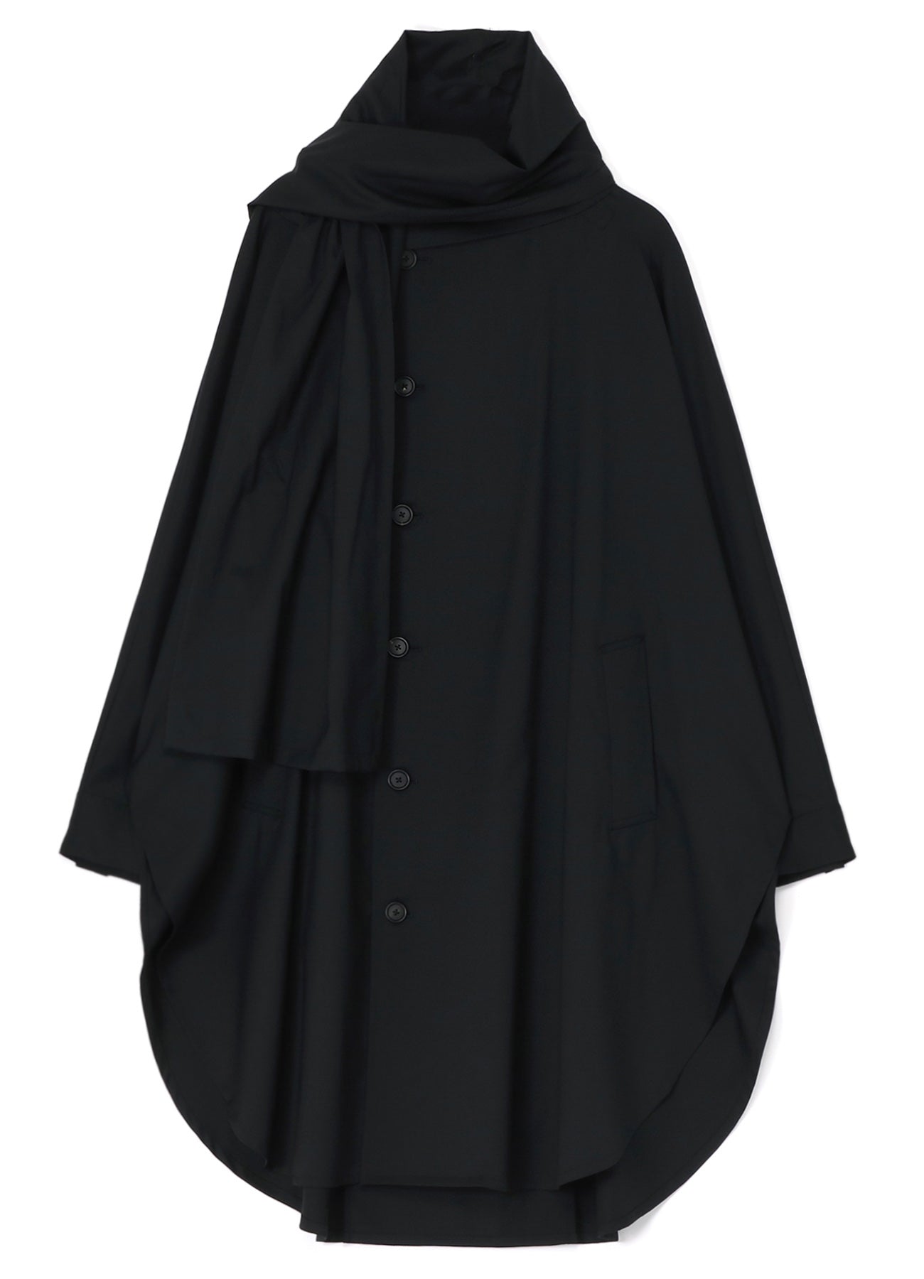 This coat, featuring a detachable buttoned stole, allows versatile styling with adjustable lengths and nuanced neck designs. The shirt cuff construction and integrated sleeve with a large body width provide a poncho-like wear. When the stole is removed, it transforms into a sleek, no-collar coat suitable for various wraps and accessories. Made from gabardine fabric, its silhouette is defined by rich drapery and ease of maintenance.