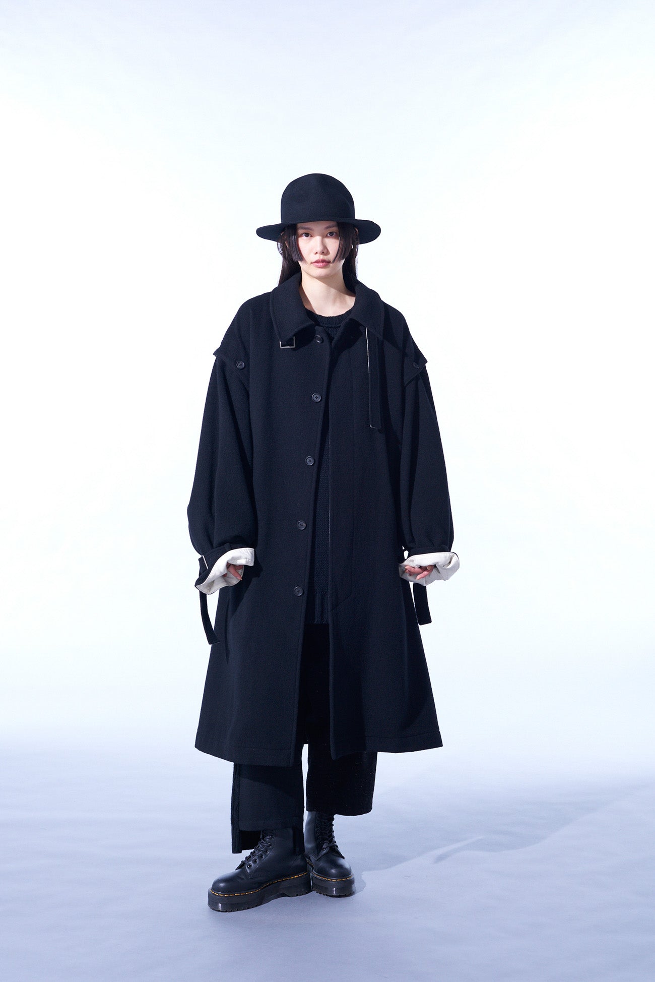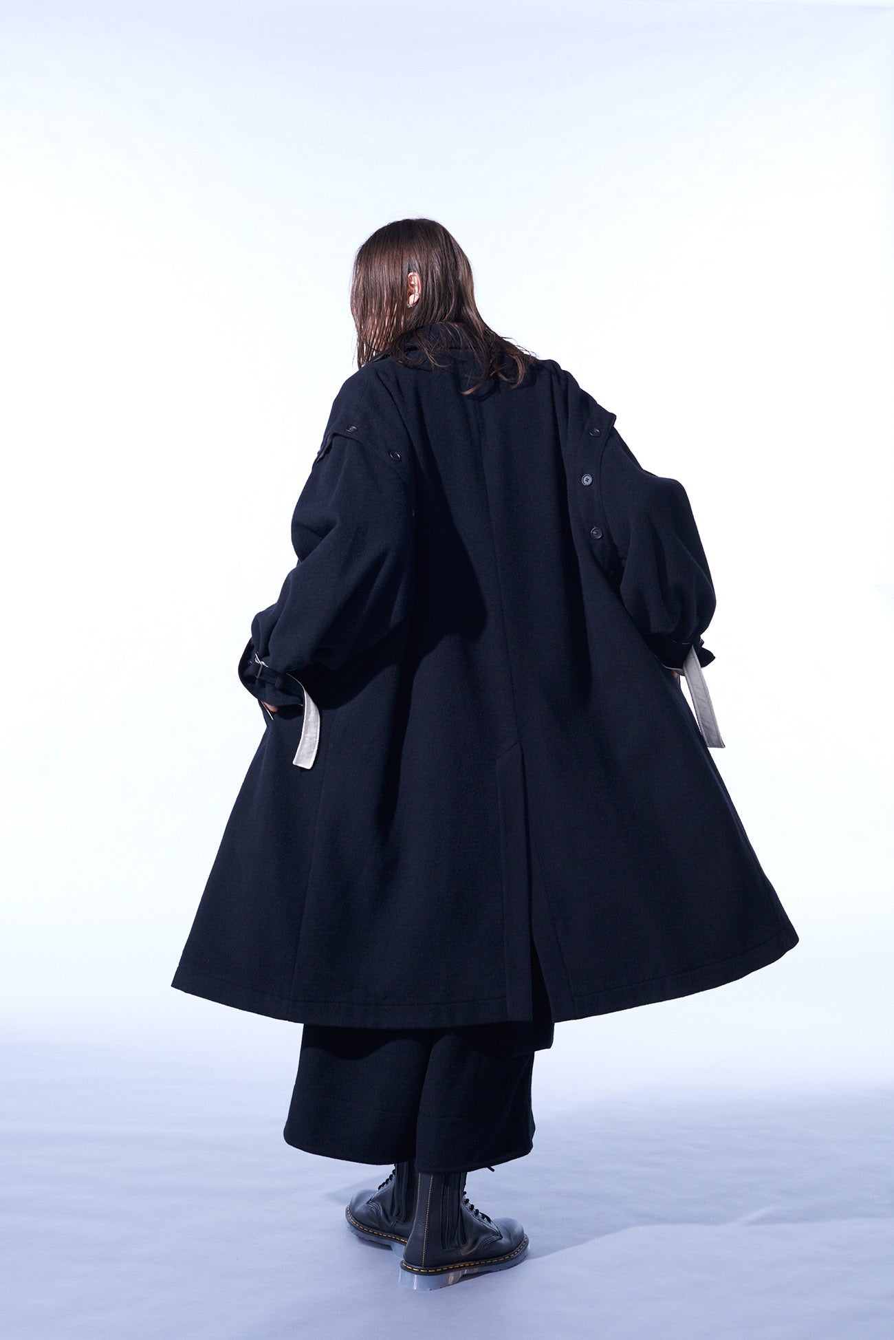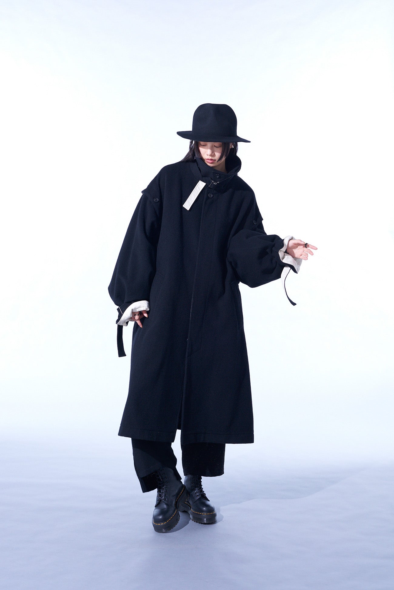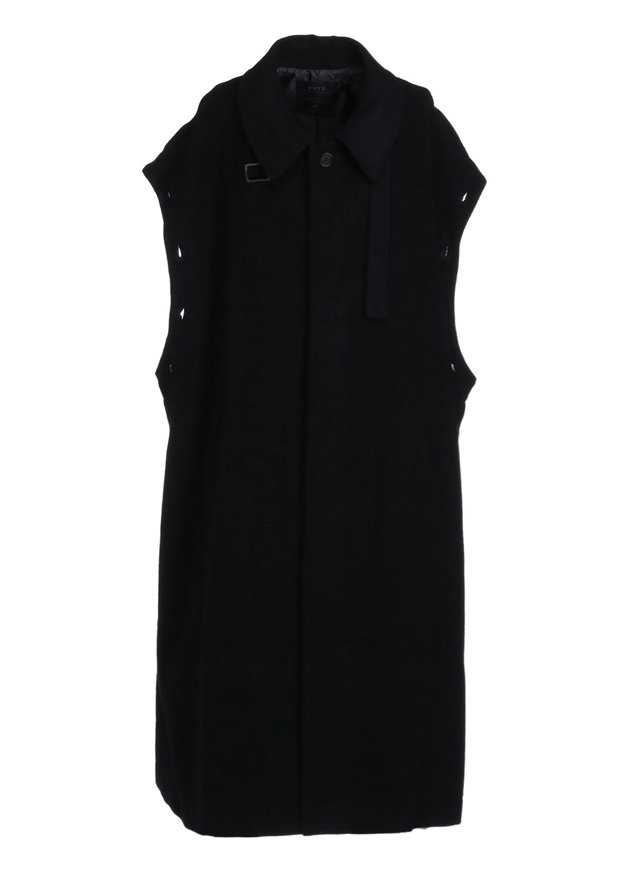 This soft-textured and warm mosser fabric long coat features a covered fly placket. Notable details include a neck strap and undyed fabric used as accents. Convert it with detachable sleeves, showcasing deconstructed styles or sleeveless options. Coordinate with matching pants or monochrome inners for a versatile look.