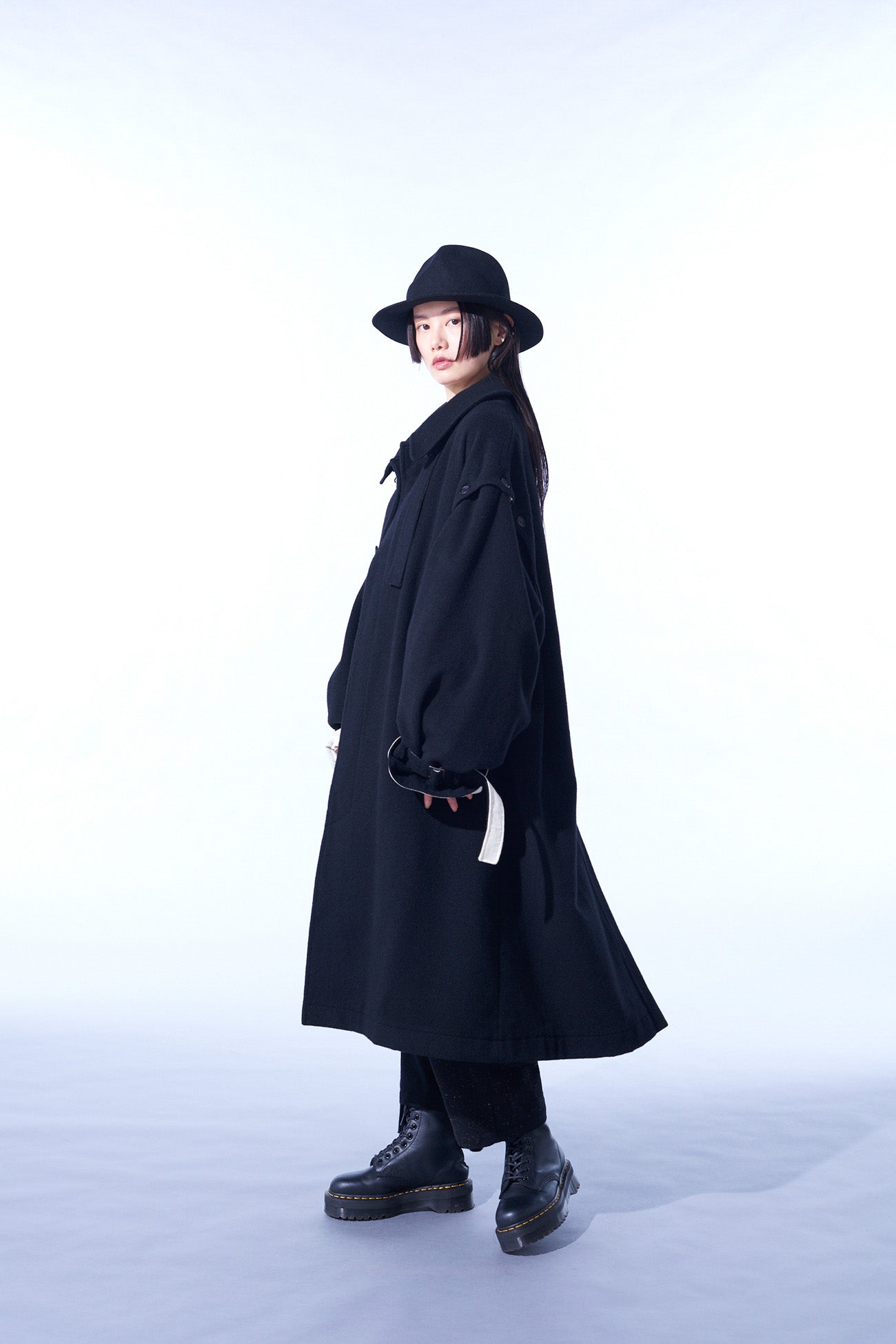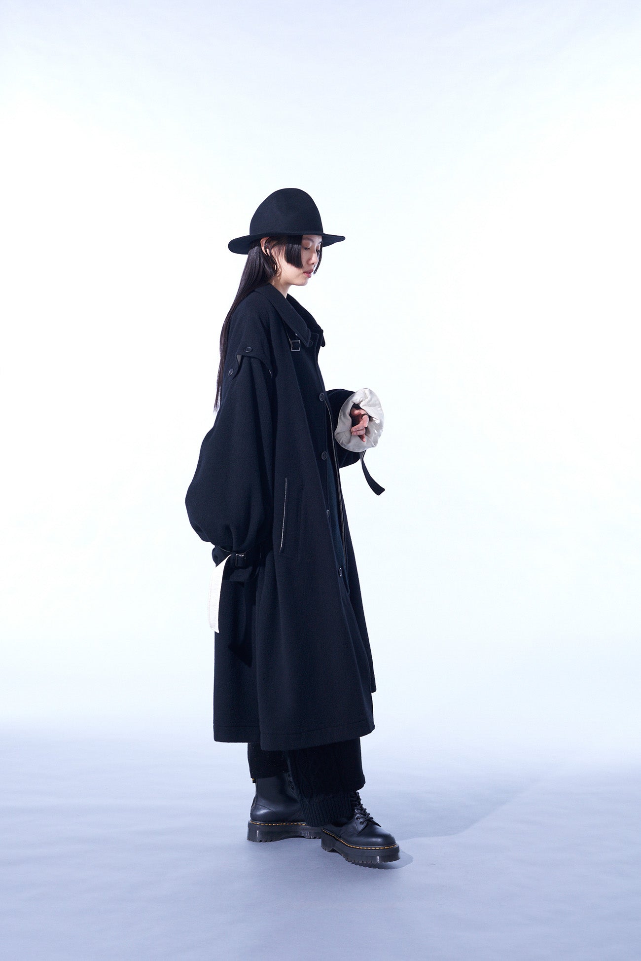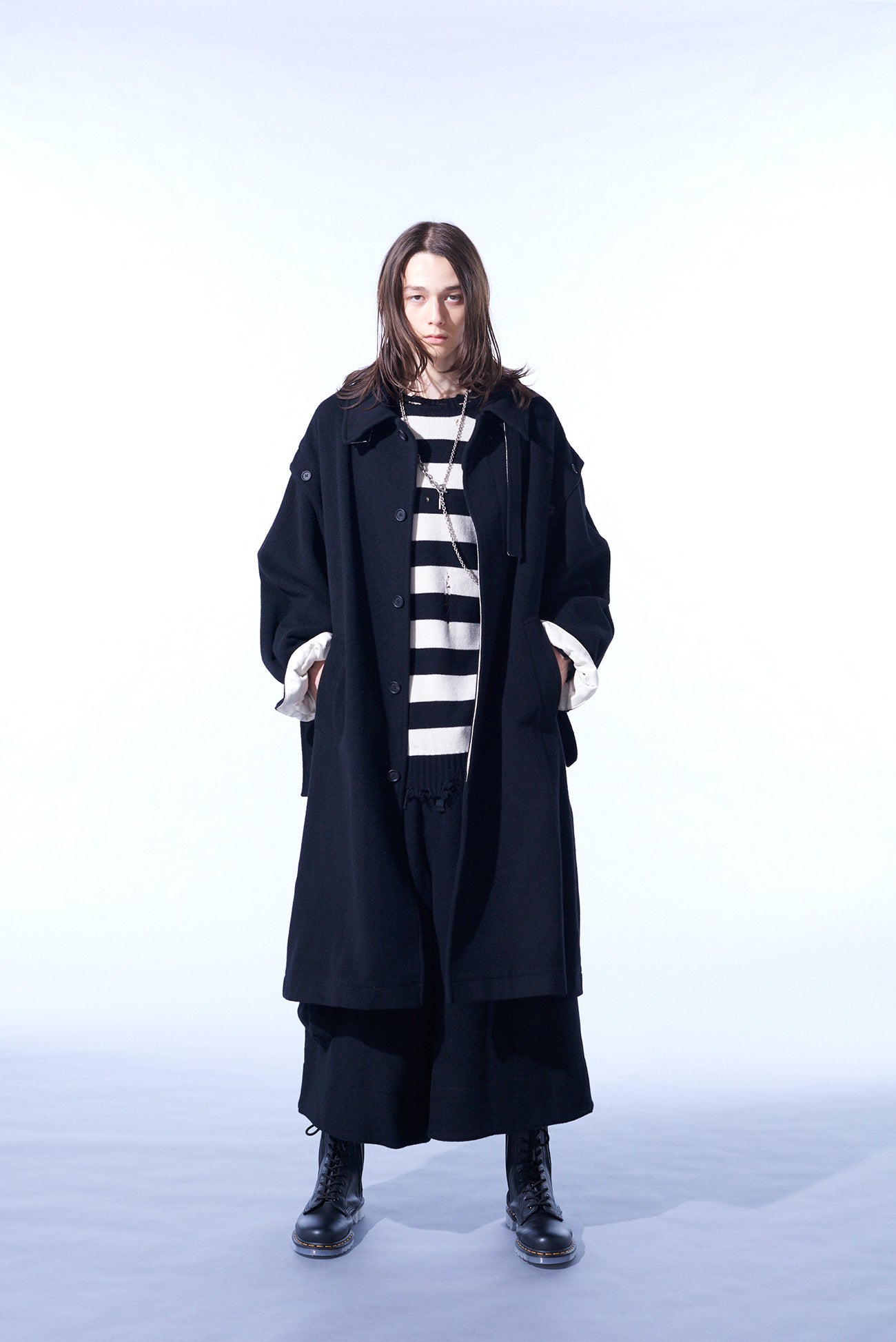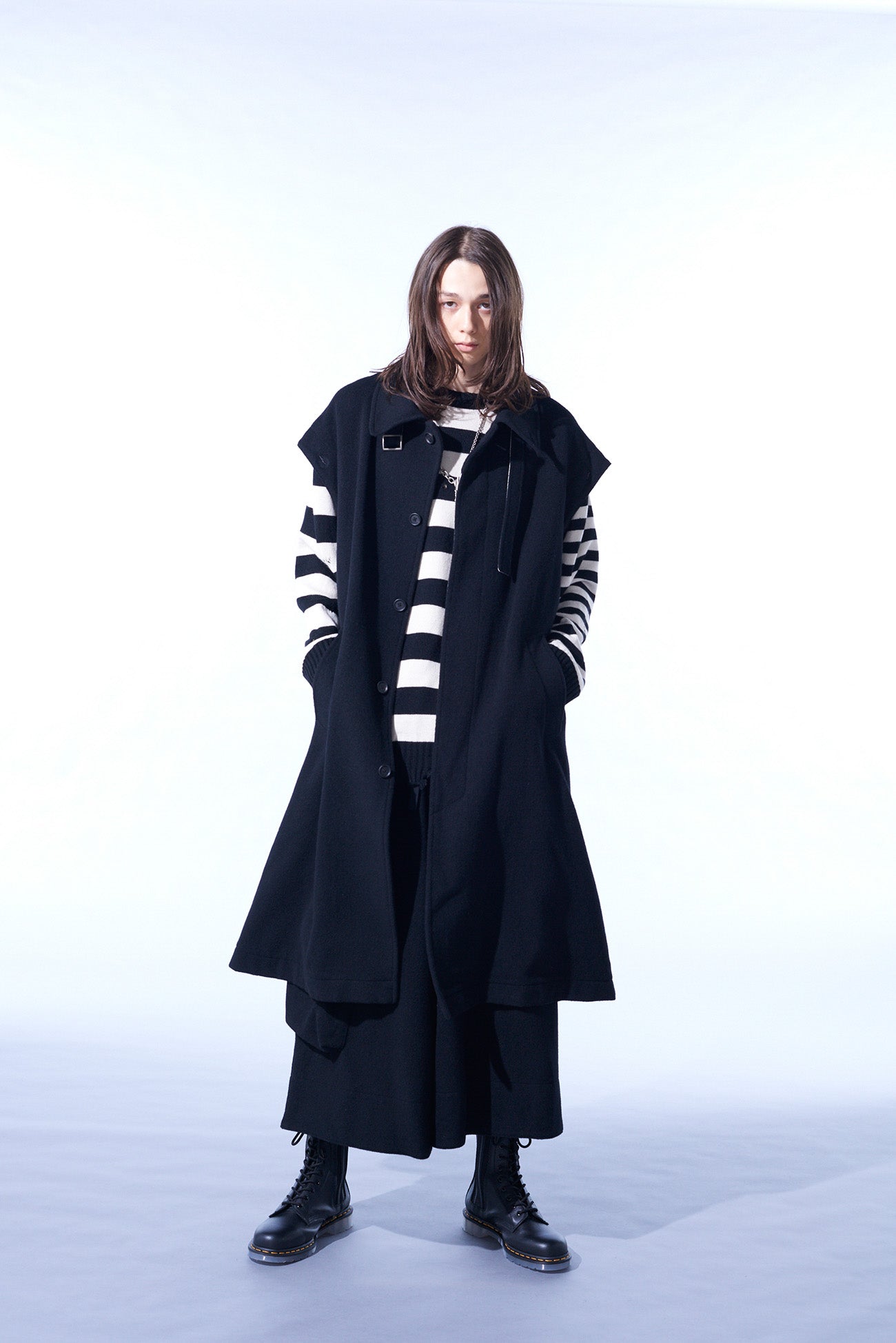This soft-textured and warm mosser fabric long coat features a covered fly placket. Notable details include a neck strap and undyed fabric used as accents. Convert it with detachable sleeves, showcasing deconstructed styles or sleeveless options. Coordinate with matching pants or monochrome inners for a versatile look.