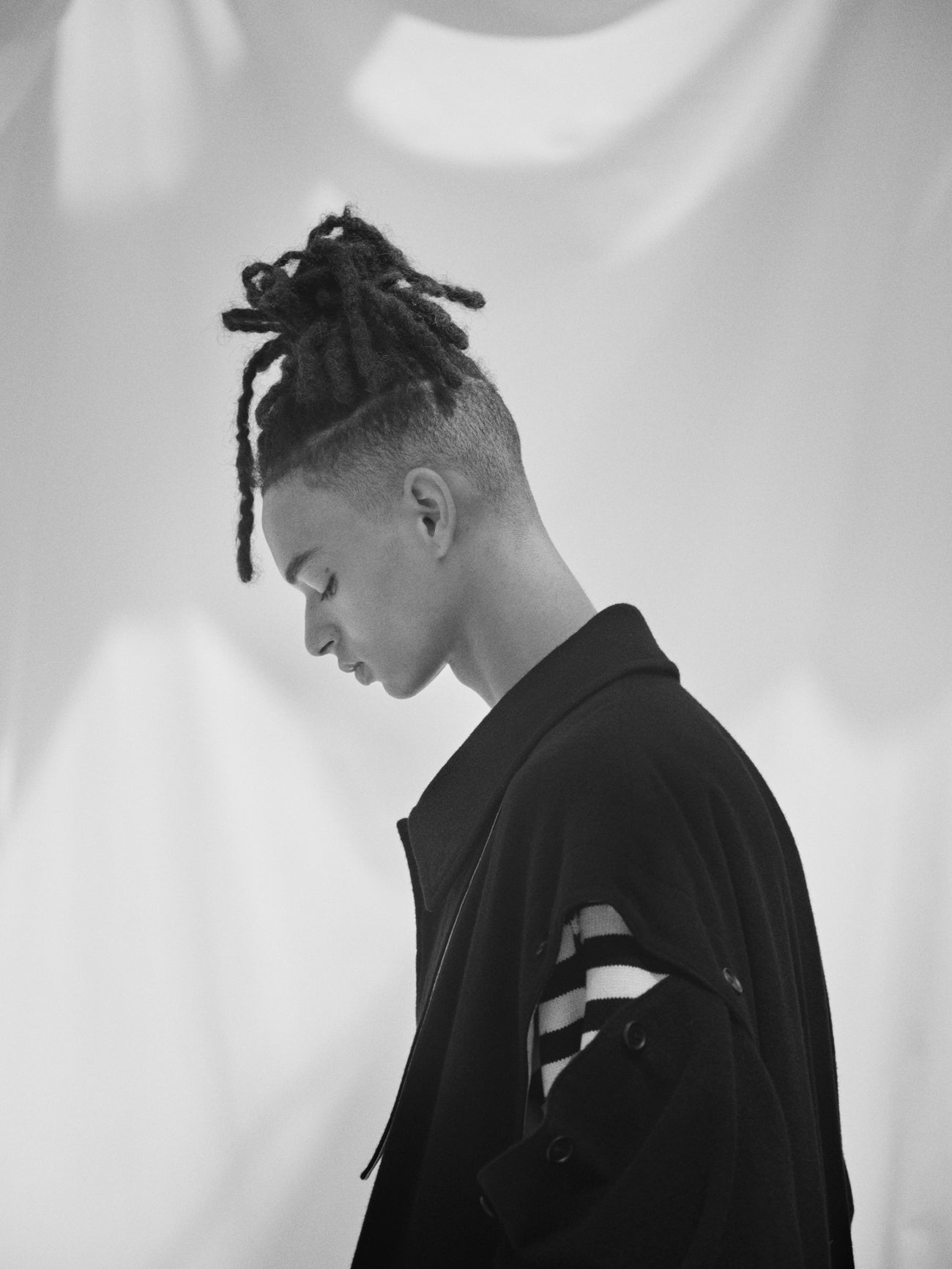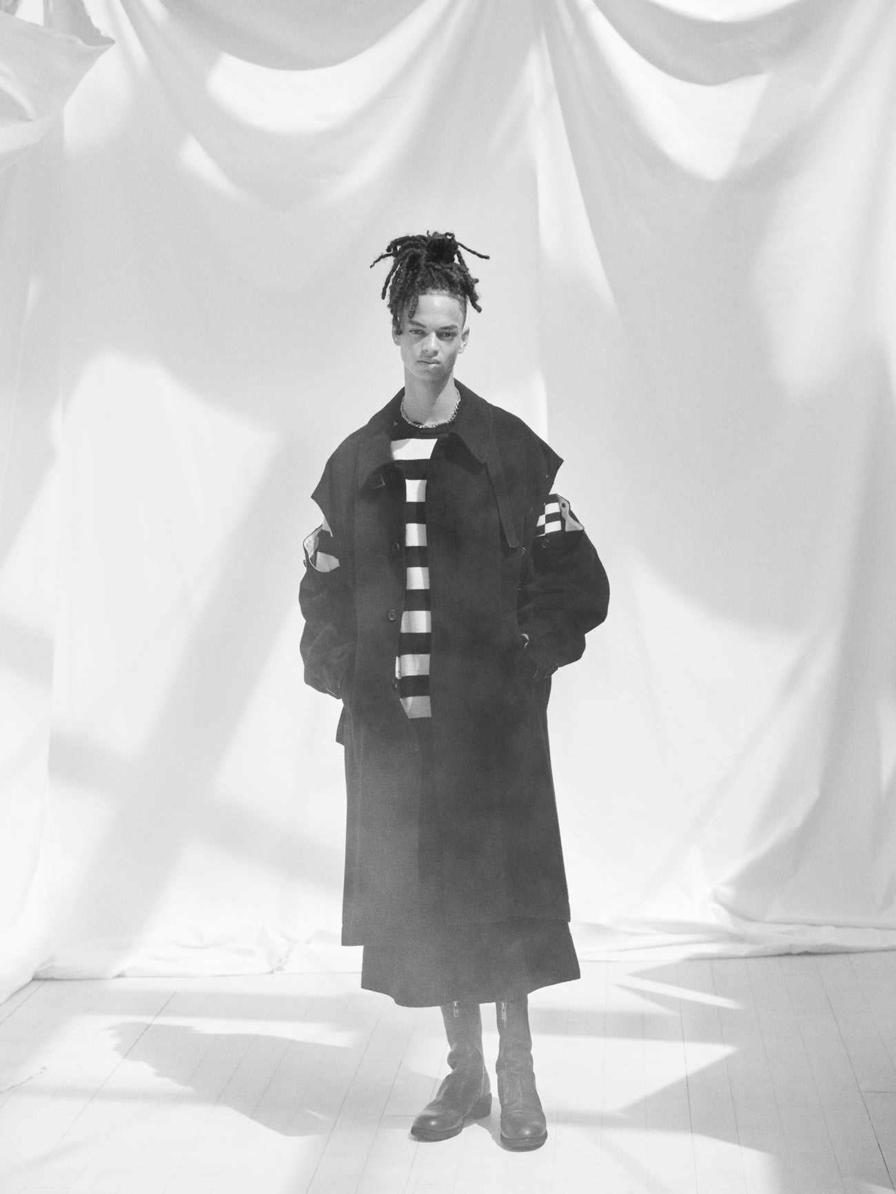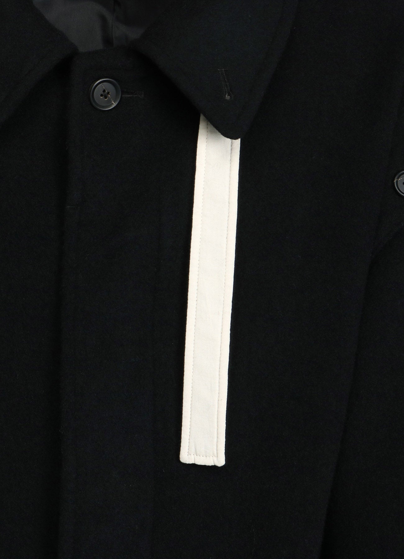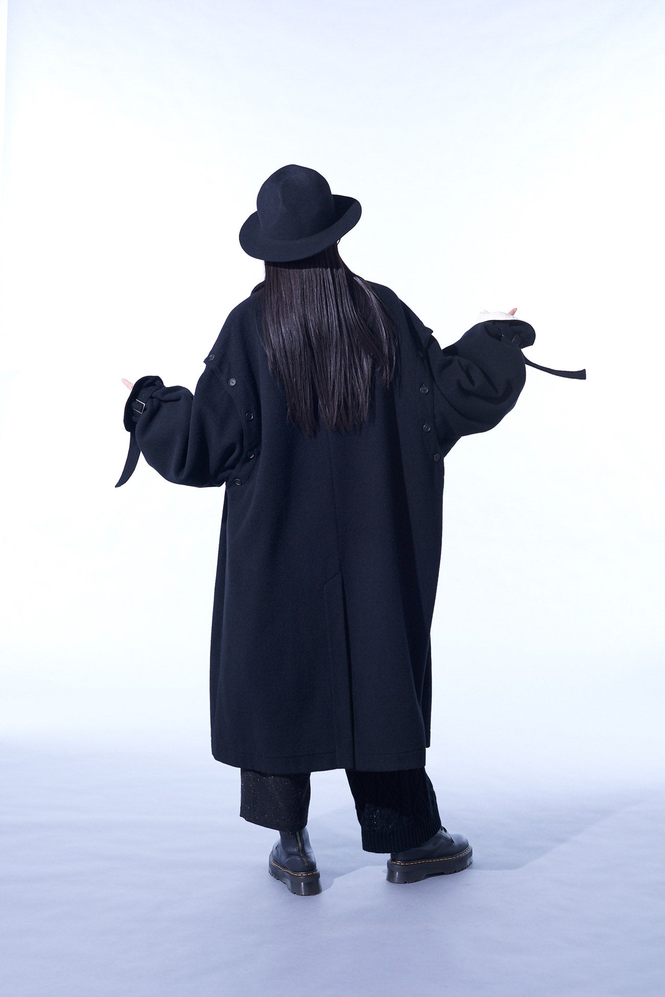 This soft-textured and warm mosser fabric long coat features a covered fly placket. Notable details include a neck strap and undyed fabric used as accents. Convert it with detachable sleeves, showcasing deconstructed styles or sleeveless options. Coordinate with matching pants or monochrome inners for a versatile look.