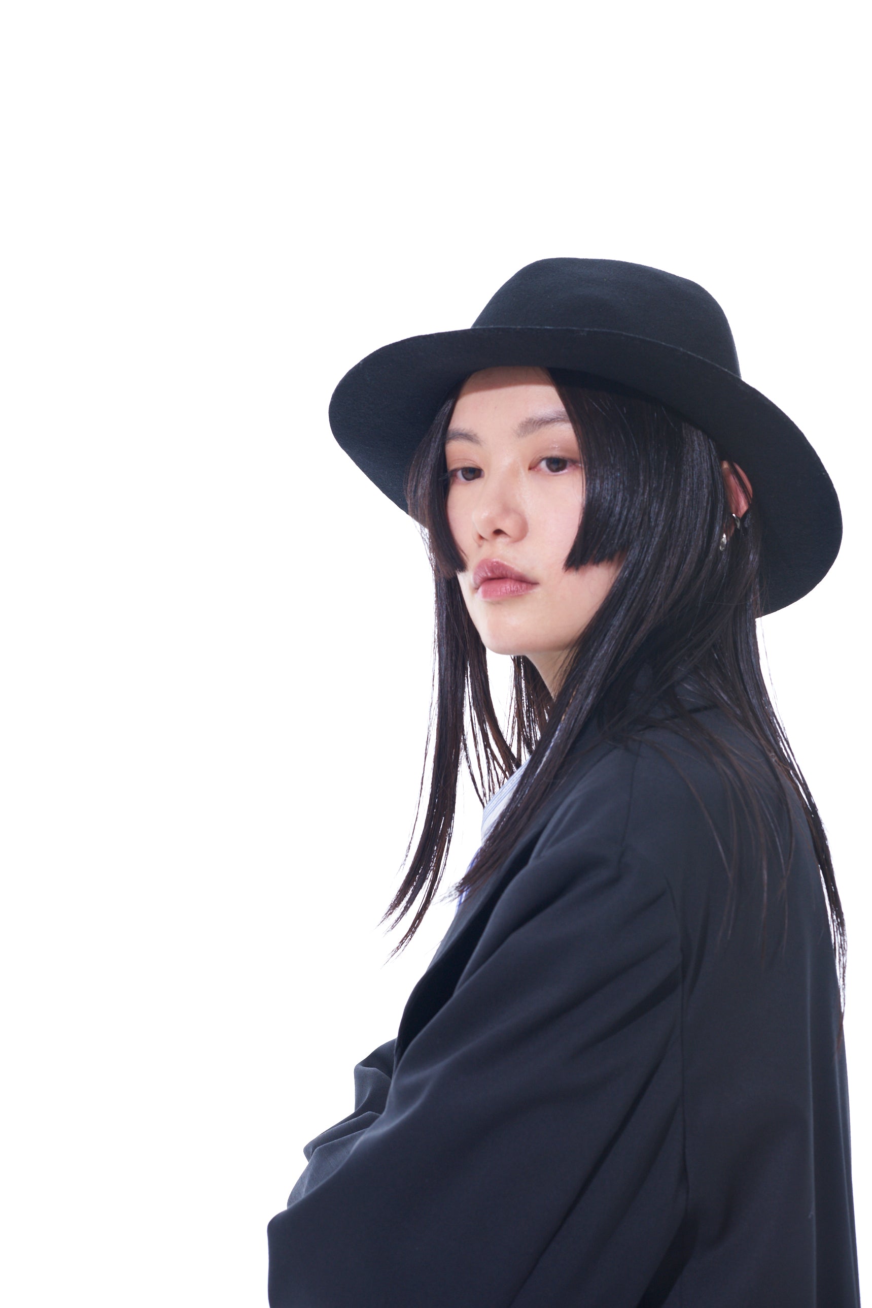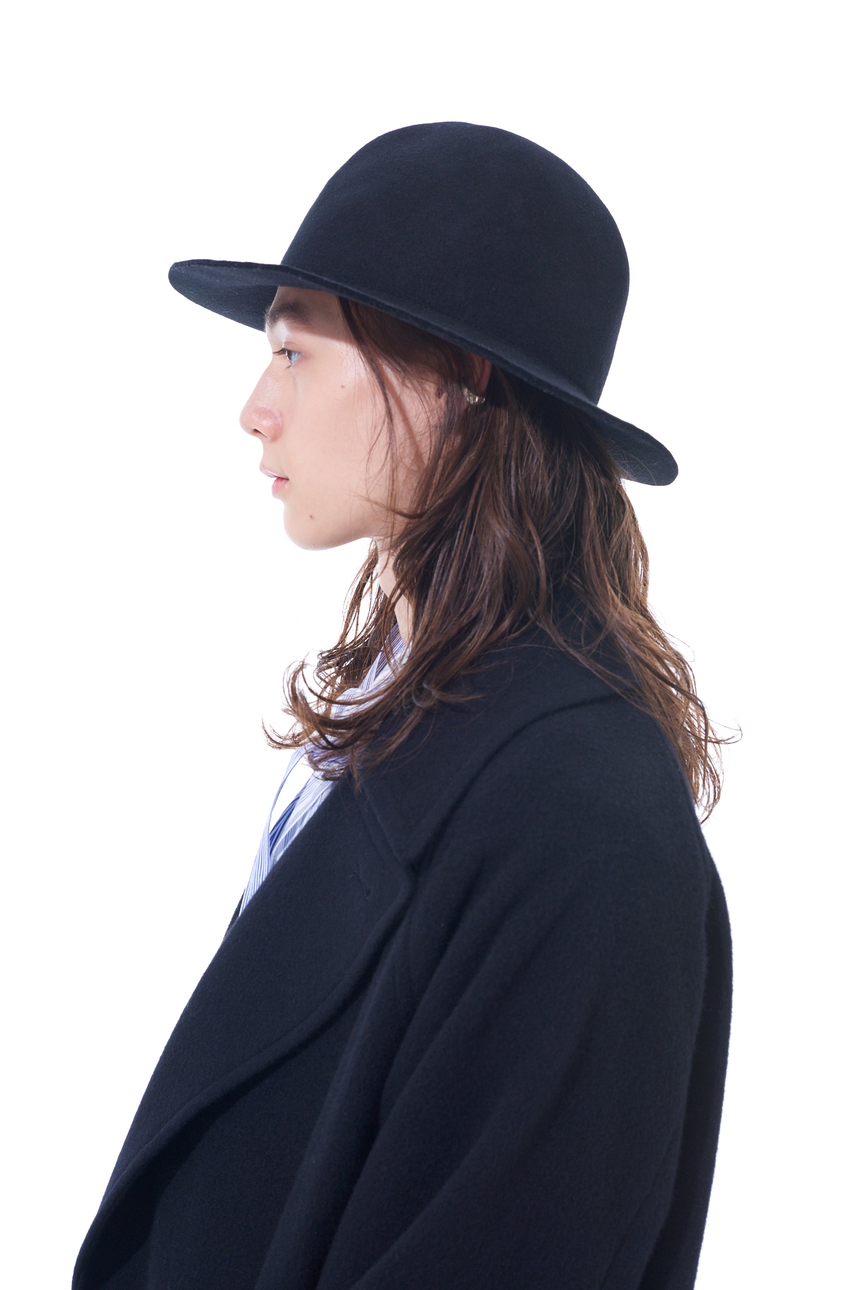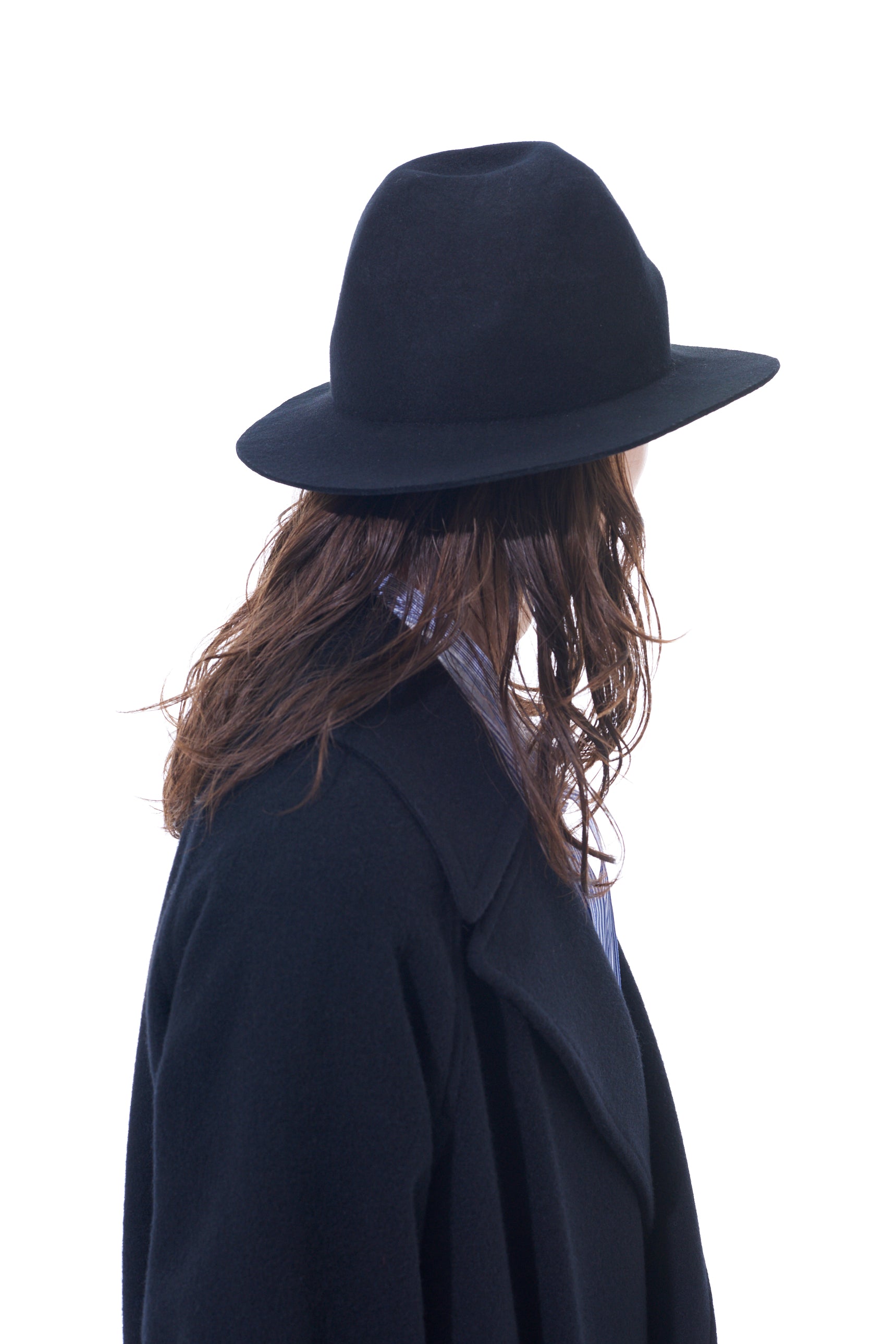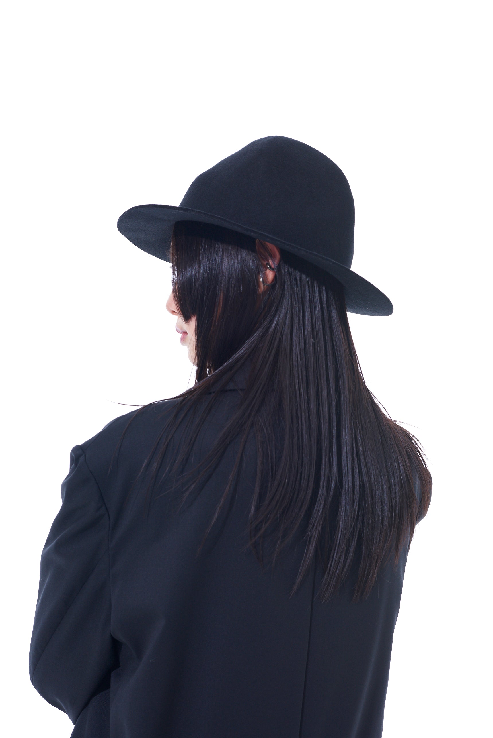 A thick wool felt hat with a rugged, mountain-like shape that changes silhouette based on the viewing angle. It balances height and brim length, complements punk and modern styles, and is perfect for daily use. The hat features an adjustable inner string for a genderless, one-size-fits-all fit.