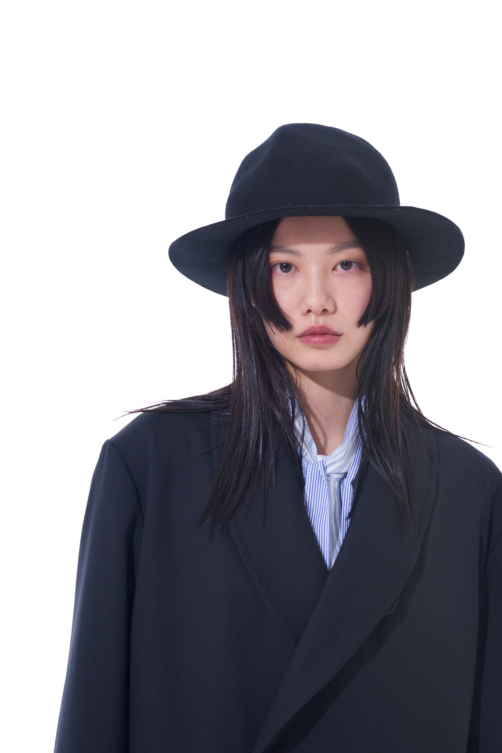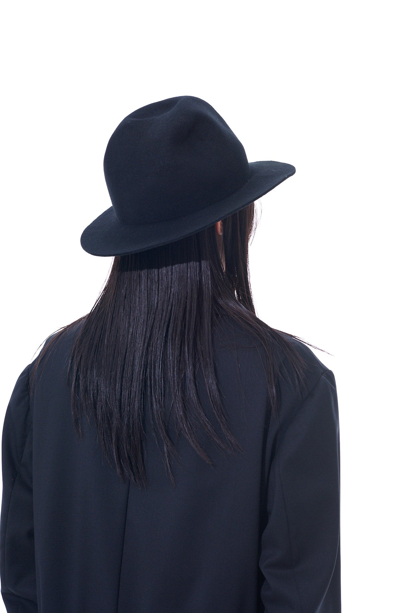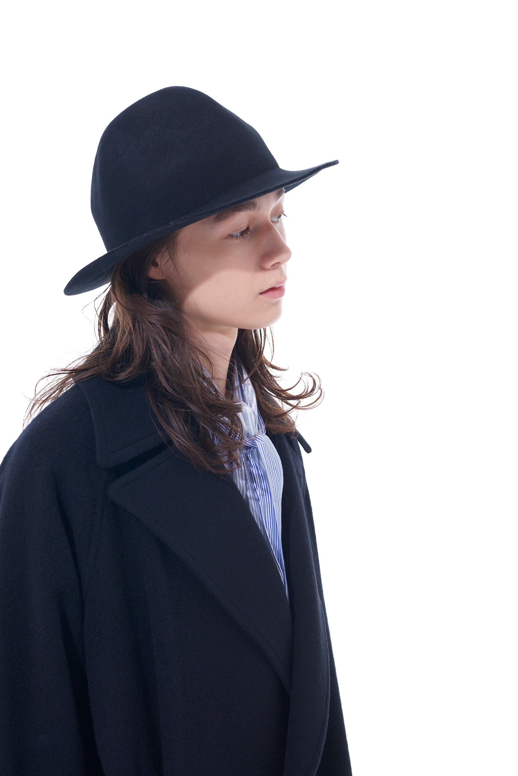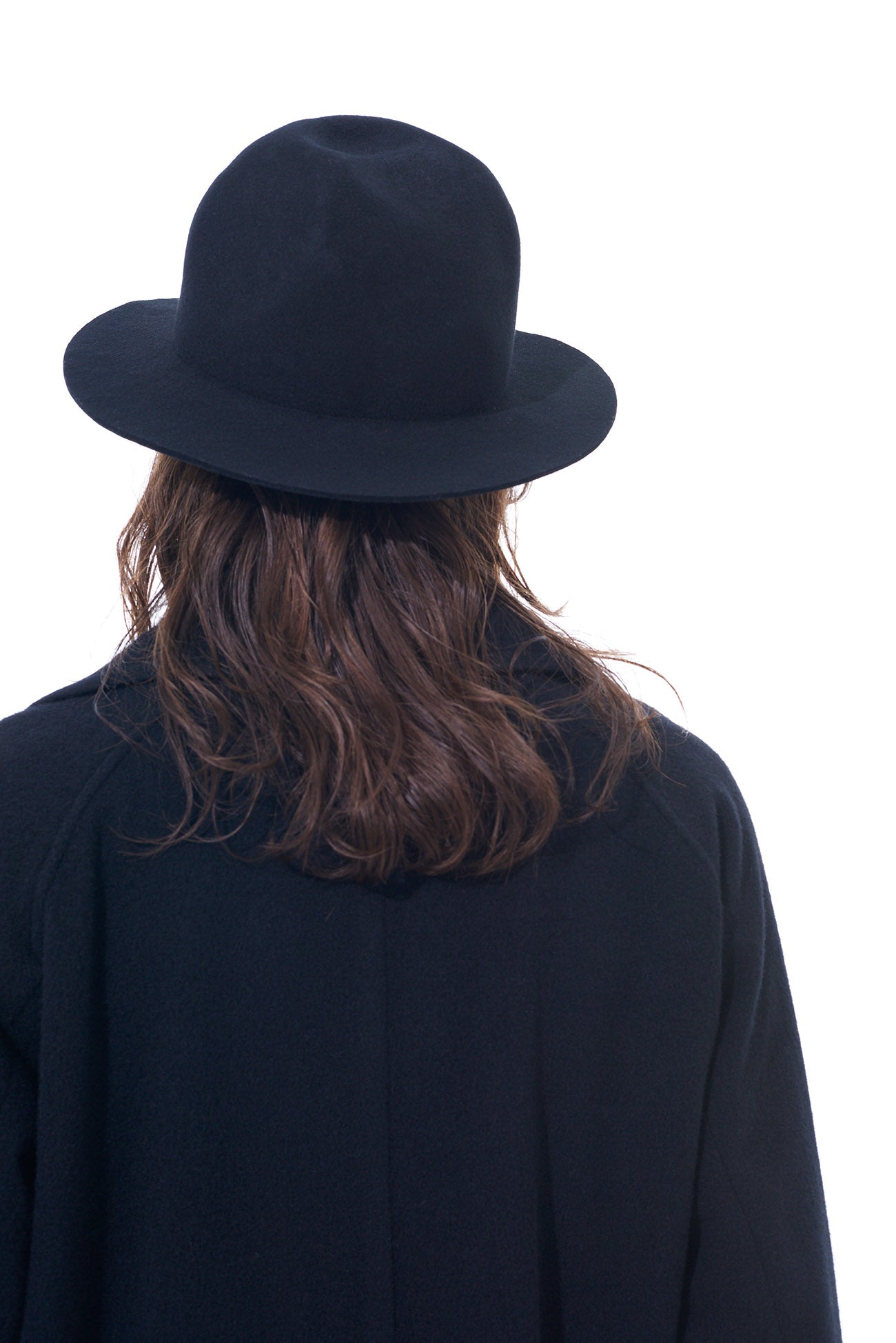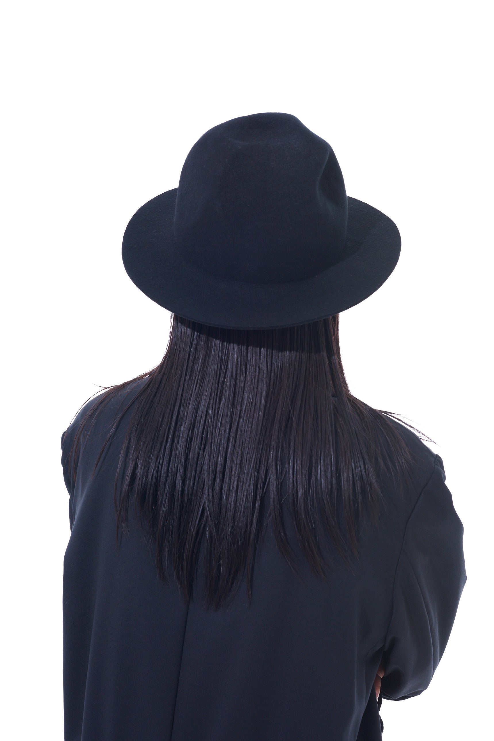 A thick wool felt hat with a rugged, mountain-like shape that changes silhouette based on the viewing angle. It balances height and brim length, complements punk and modern styles, and is perfect for daily use. The hat features an adjustable inner string for a genderless, one-size-fits-all fit.