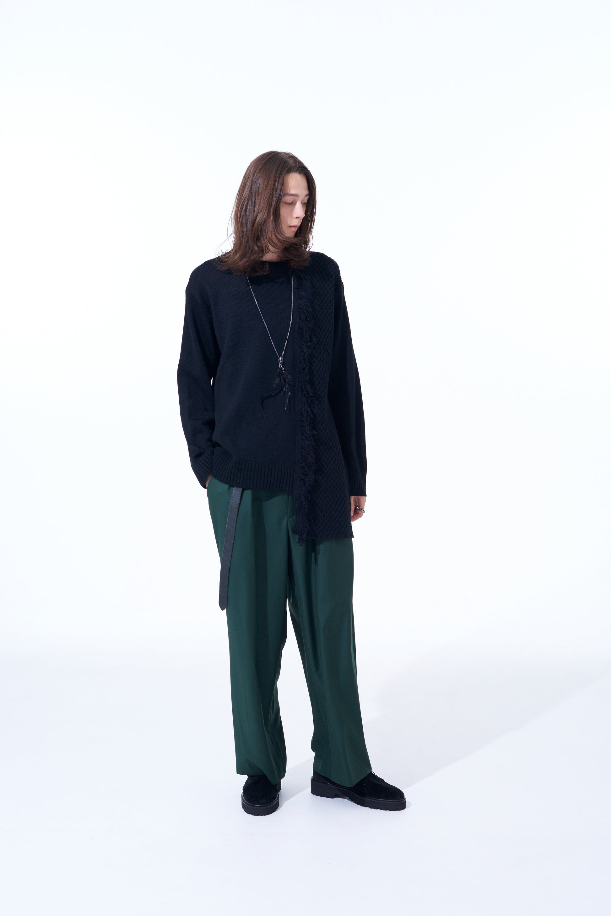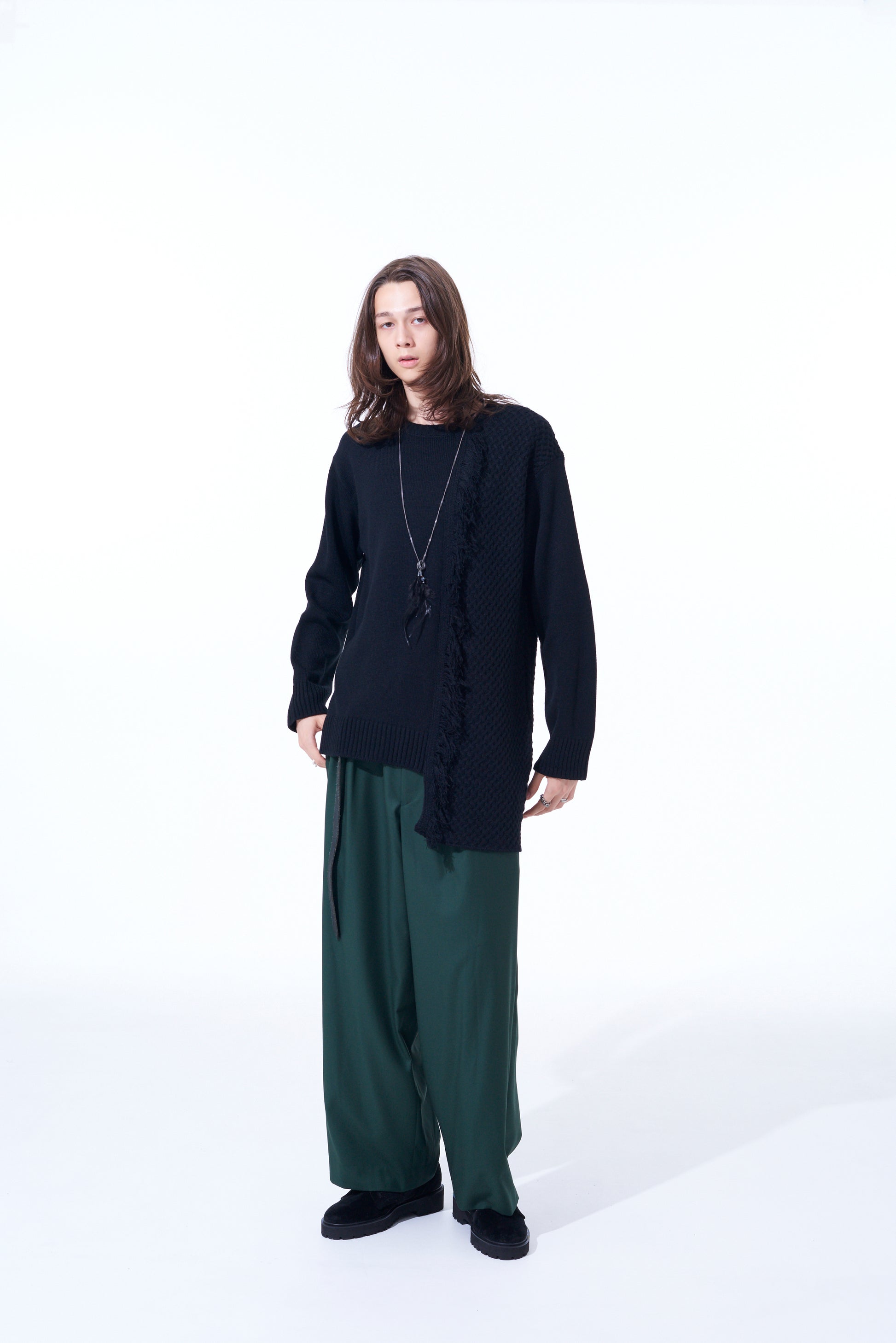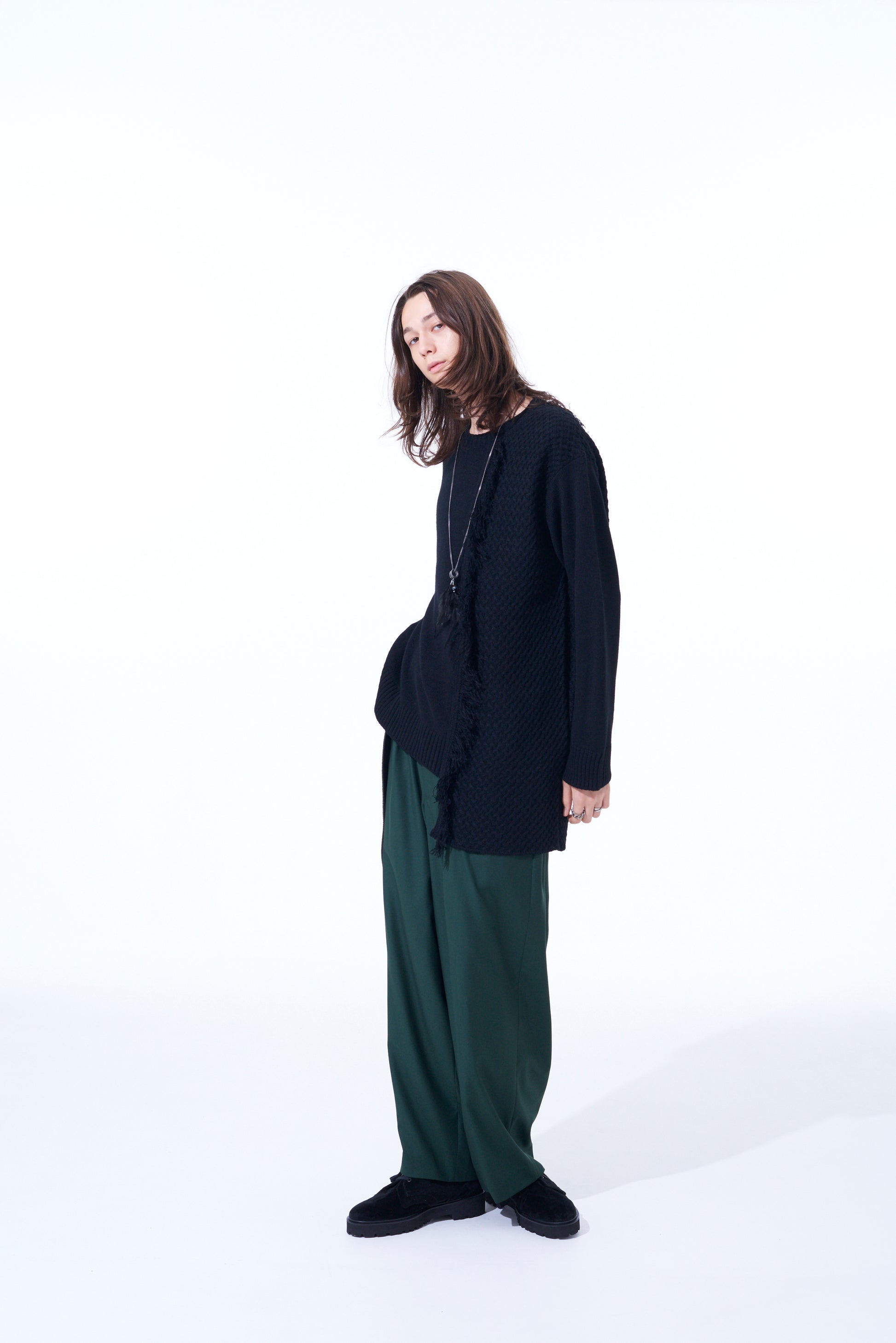 This pullover knit combines depth-rich jacquard knitting with fringe details to create a unique transforming design. Featuring intentional damage processing for a rag-like look, it also has ethnic fringe details. The asymmetric design with neck damage details is perfect for layering with shirts or high-neck tops. Available in charcoal and classic black.
