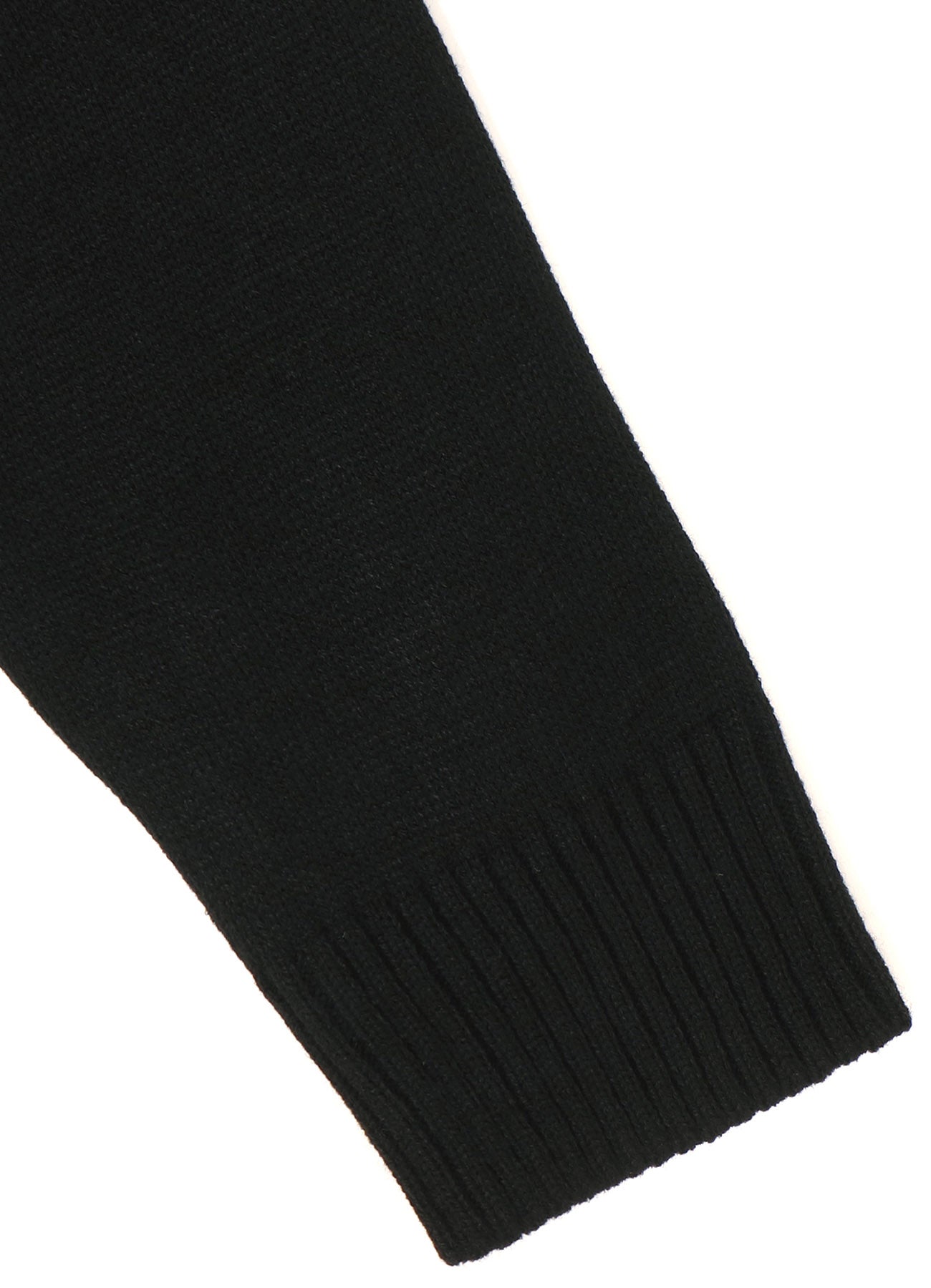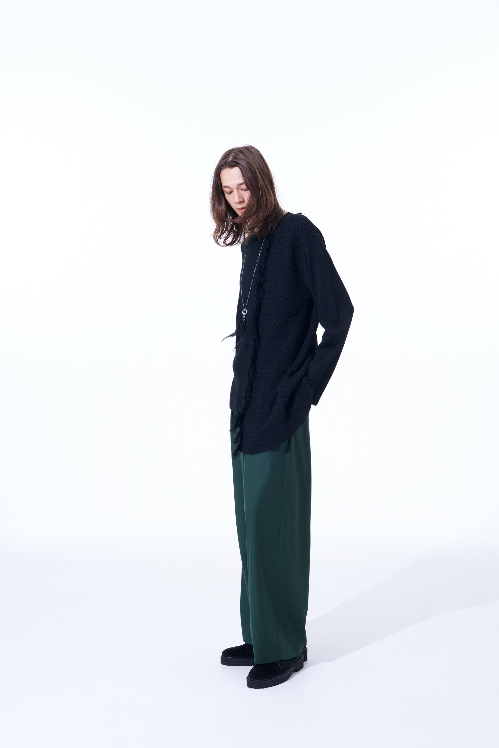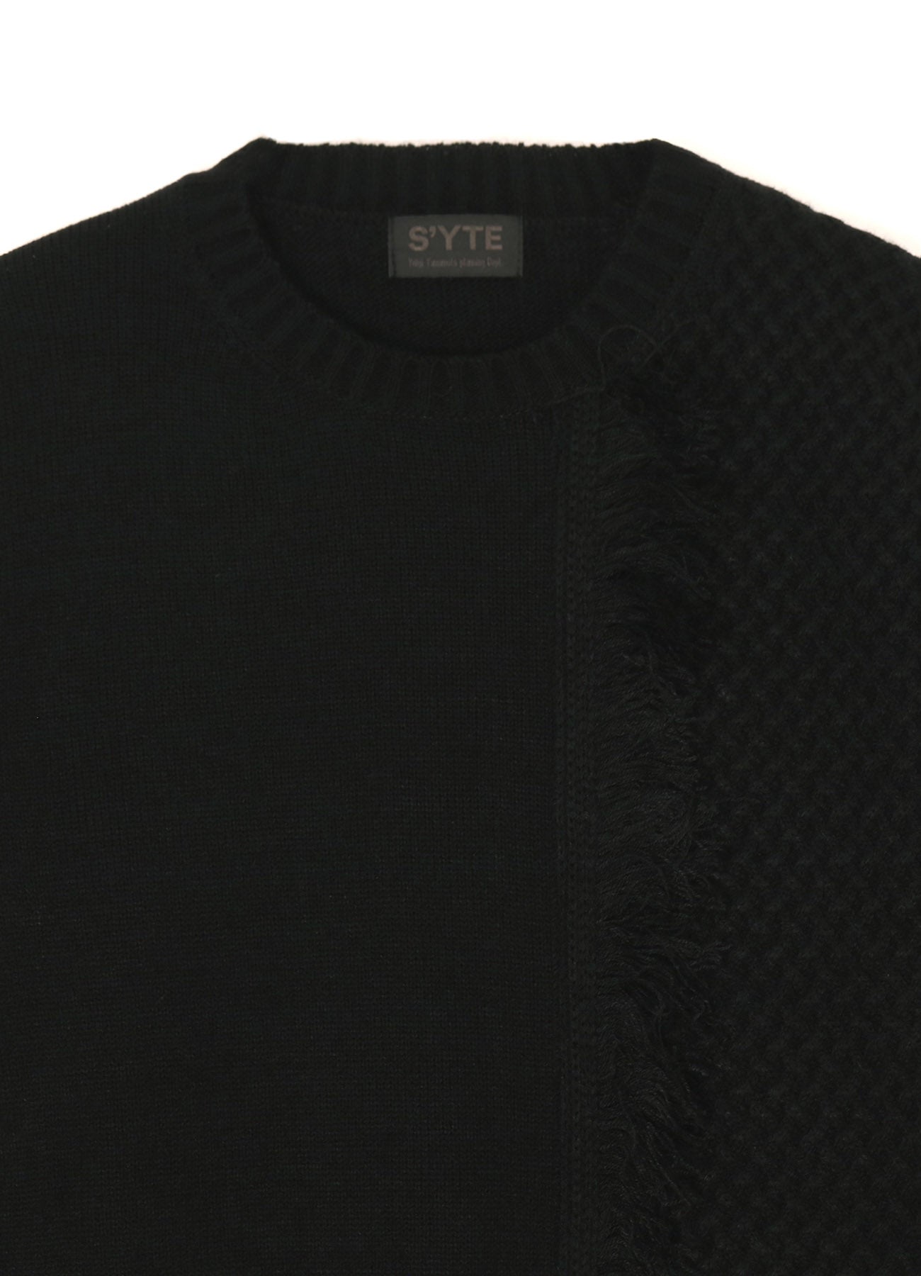 This pullover knit combines depth-rich jacquard knitting with fringe details to create a unique transforming design. Featuring intentional damage processing for a rag-like look, it also has ethnic fringe details. The asymmetric design with neck damage details is perfect for layering with shirts or high-neck tops. Available in charcoal and classic black.