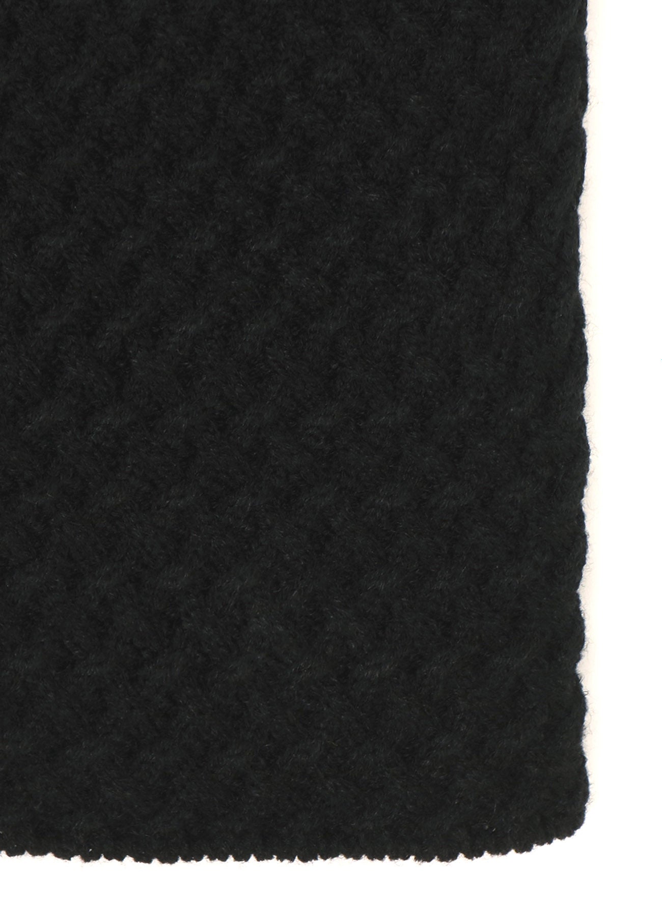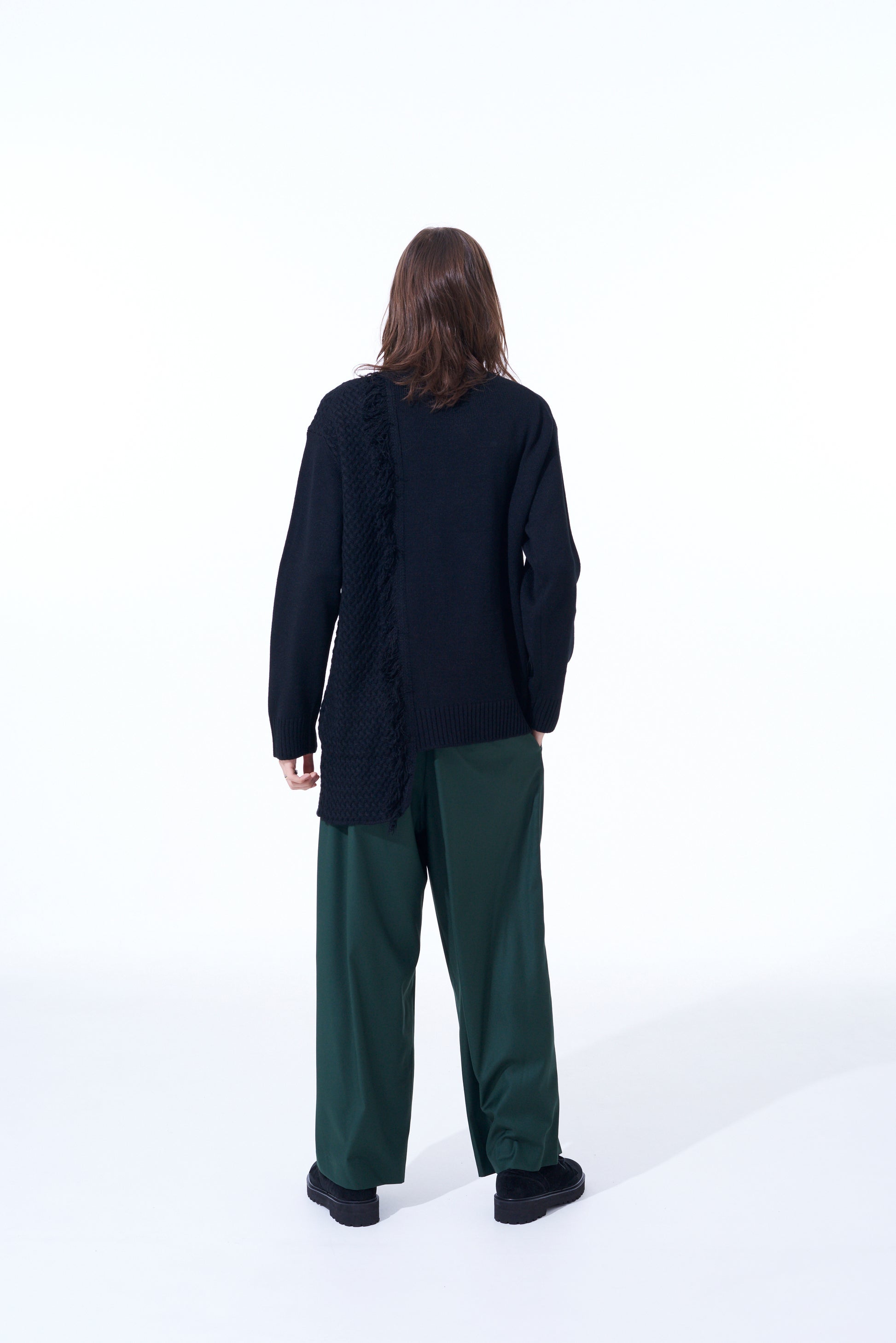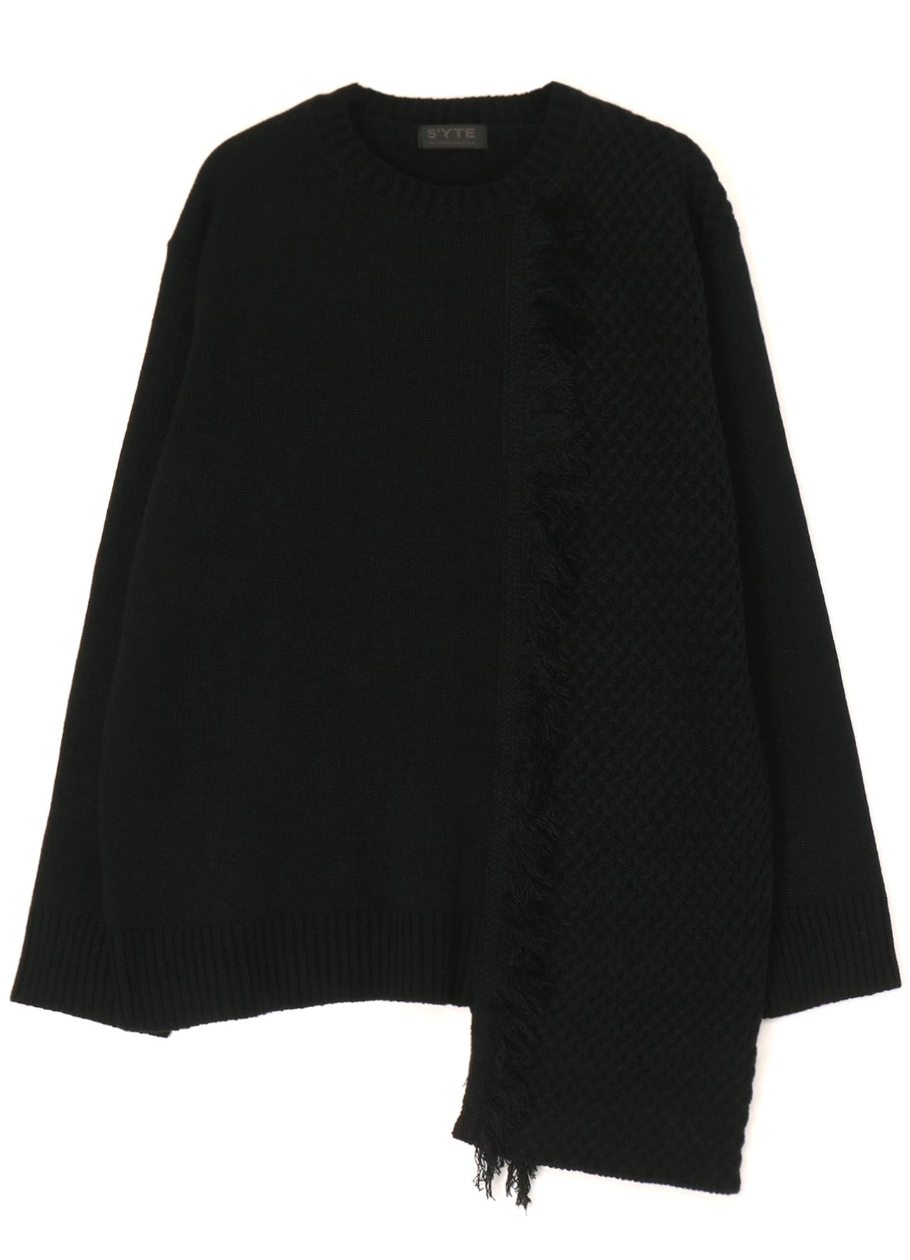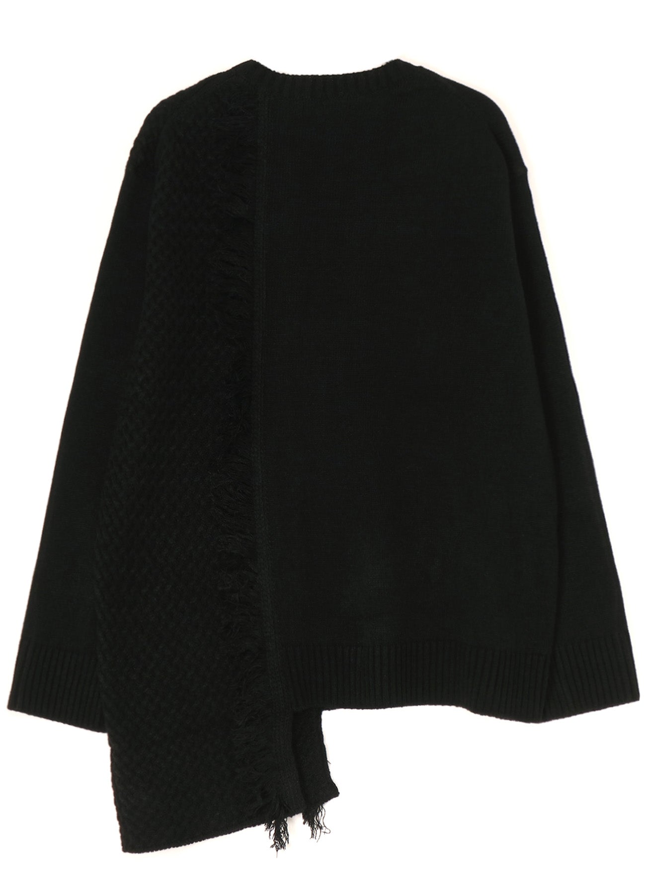 ASYMMETRICAL DESIGN KNIT WITH FRINGE DETAIL SWITCHED TO JACQUARD KNITTING
