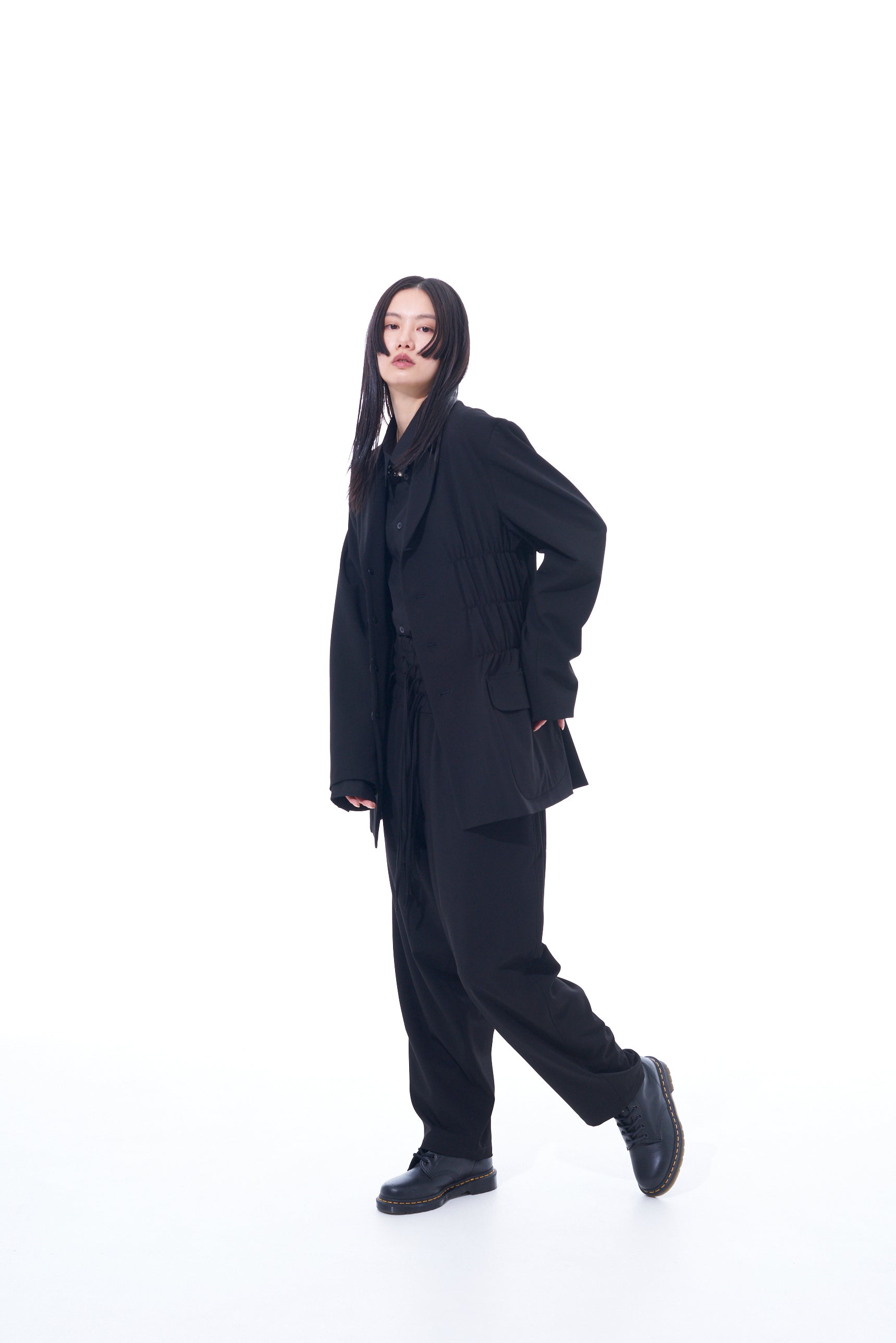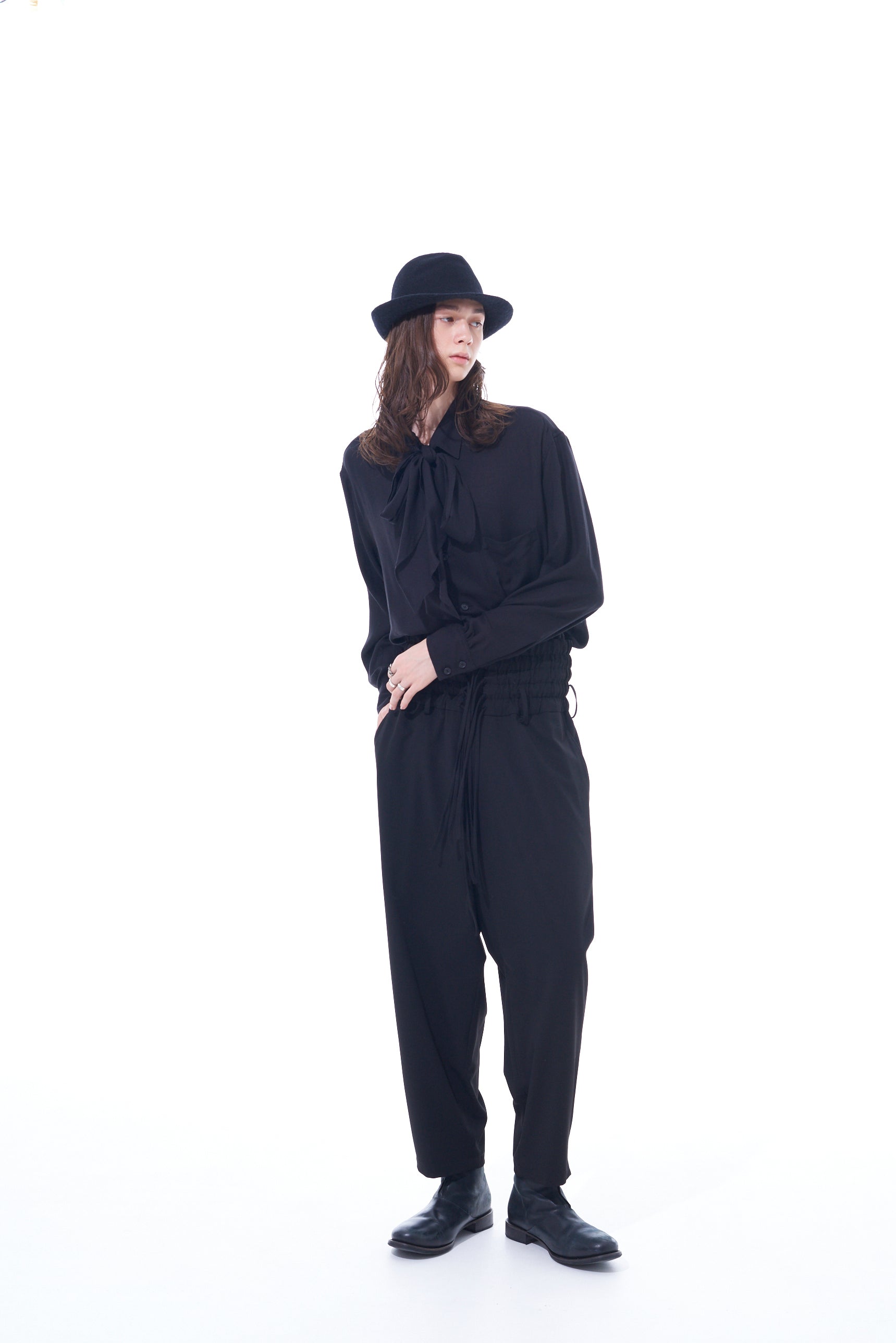 These design pants feature a waistband style with casually draped cords and shirring gathers, reminiscent of a cummerbund. The high-waist design, with integrated elastic for a sharper look, improves fit, making tucked-in styles attractive. Suitable for all seasons, they pair well with simple tops and jackets.