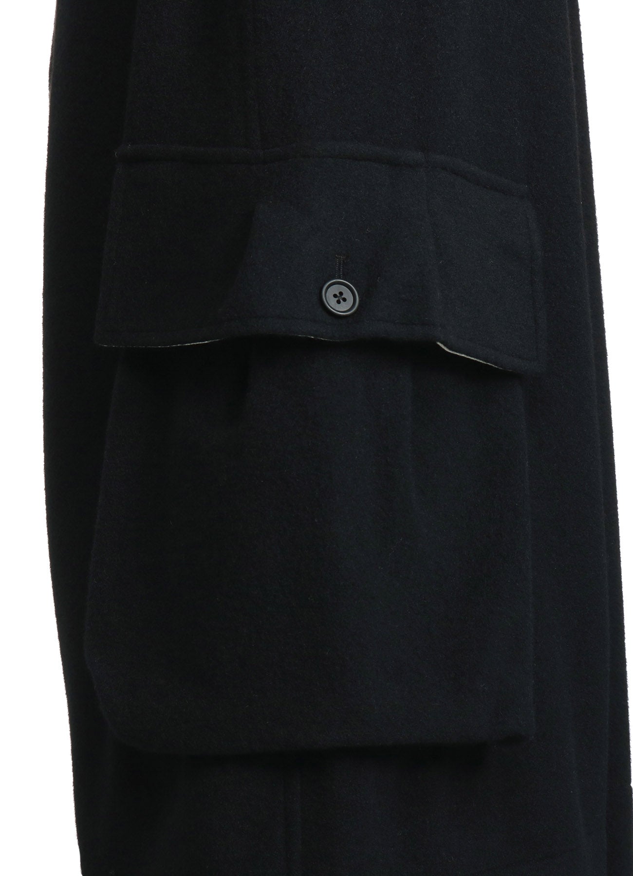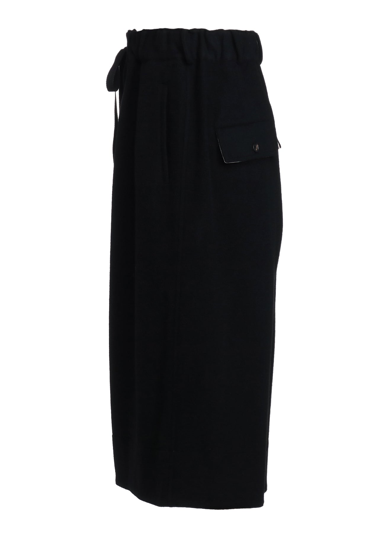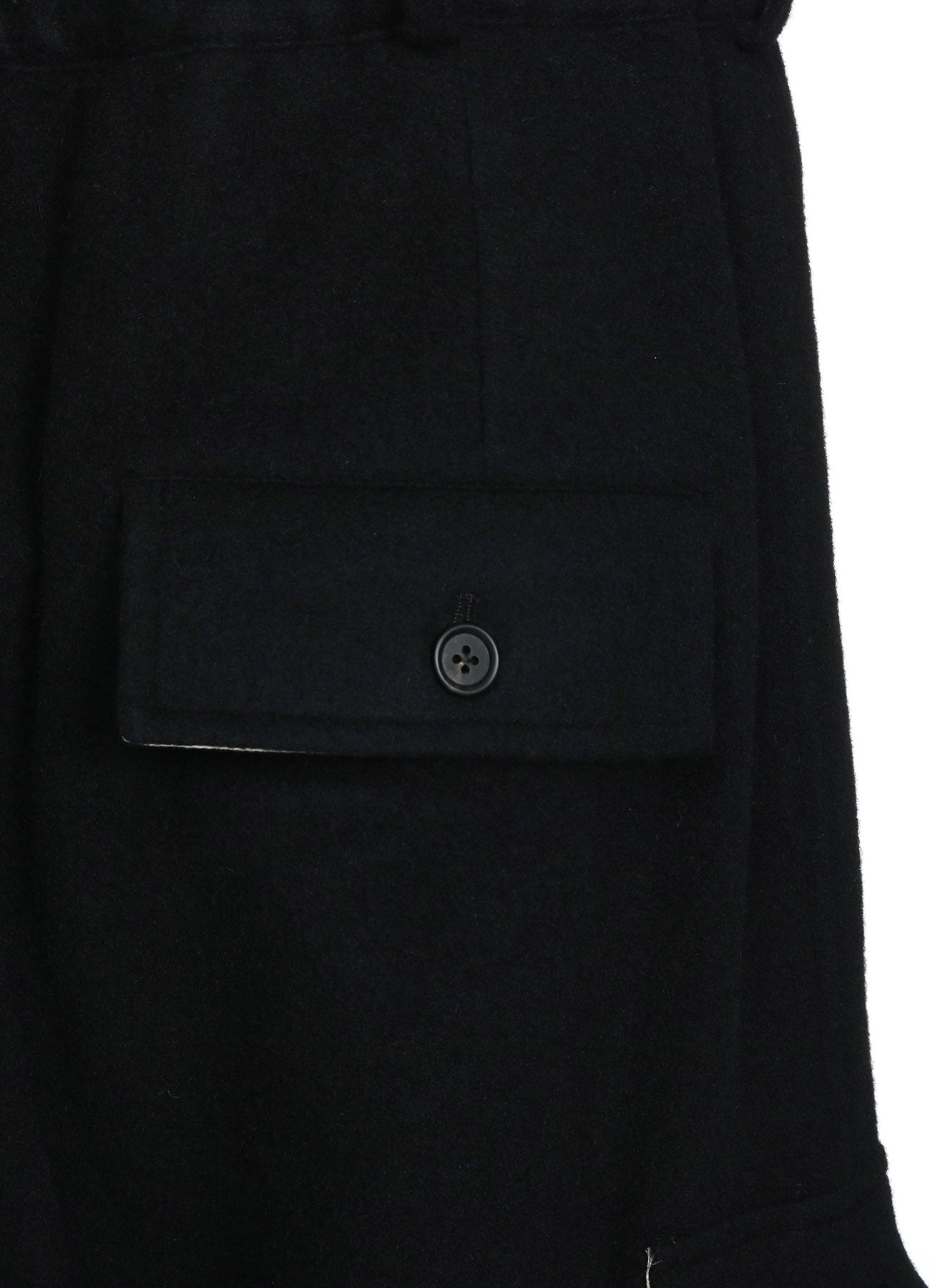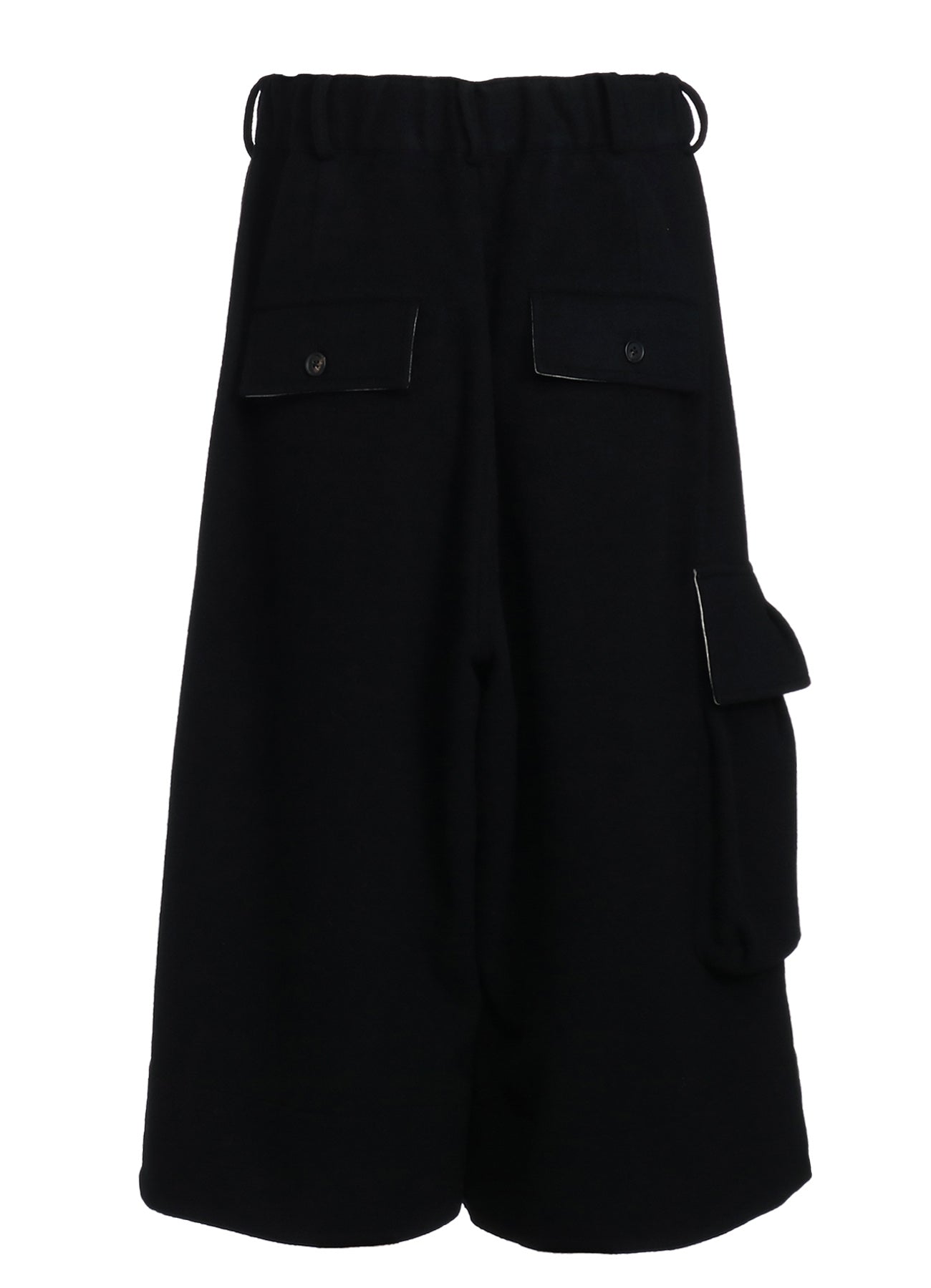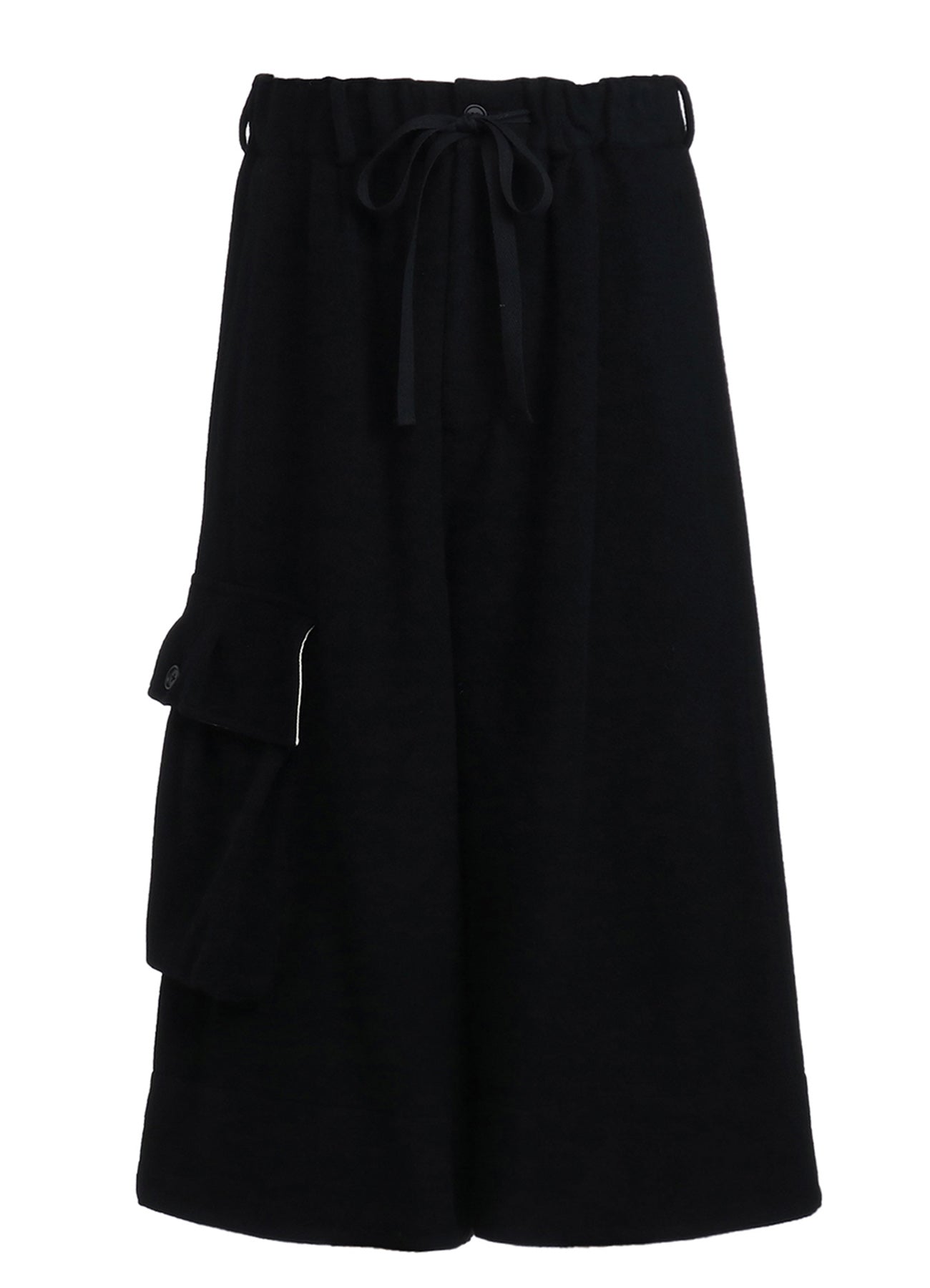 A unique pair of design pants featuring a flared culotte silhouette with rugged military-style flap pockets. The waist uses a comfortable elastic and drawstring, creating lovely gathers. The pants also include off-white fabric lining inside the pockets and hems for a customizable look. The soft mosser fabric provides warmth and visual appeal.