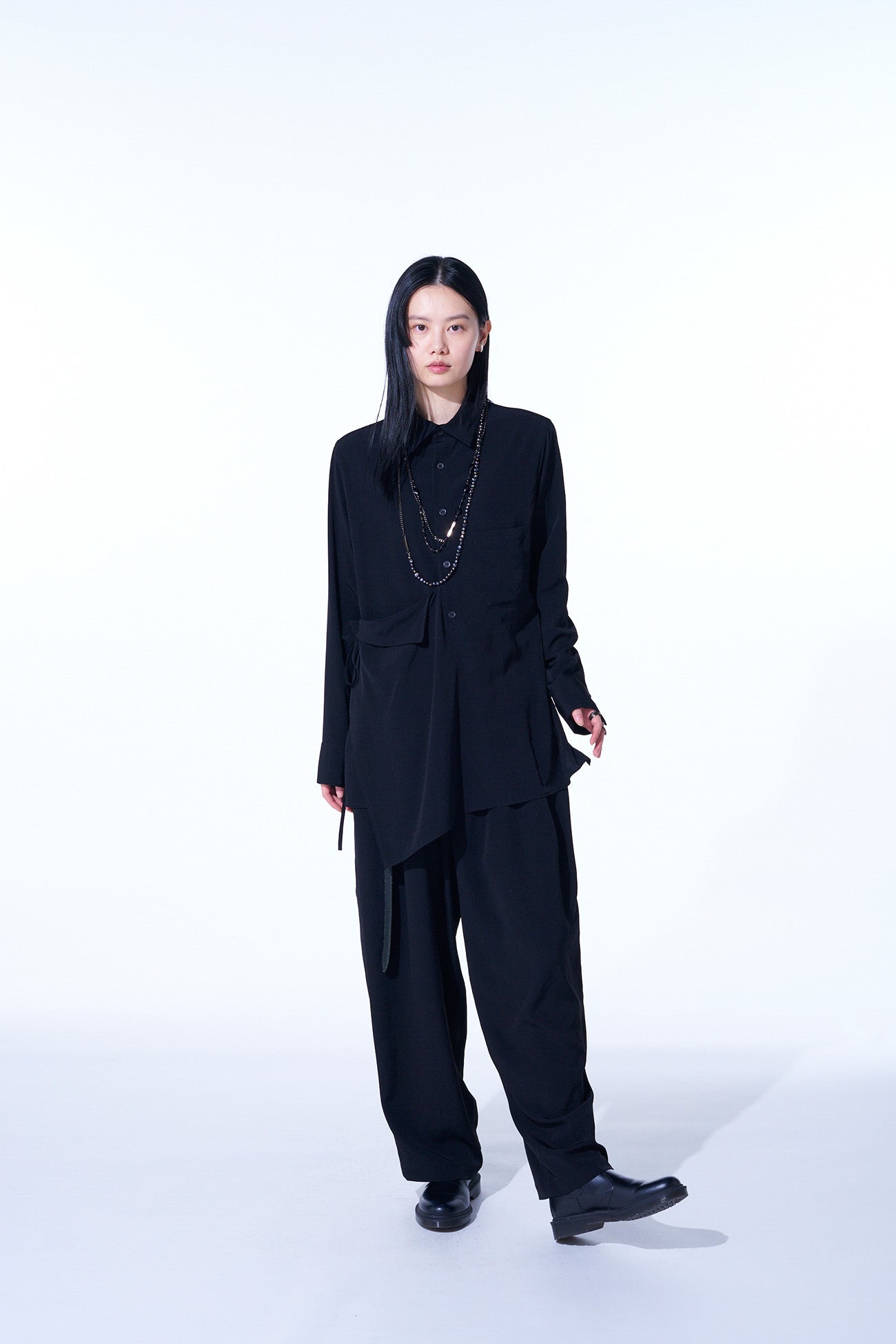 This ladies' patterned shirt features a tied design that creates drapery at the hem. Adjusting the tie position alters the front design. The tight shoulder and arm areas contrast with the flared hem silhouette. Its soft sheen and wrinkle-resistant fabric offer a luxurious, lightweight, all-season wear.