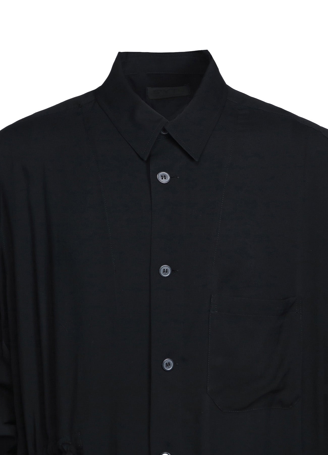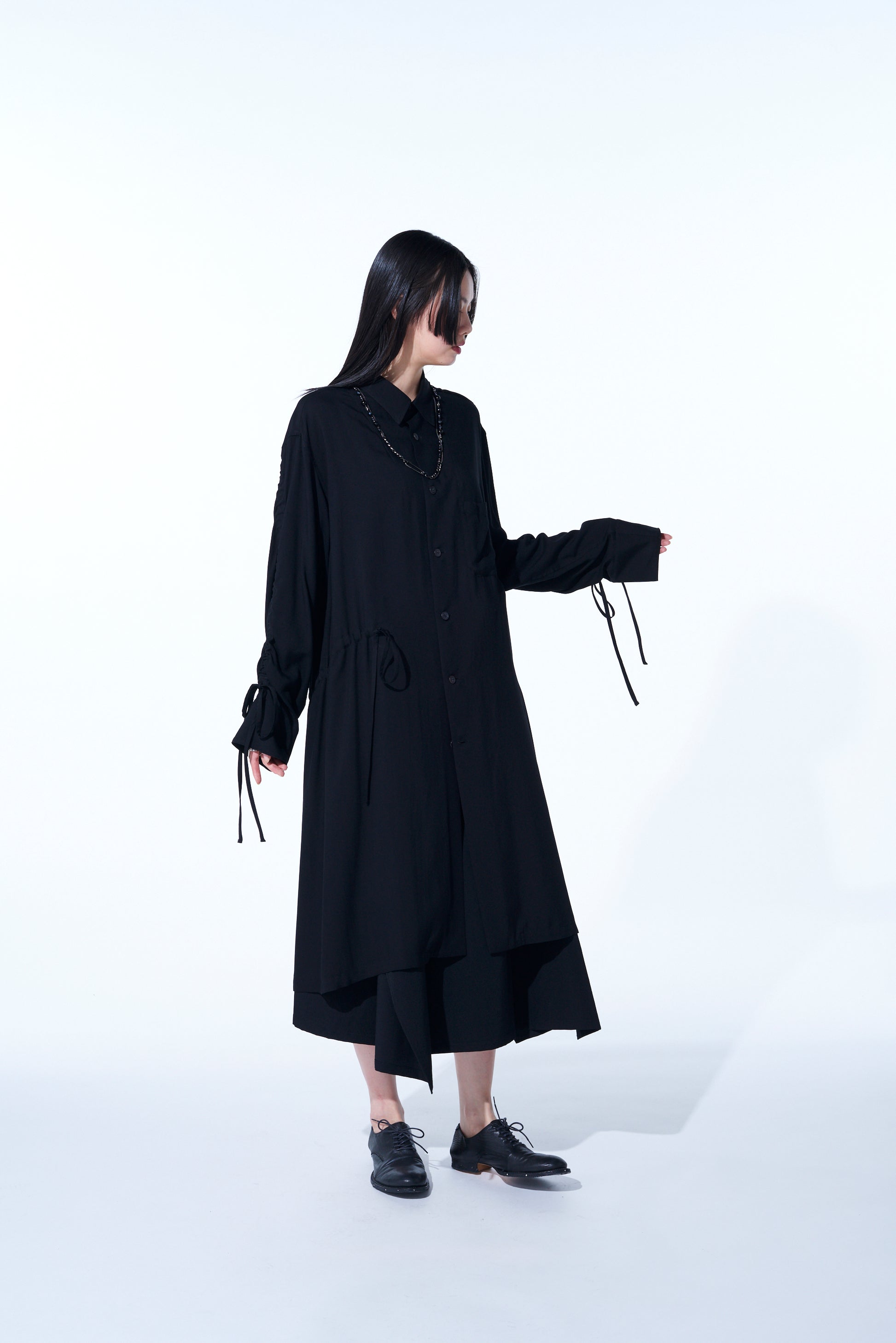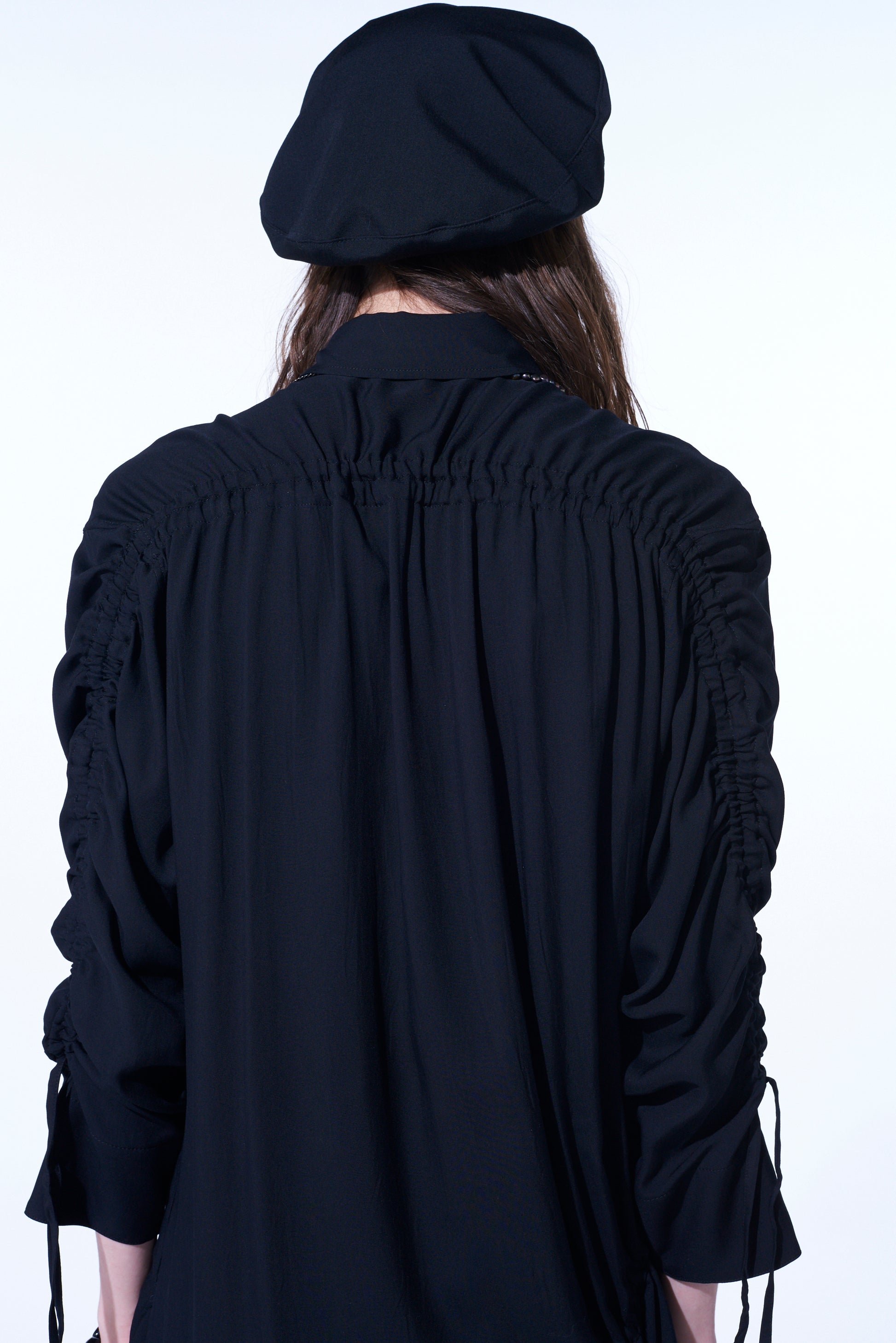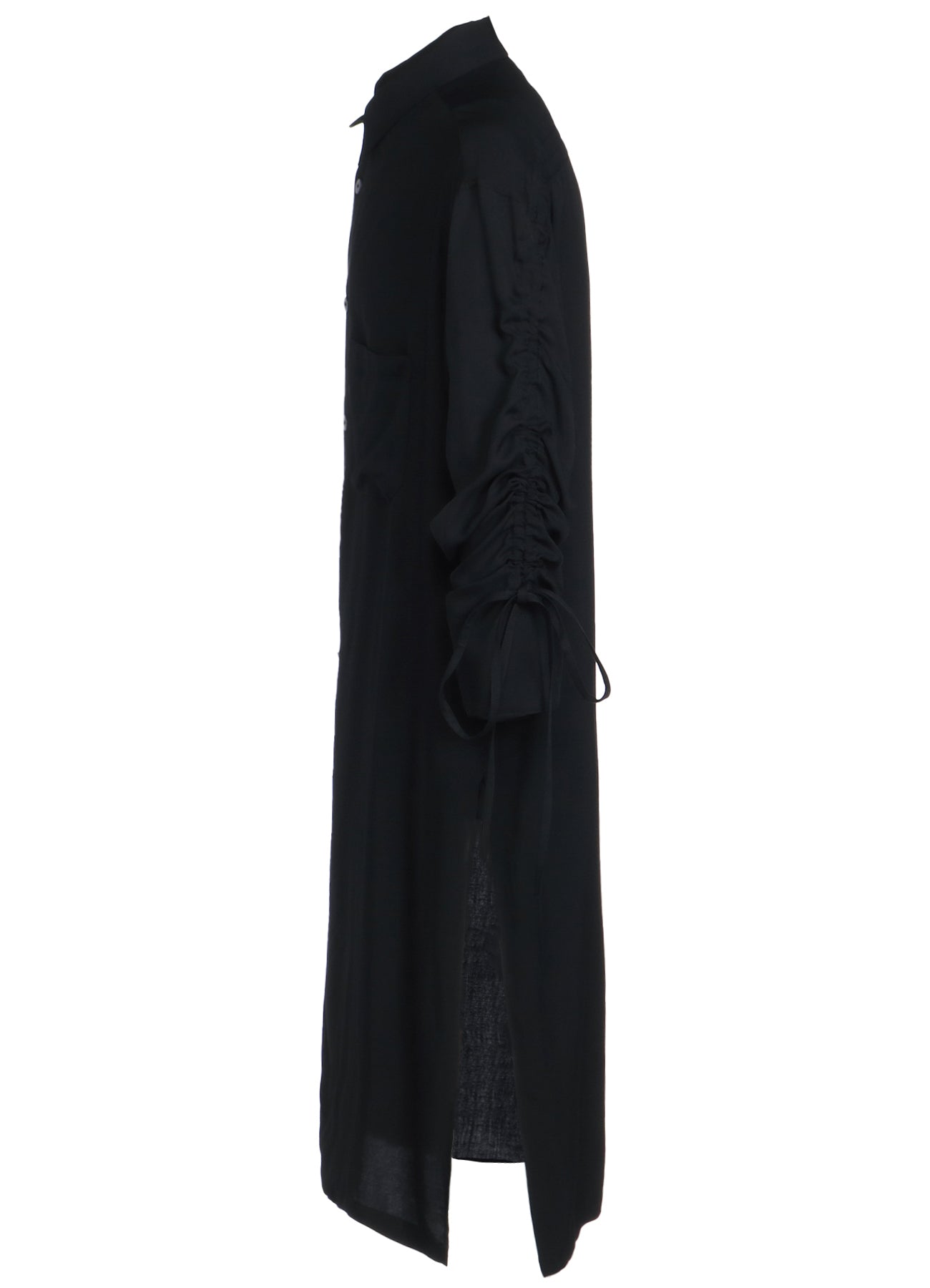 This long shirt allows you to adjust sleeve length and body fit by pulling the attached drawstring, creating unique nuances. The gathered design pairs well with vests and sleeveless outerwear. The asymmetric slit on the left hem draws from vintage work shirts. Made from drapey rayon twill, it offers a soft and relaxed silhouette suitable for layering with outerwear.