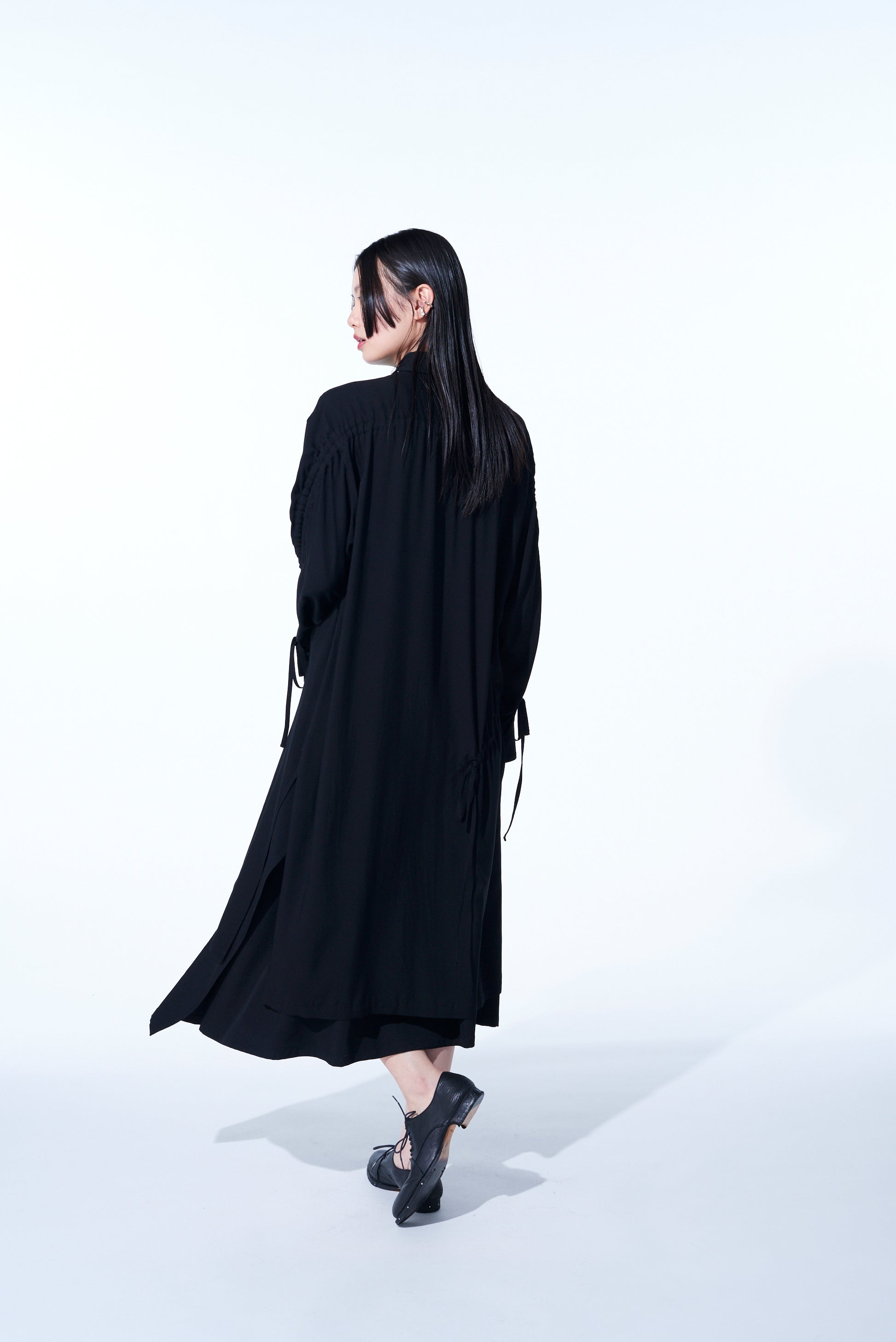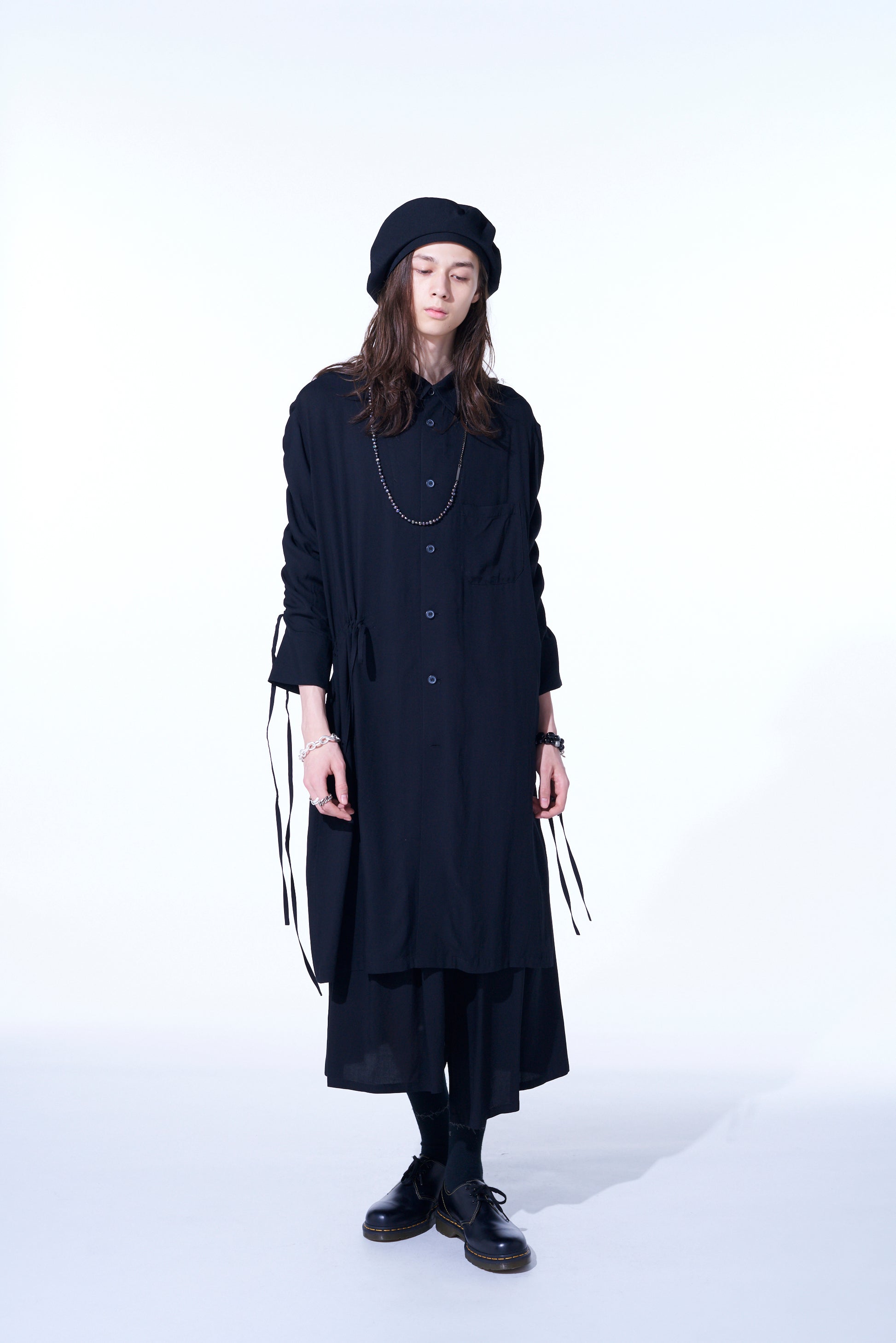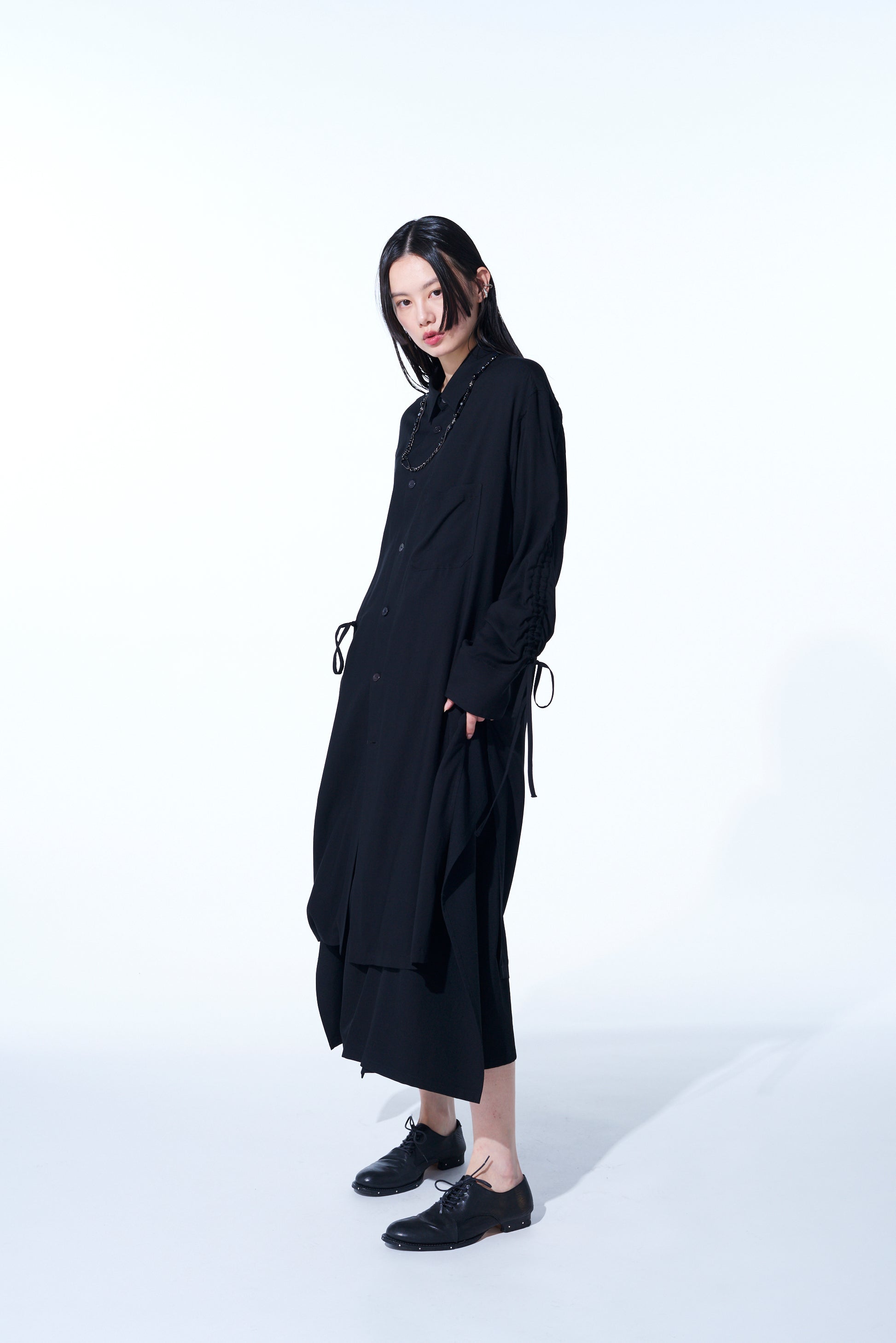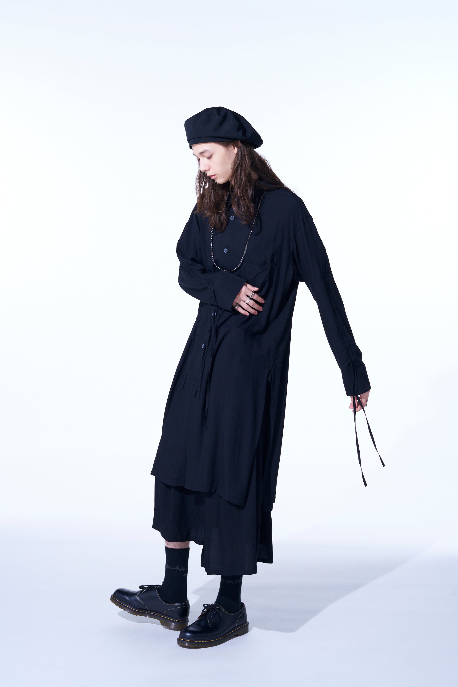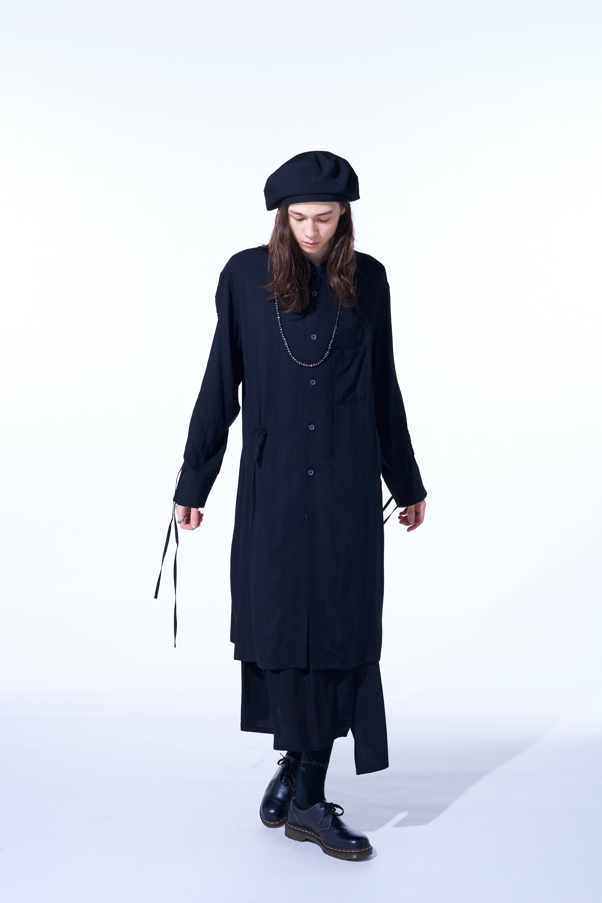 This long shirt allows you to adjust sleeve length and body fit by pulling the attached drawstring, creating unique nuances. The gathered design pairs well with vests and sleeveless outerwear. The asymmetric slit on the left hem draws from vintage work shirts. Made from drapey rayon twill, it offers a soft and relaxed silhouette suitable for layering with outerwear.