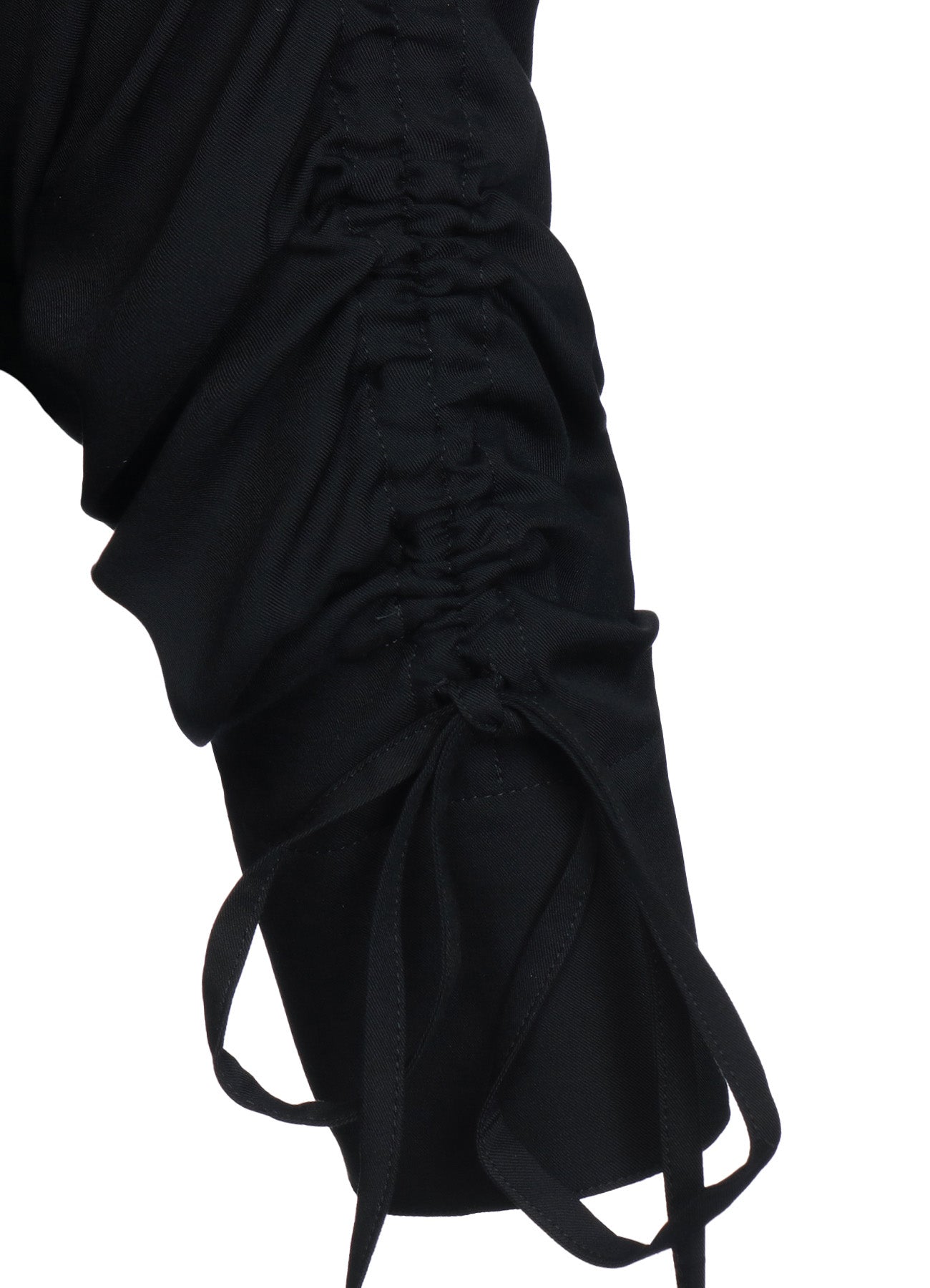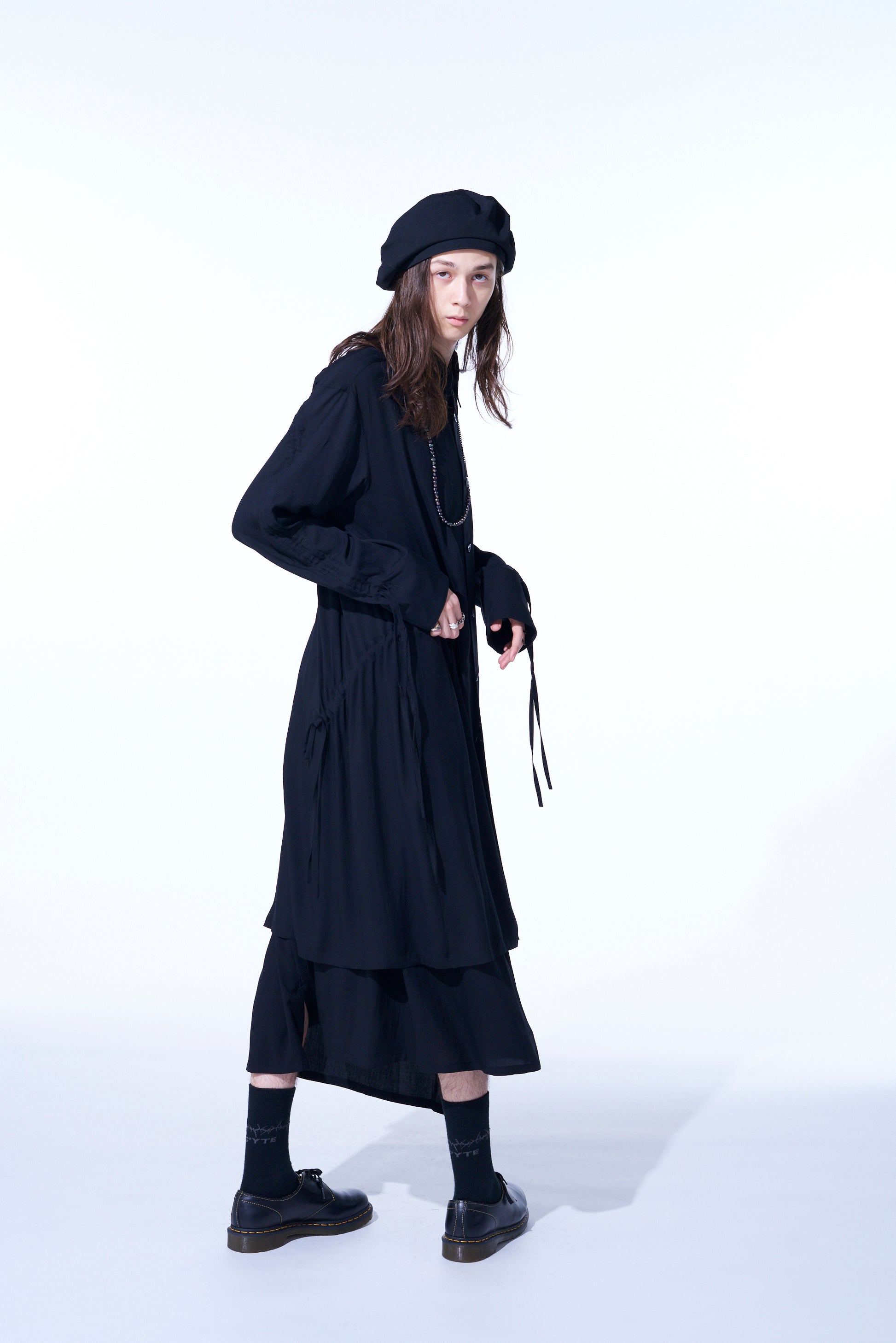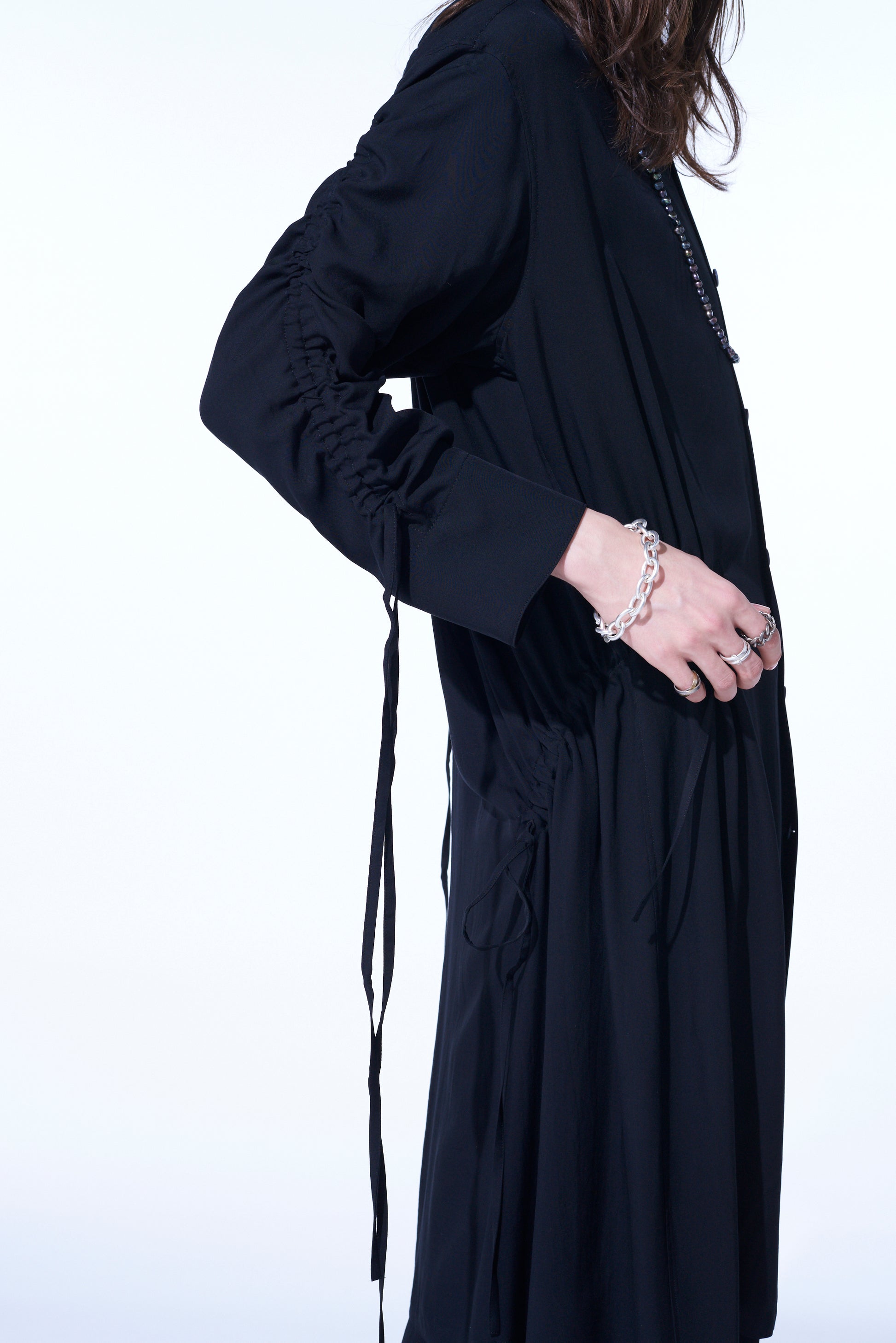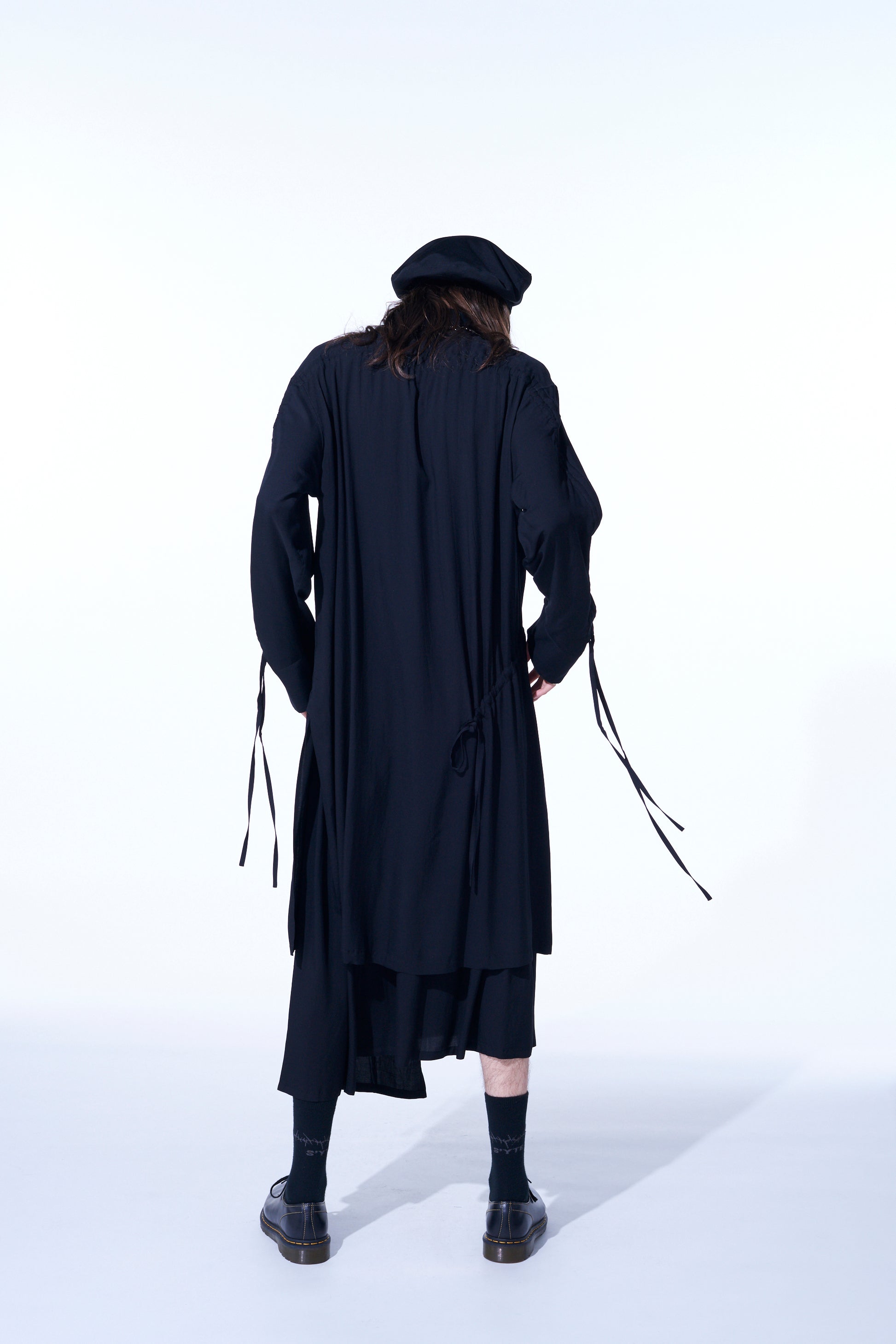 This long shirt allows you to adjust sleeve length and body fit by pulling the attached drawstring, creating unique nuances. The gathered design pairs well with vests and sleeveless outerwear. The asymmetric slit on the left hem draws from vintage work shirts. Made from drapey rayon twill, it offers a soft and relaxed silhouette suitable for layering with outerwear.