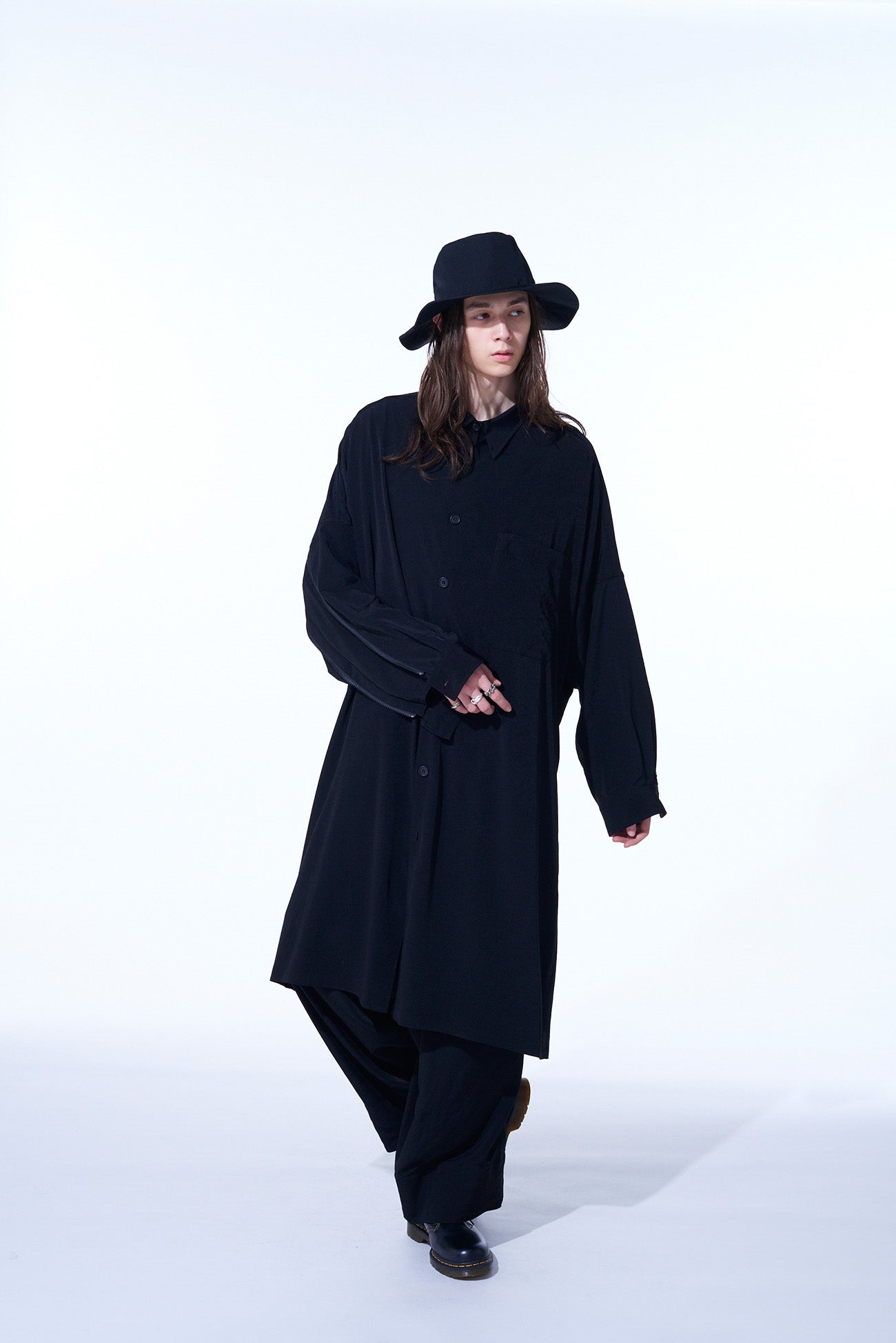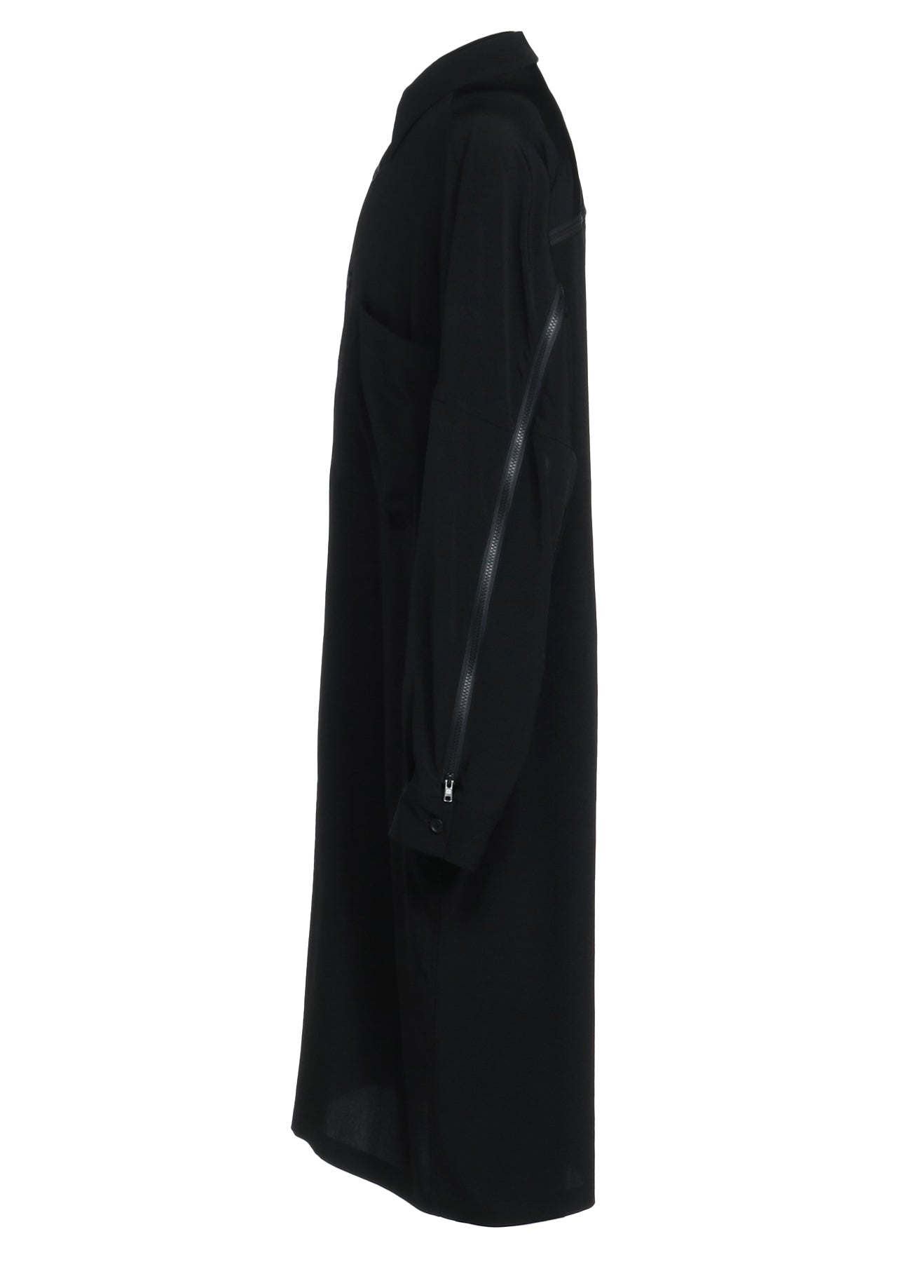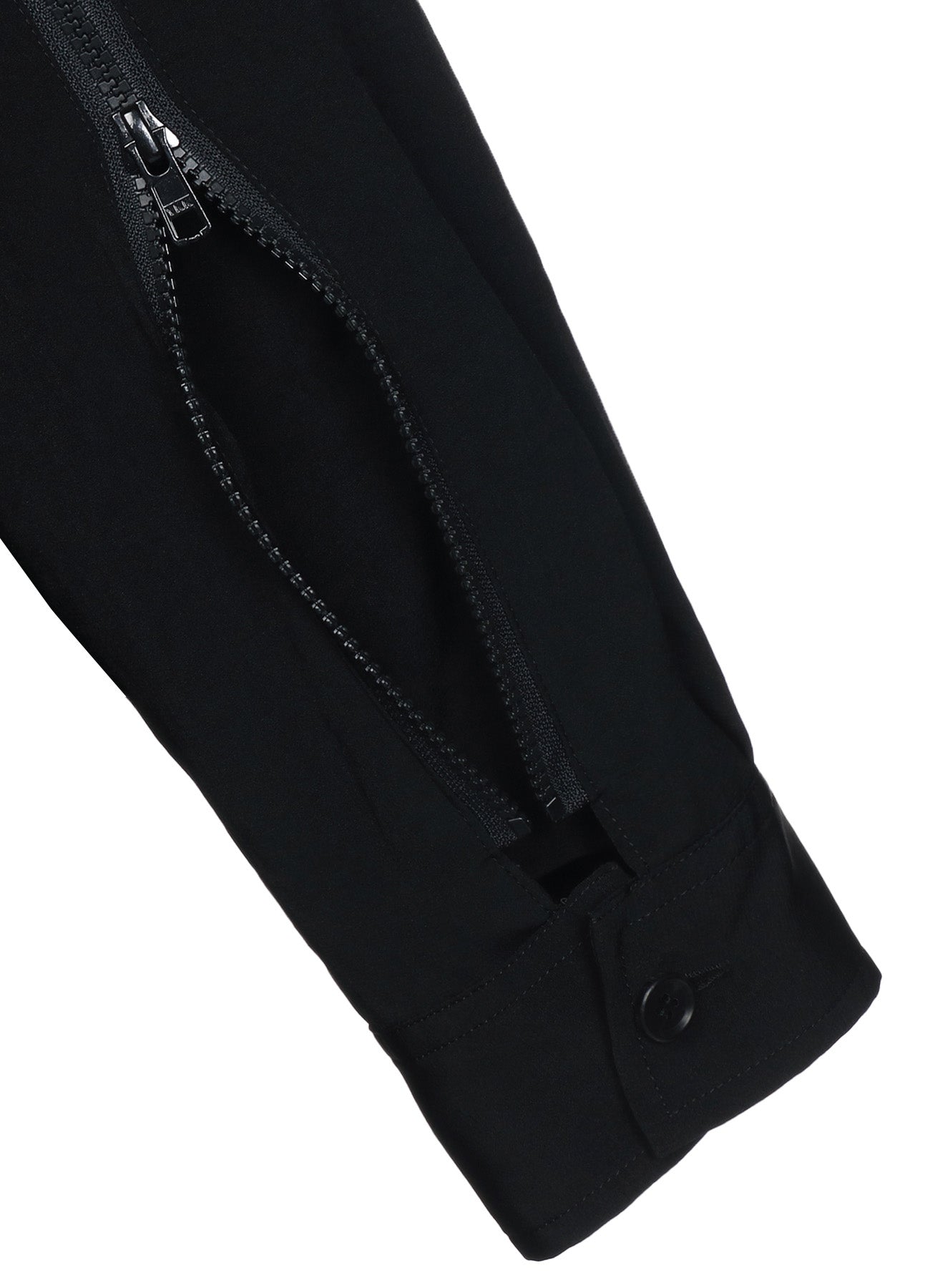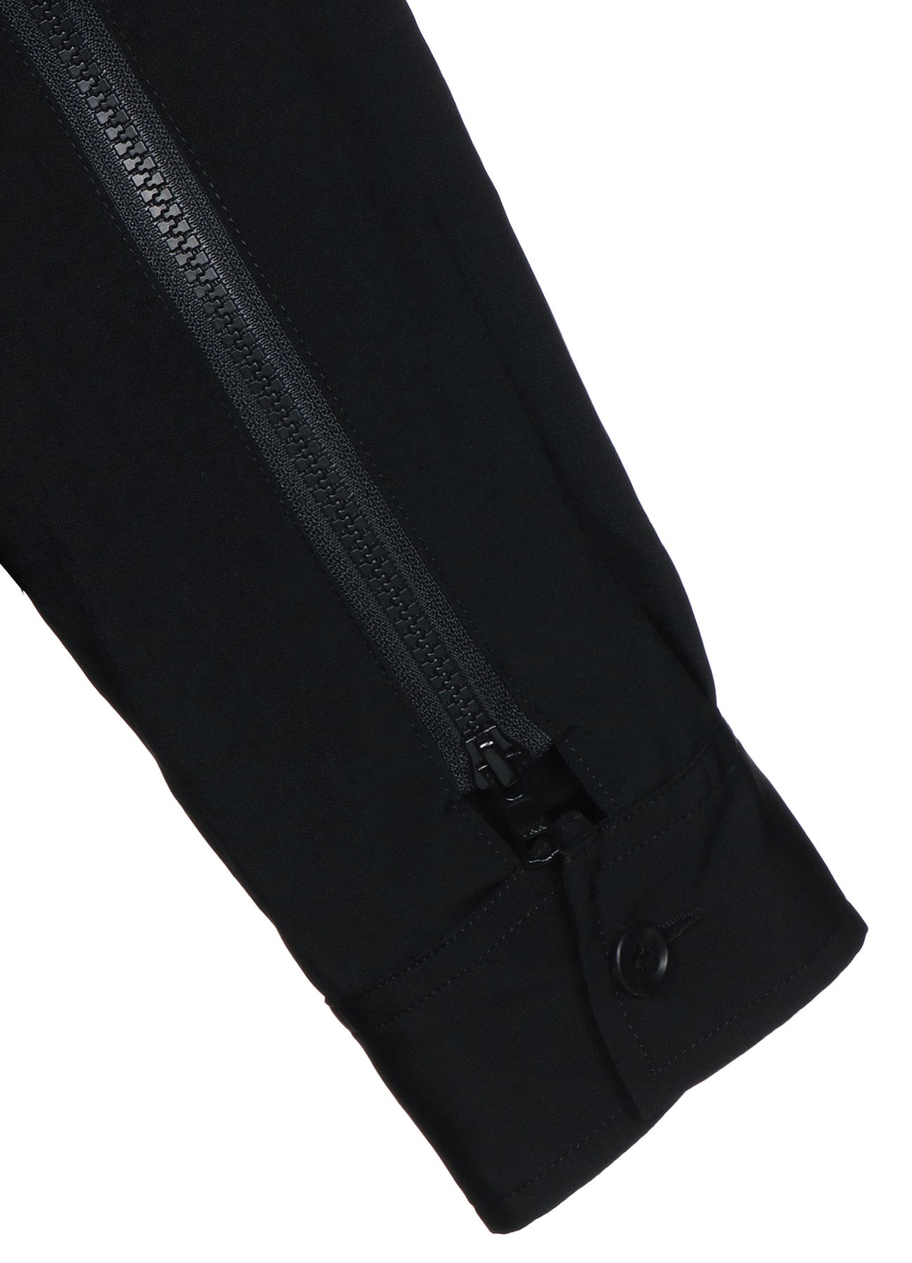 The shirt-tailored coat features prominent zippers extending from the cuffs to the back, allowing for an adjustable gap and deconstructed design. Made from Yohji Yamamoto's signature triacetate/polyester crepe de Chine, it boasts a luxurious drape and sheen, ideal for lightweight spring/summer styling.