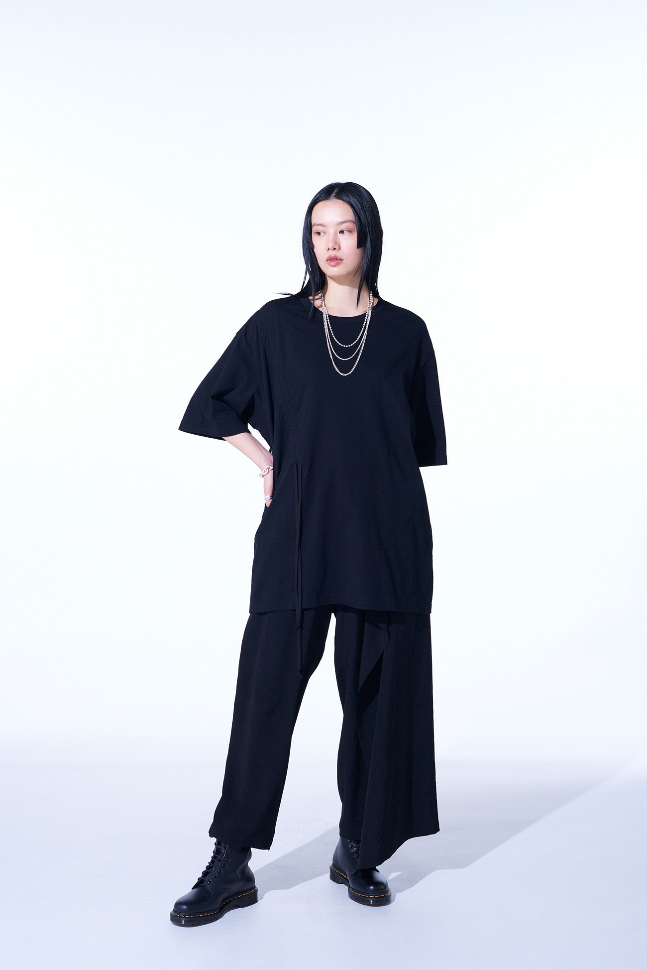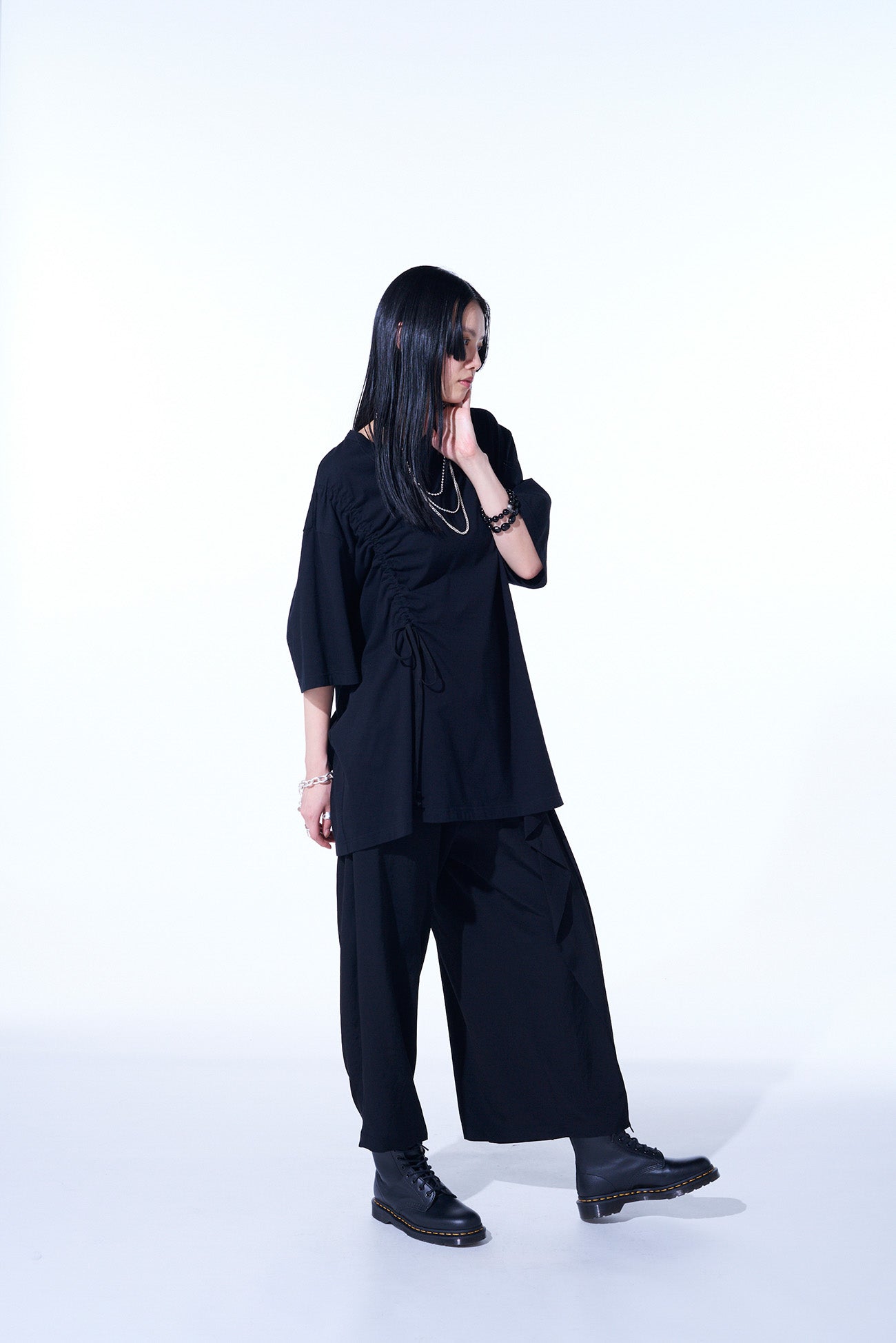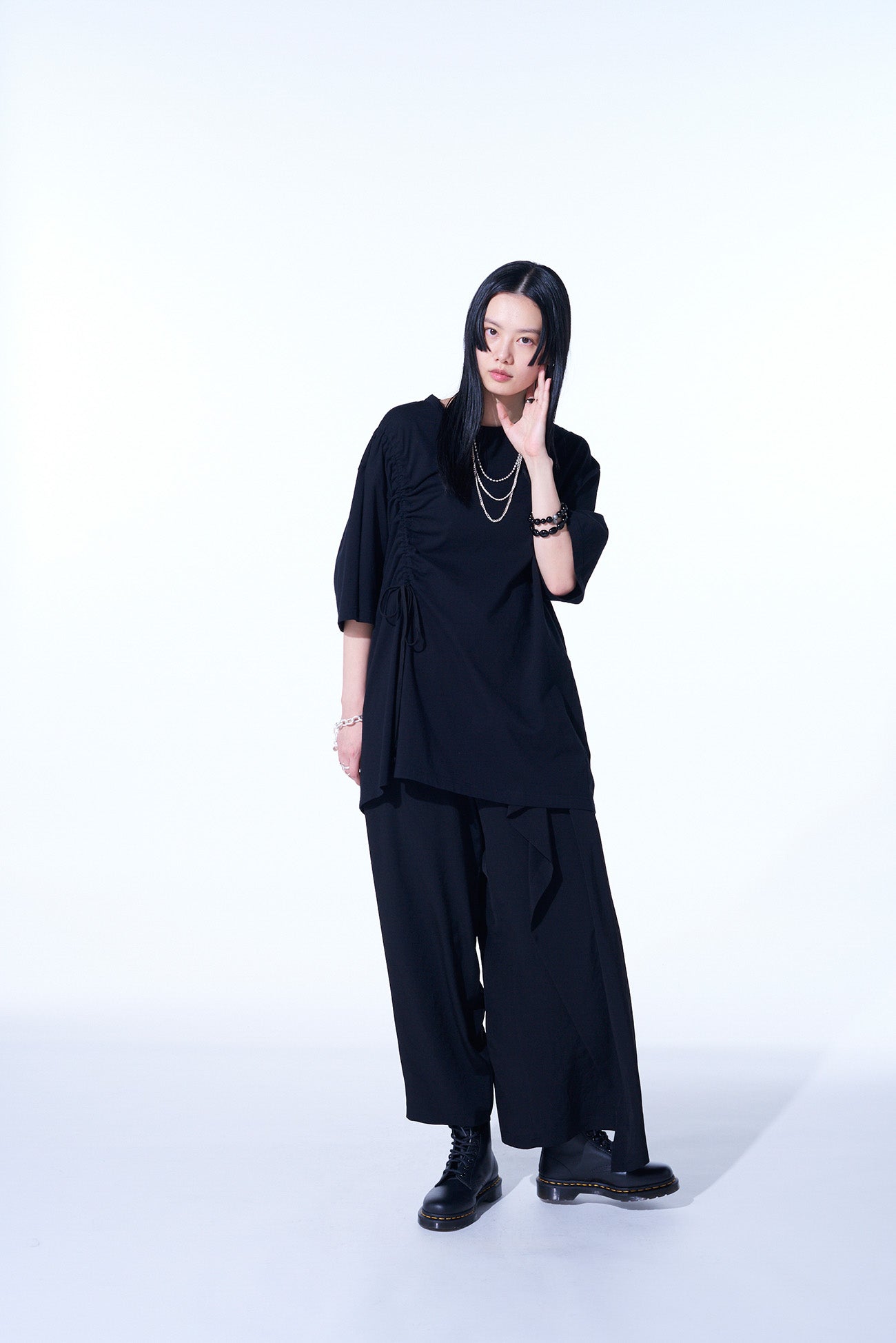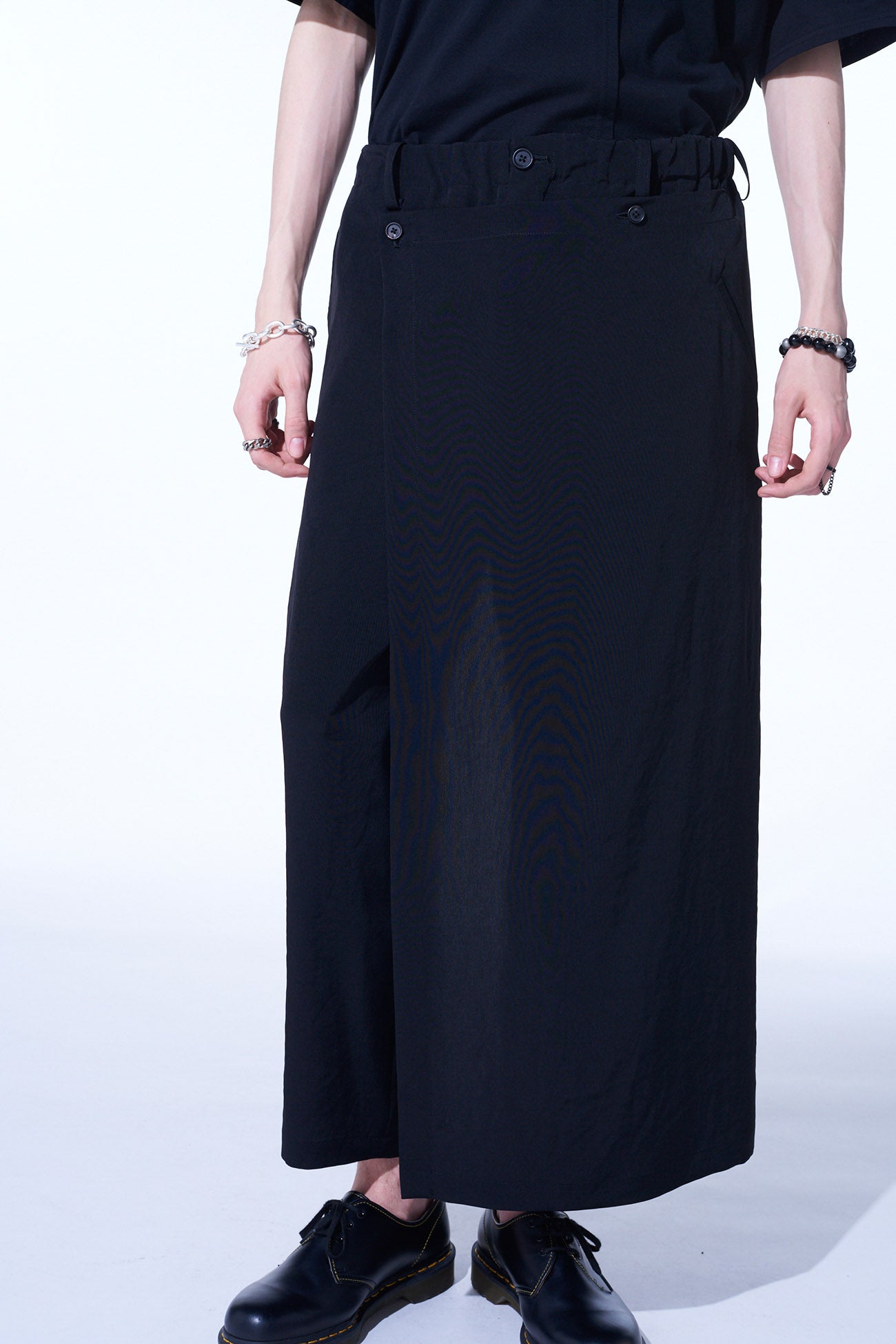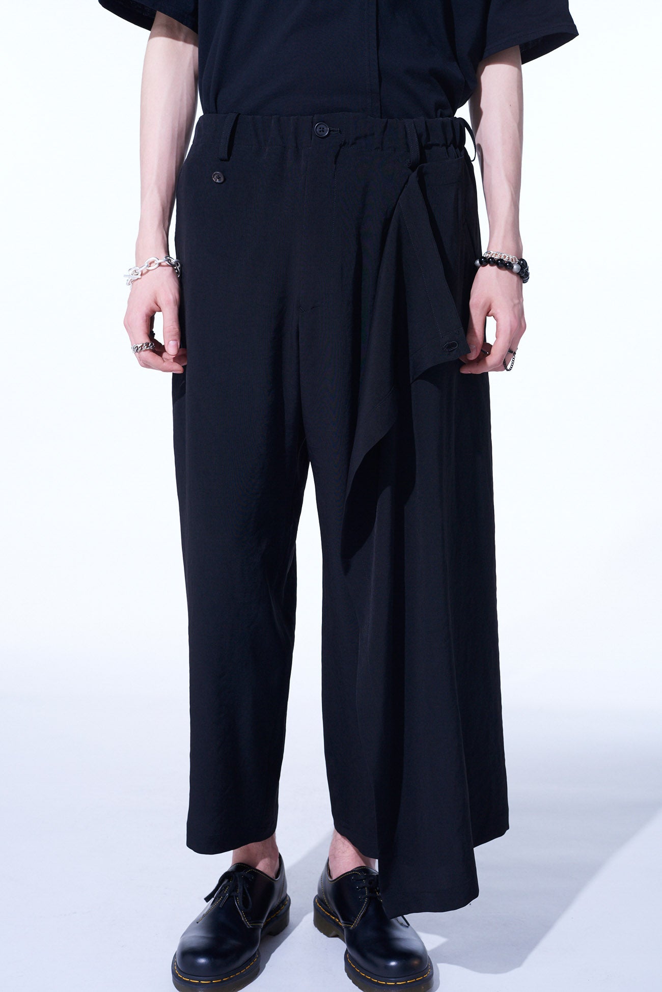 A unique design with tapered wide pants, combining voluminous fabric in a wrap style. The wrap part can be adjusted at the waist with buttons, creating dynamic movement. Easy to wear with an elastic and drawstring waist. Versatile coordination with matching tops and adaptable footwear.