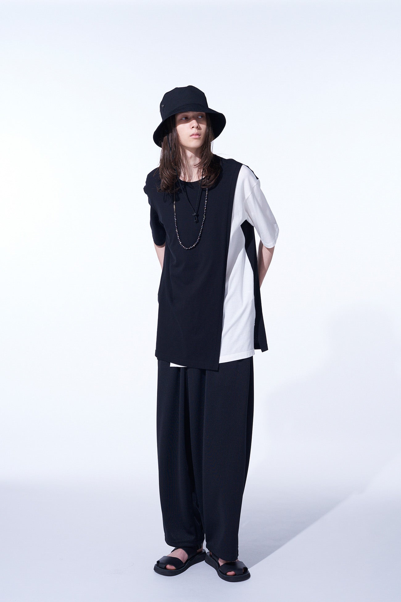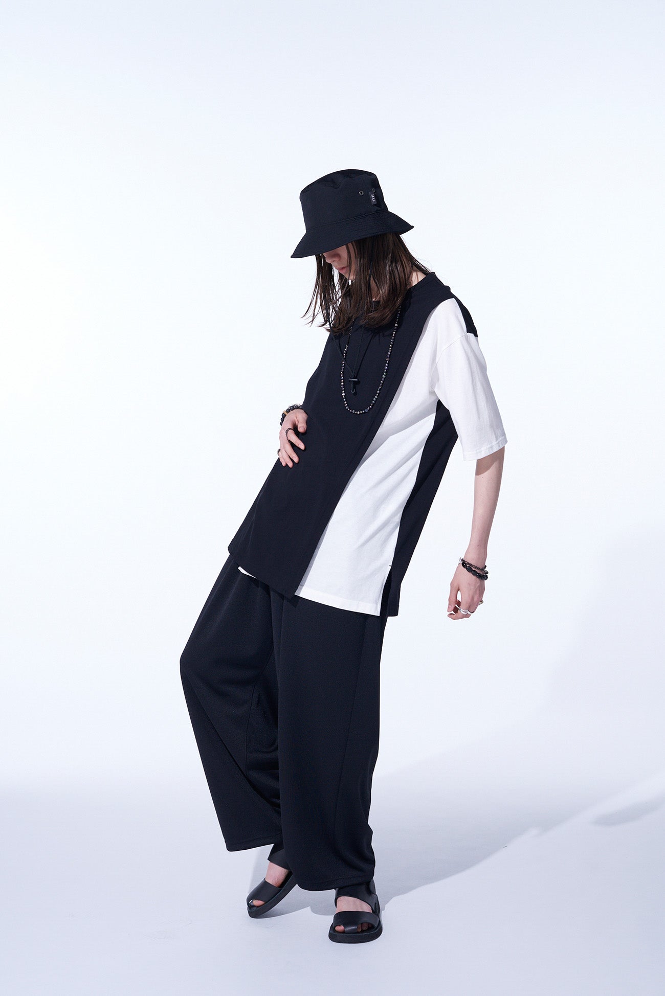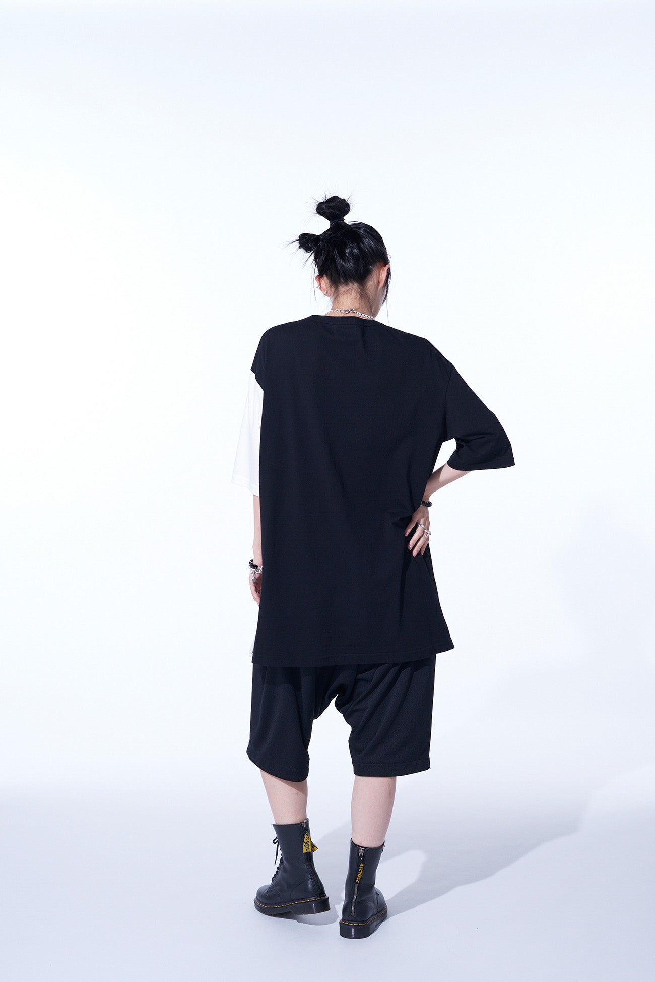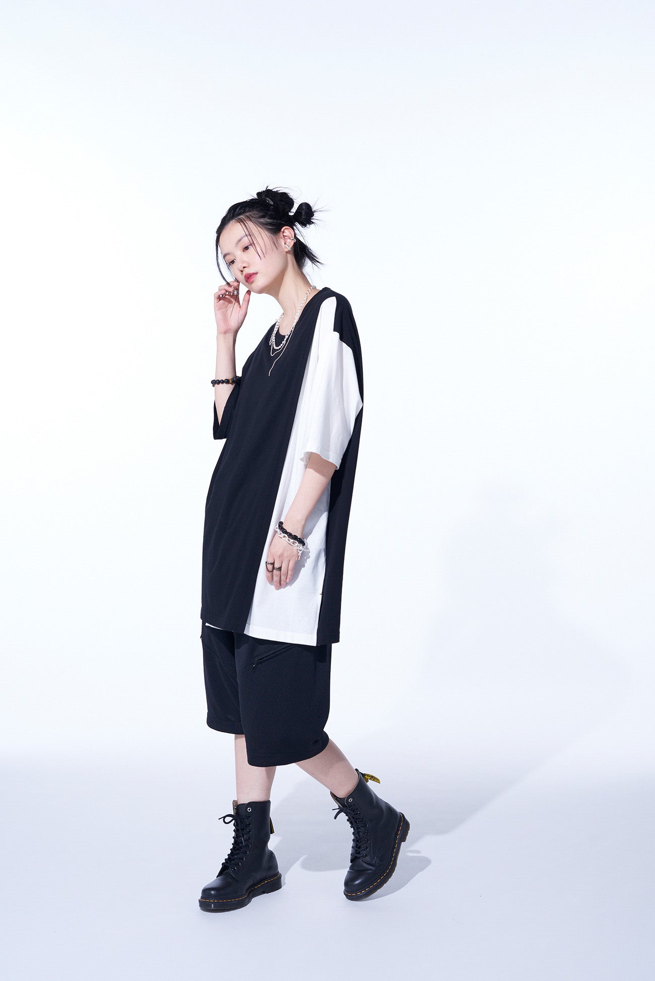 This unique top features a layered wrap detail on the front that sways with movement, adding dynamism to the monochromatic design. Perfect for pairing with wide silhouette pants, its soft and durable 30/1 plain stitch fabric offers a comfortable yet stylish daily wear. The versatile monochrome design works well with jackets or shirts for refined styling.