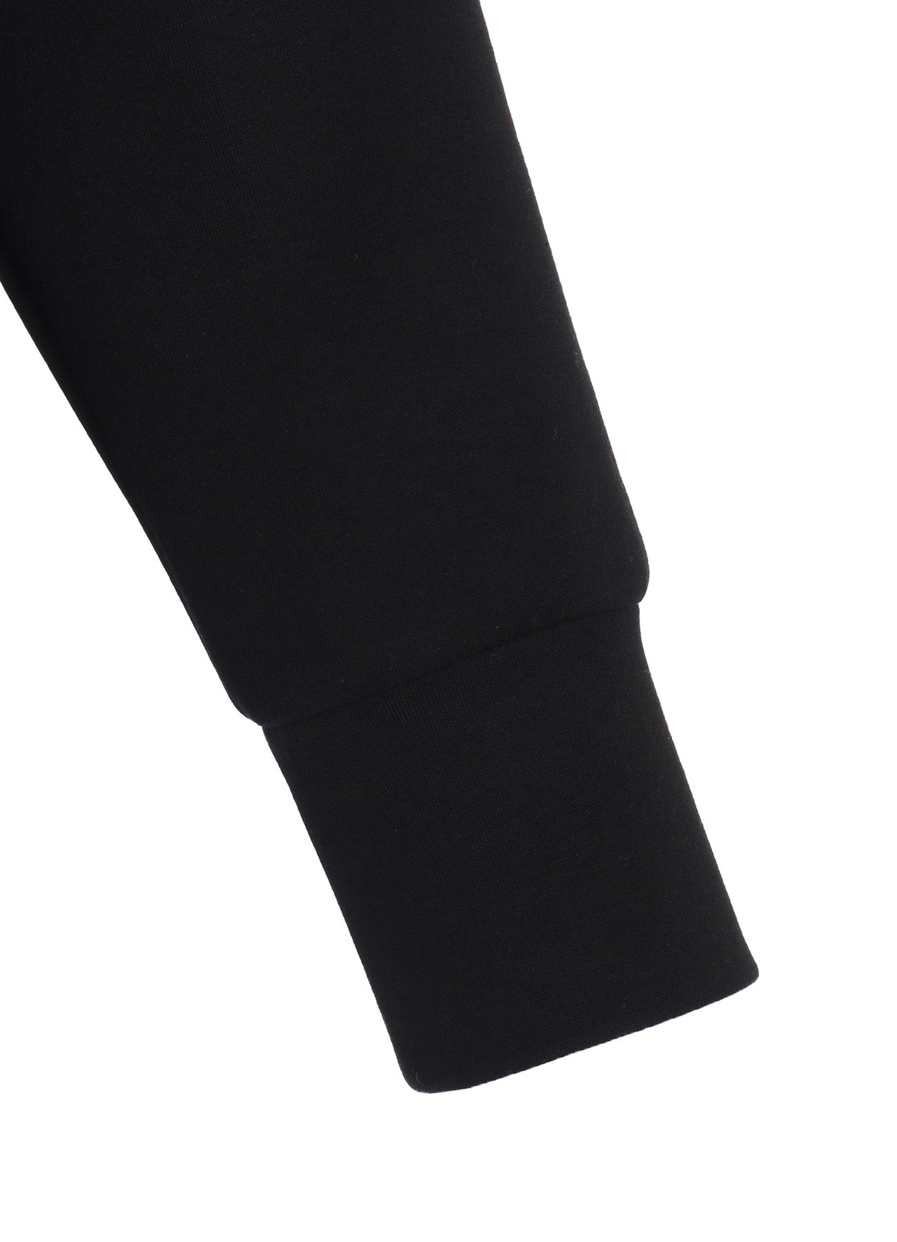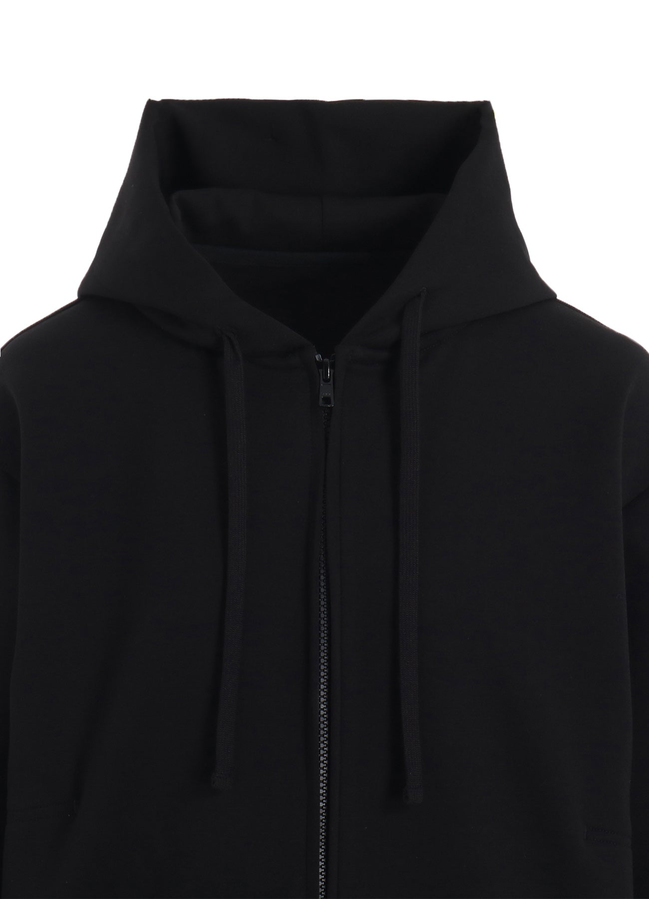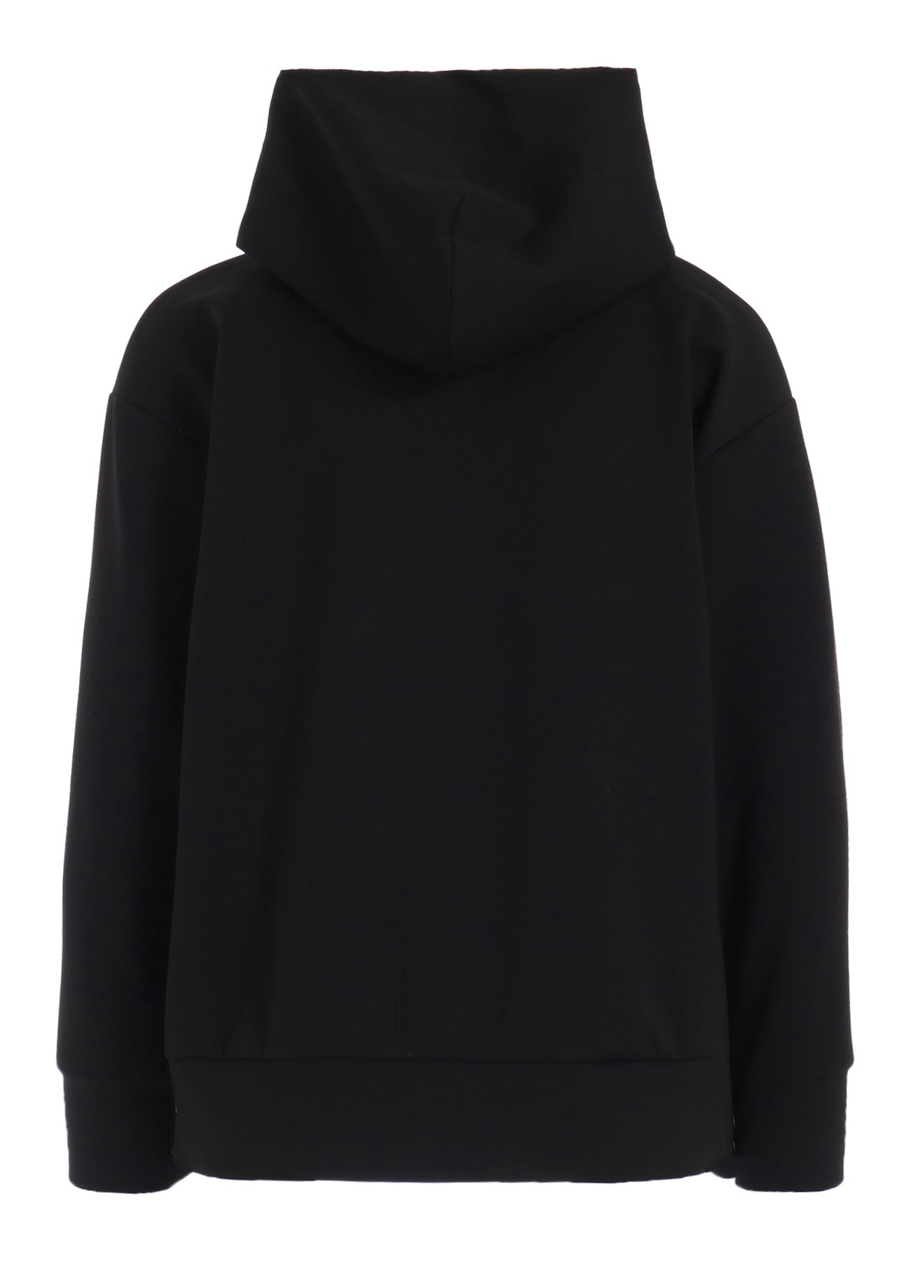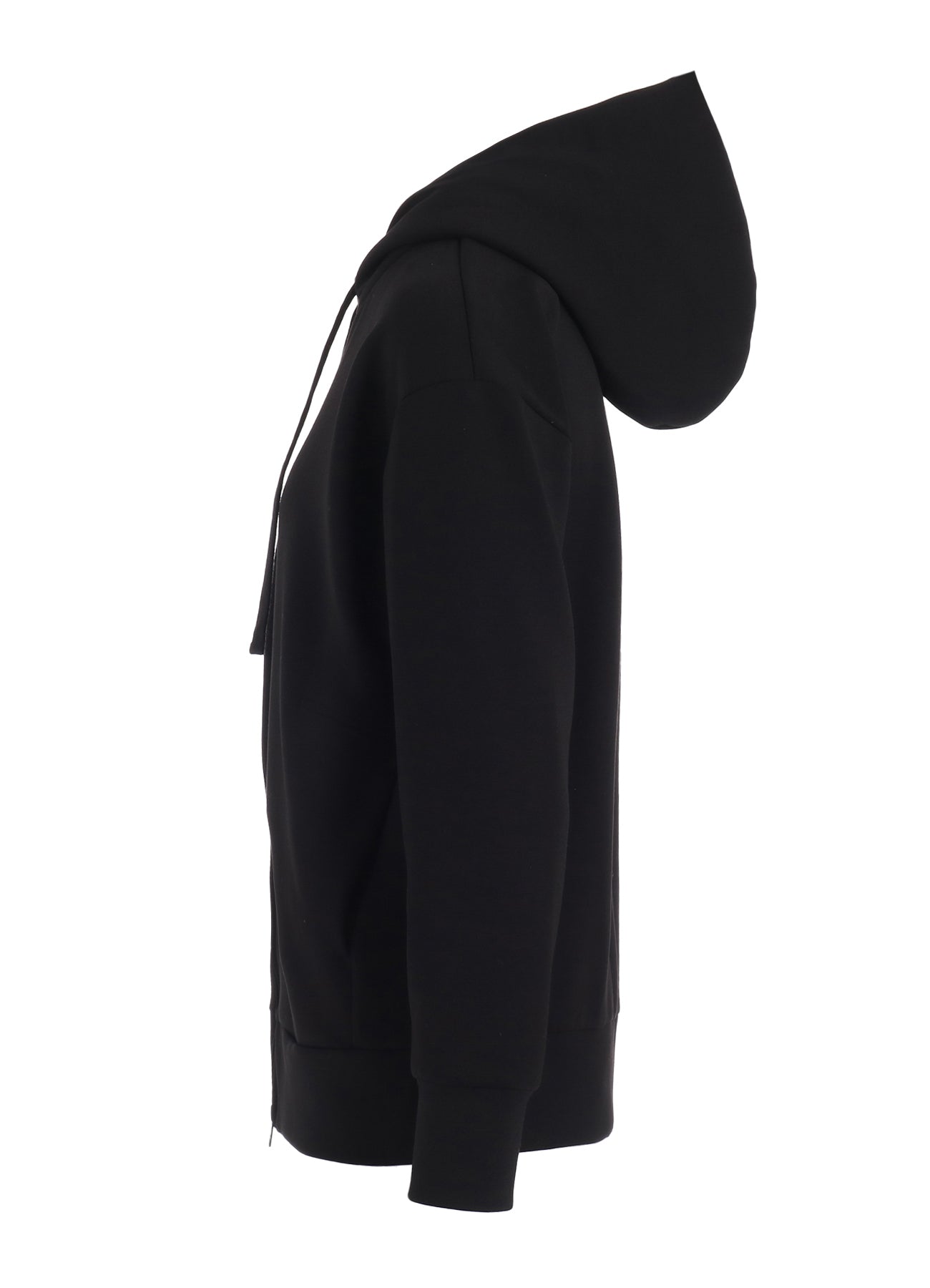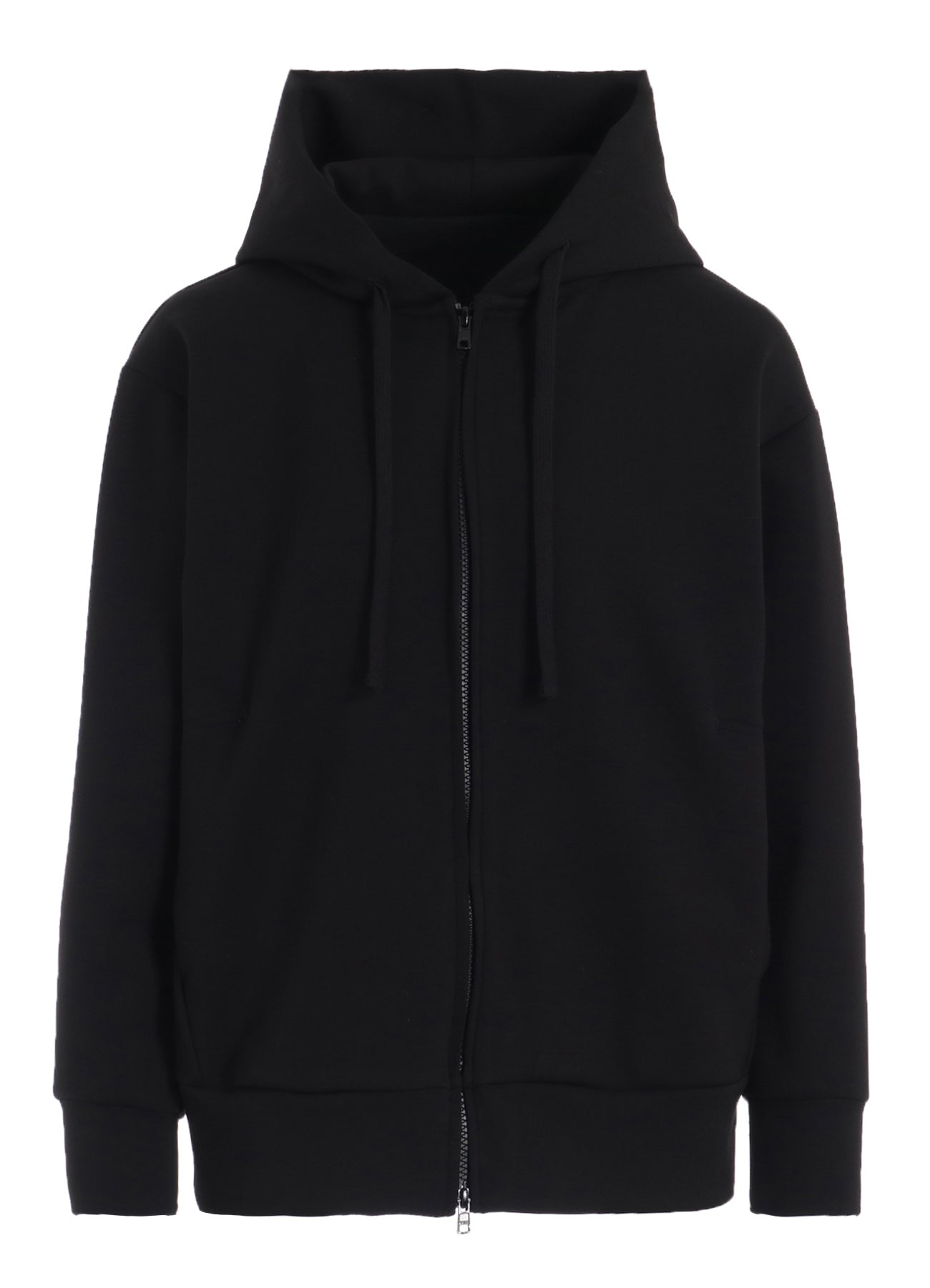 This easy-care hoodie is crafted from a unique material combining two layers of fabric with added rayon for extra softness and smoothness. It features a substantial thickness and a slight drapery, making it versatile for various stylish ensembles without appearing too casual.