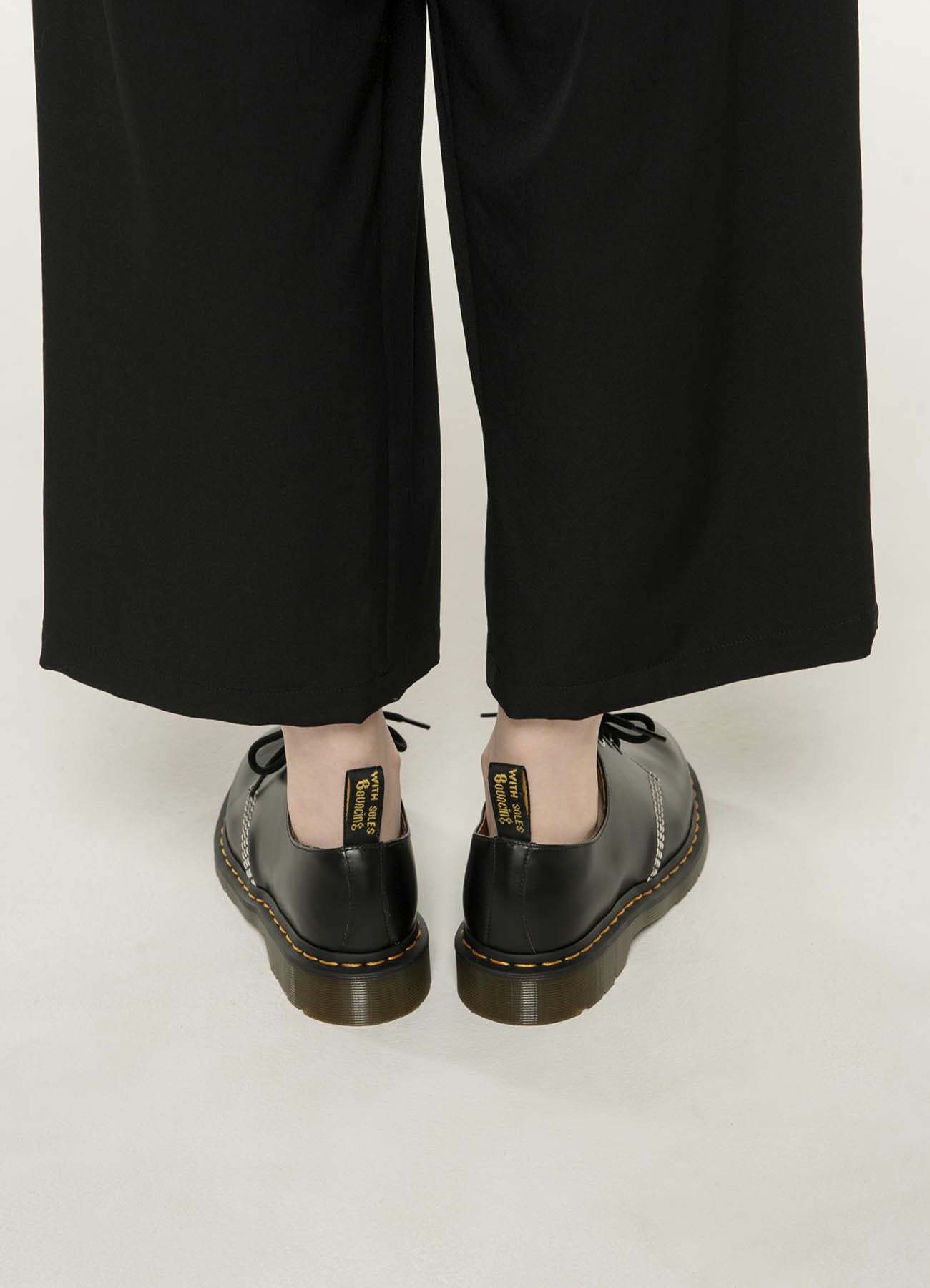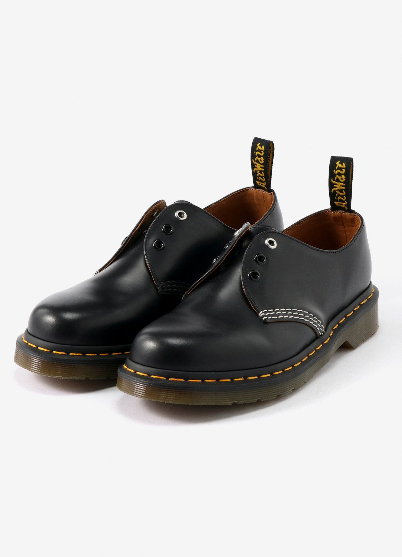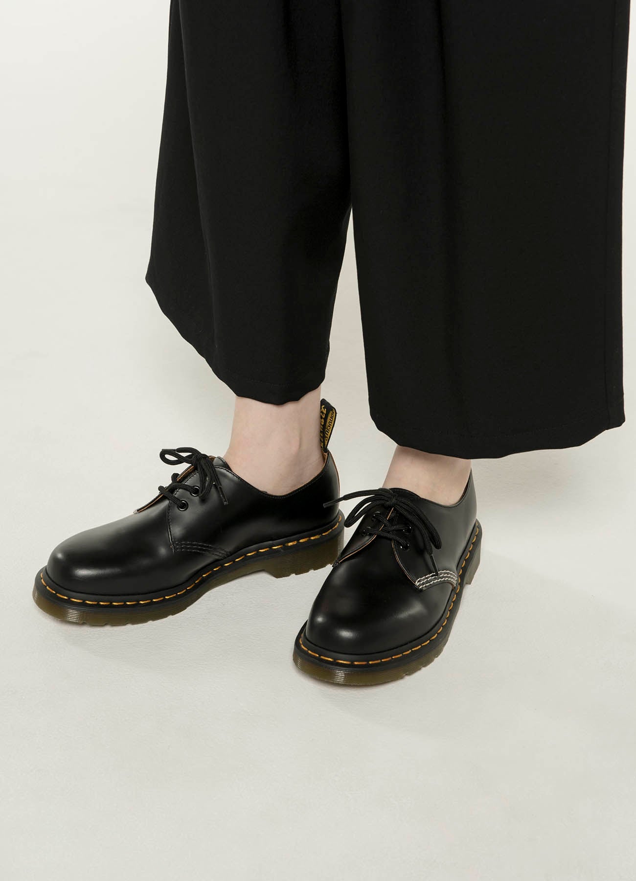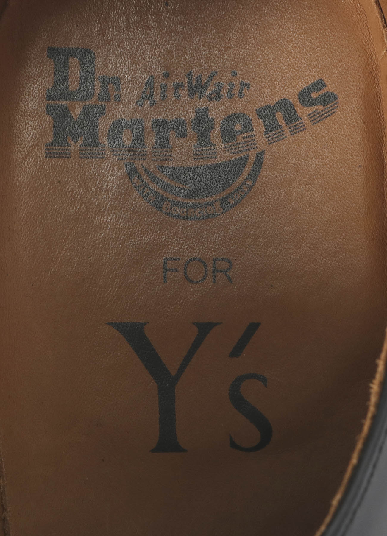 Y's has released a new collaboration with Dr. Martens, featuring a low-cut 3EYE SHOE with distinctive Y's design elements. The outer stitching is white and inner stitching is black, while the top eyelet is silver. The heel includes an "Air Wair" tag for convenience and style. The shoe can also be worn as a slip-on by removing the laces.