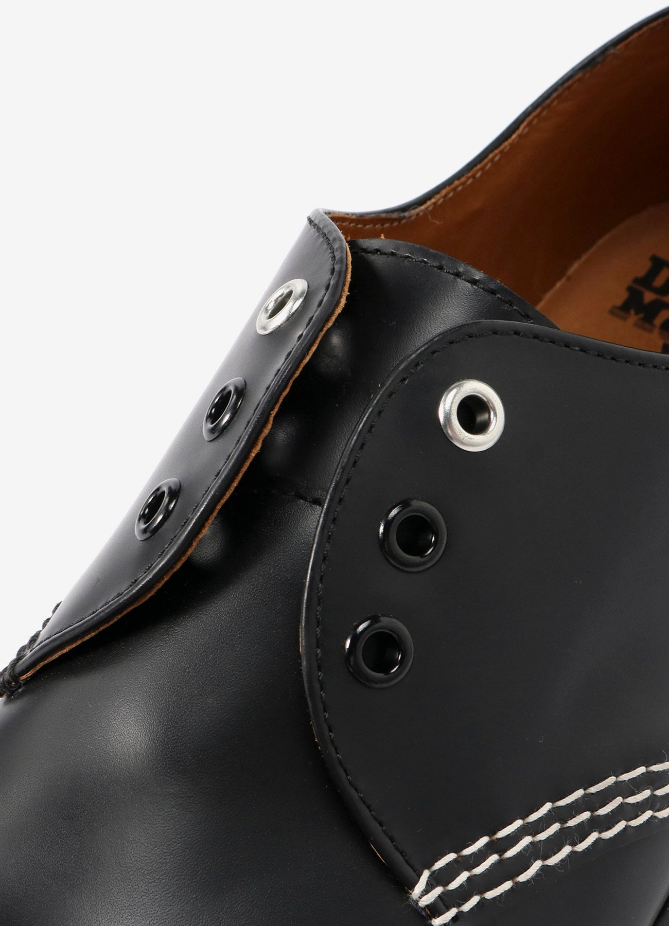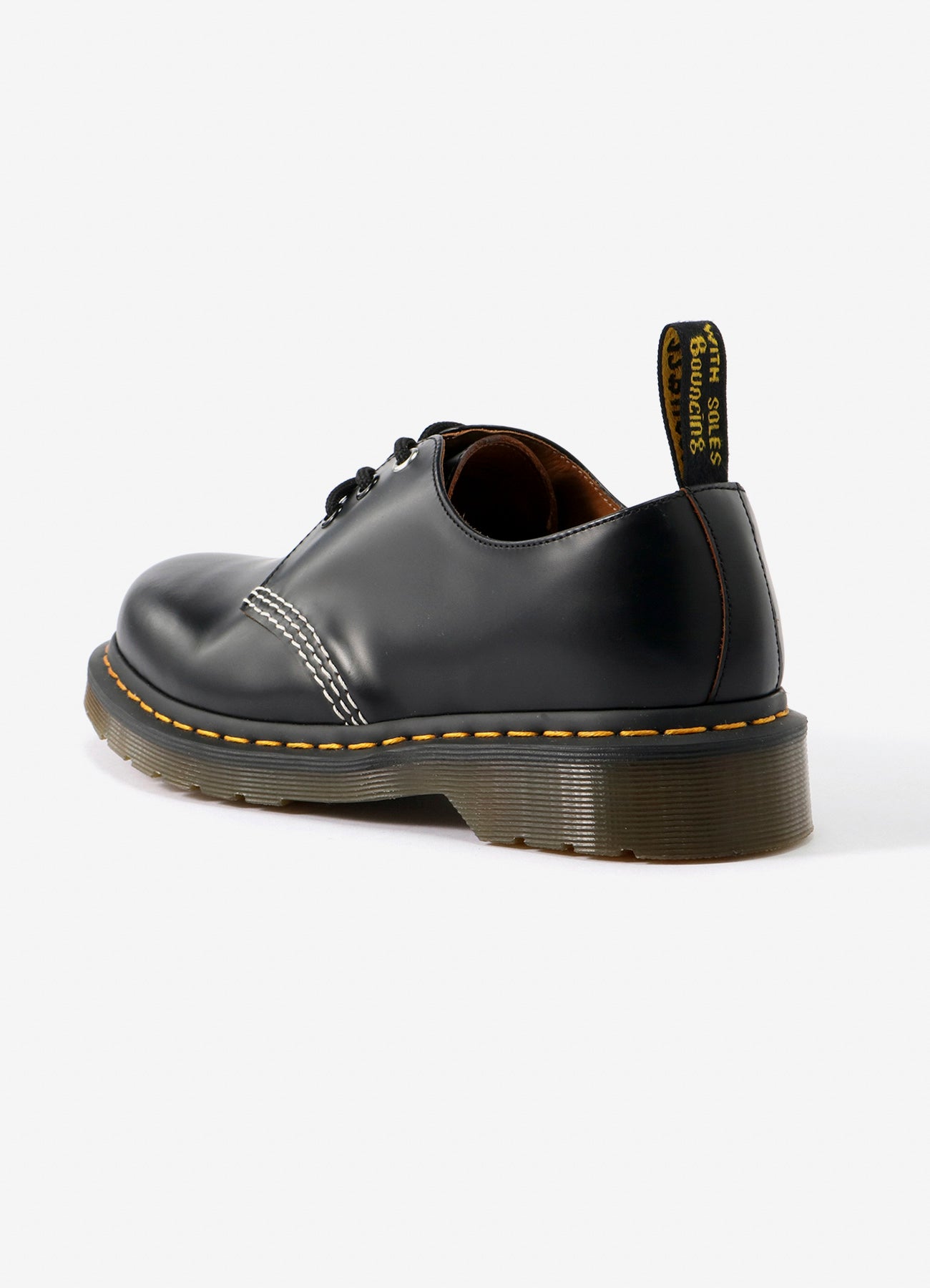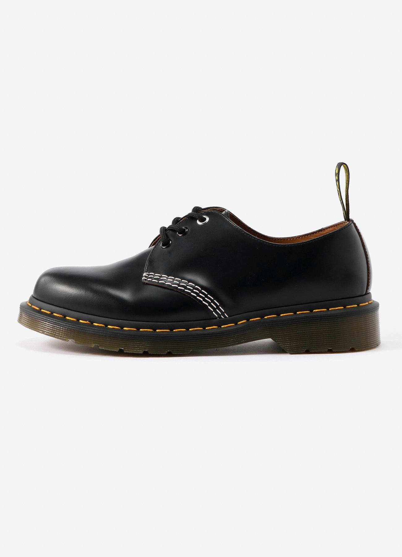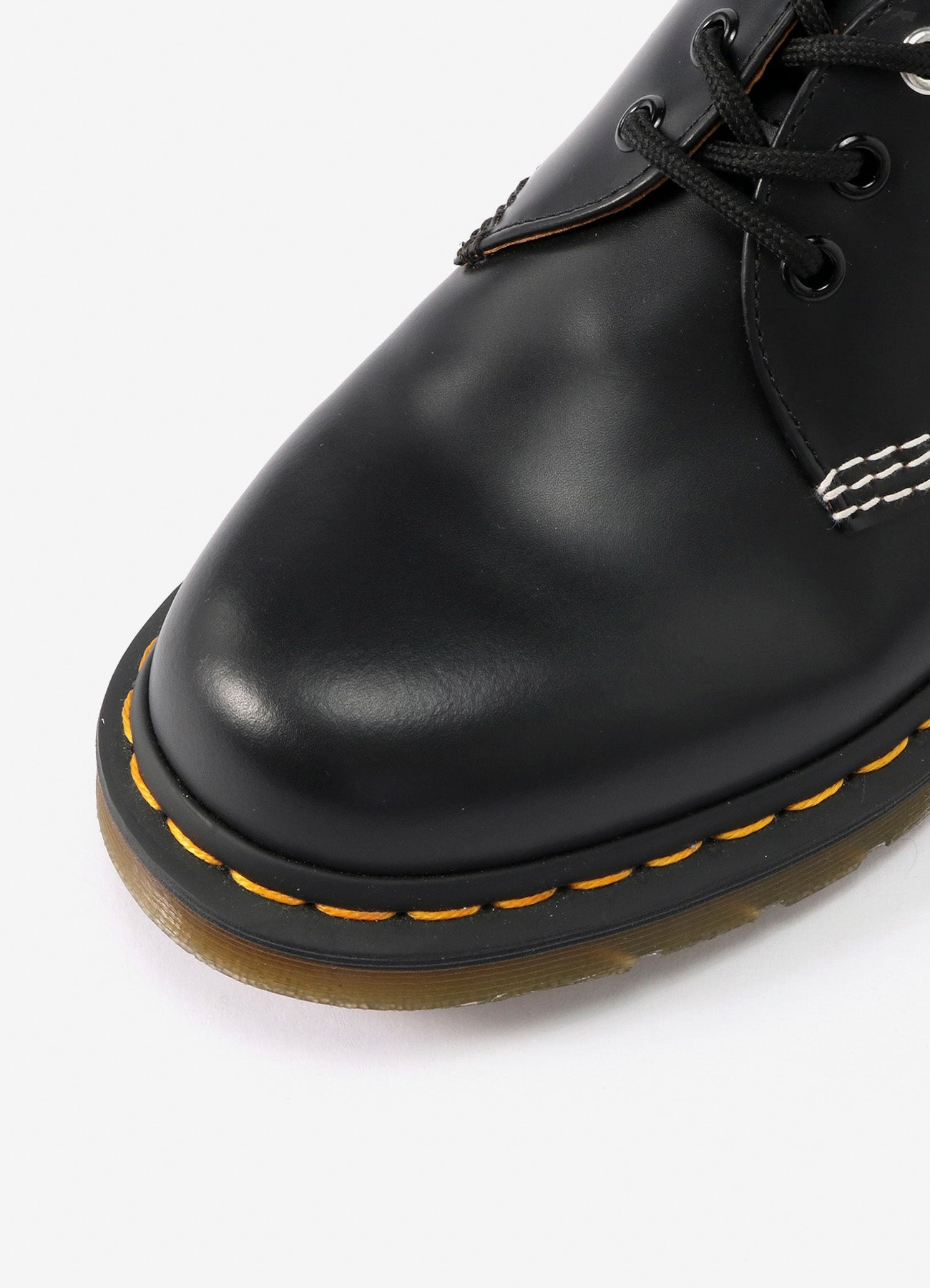 Y's has released a new collaboration with Dr. Martens, featuring a low-cut 3EYE SHOE with distinctive Y's design elements. The outer stitching is white and inner stitching is black, while the top eyelet is silver. The heel includes an "Air Wair" tag for convenience and style. The shoe can also be worn as a slip-on by removing the laces.