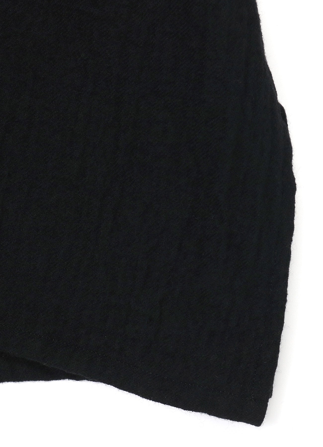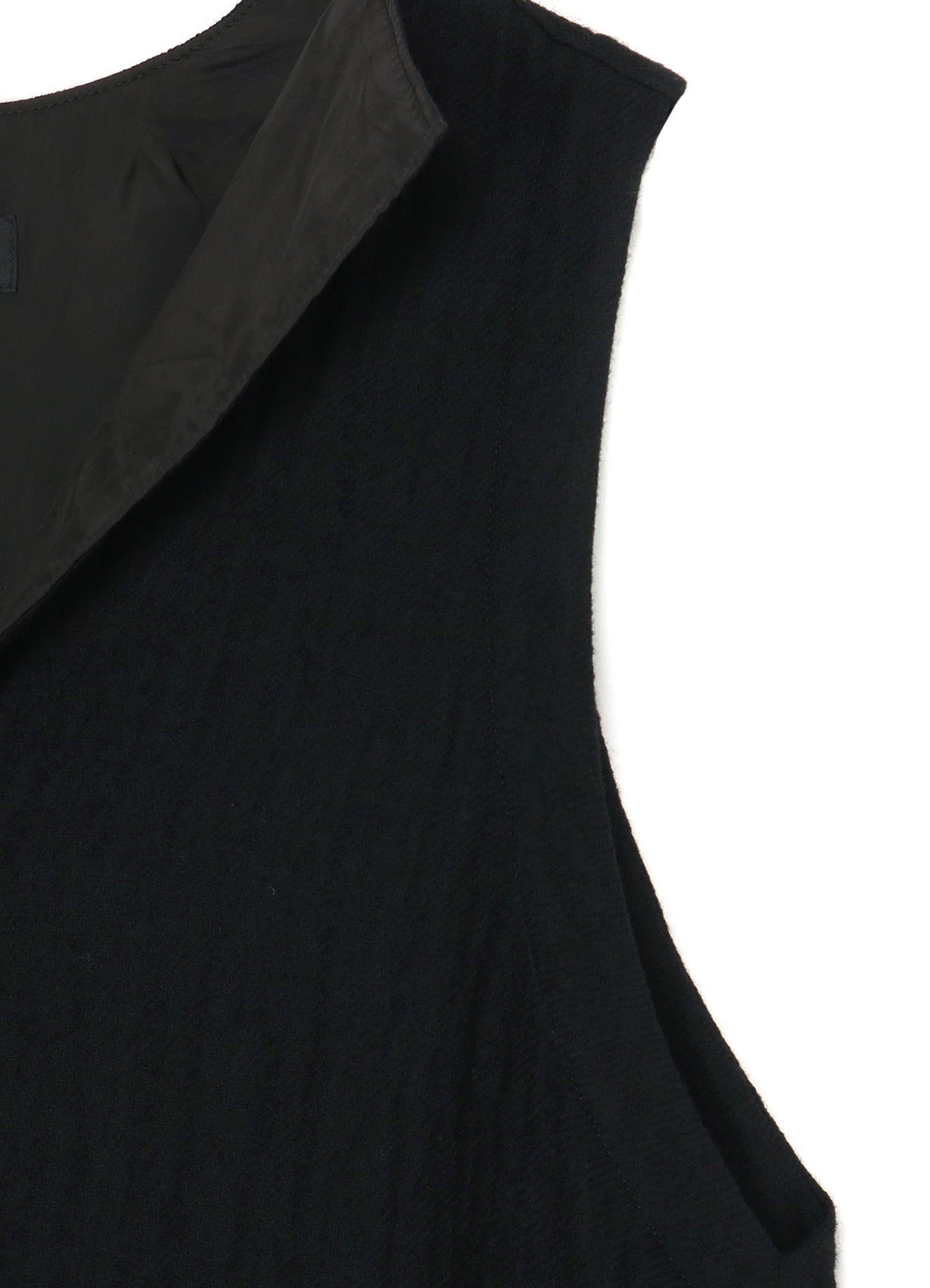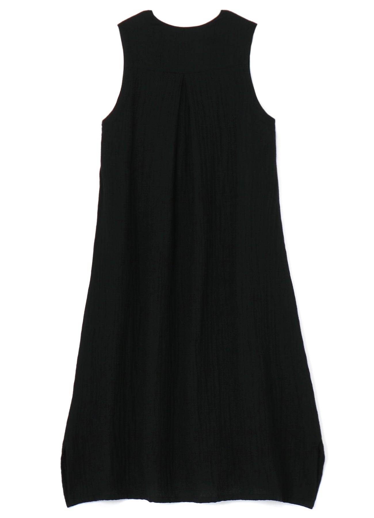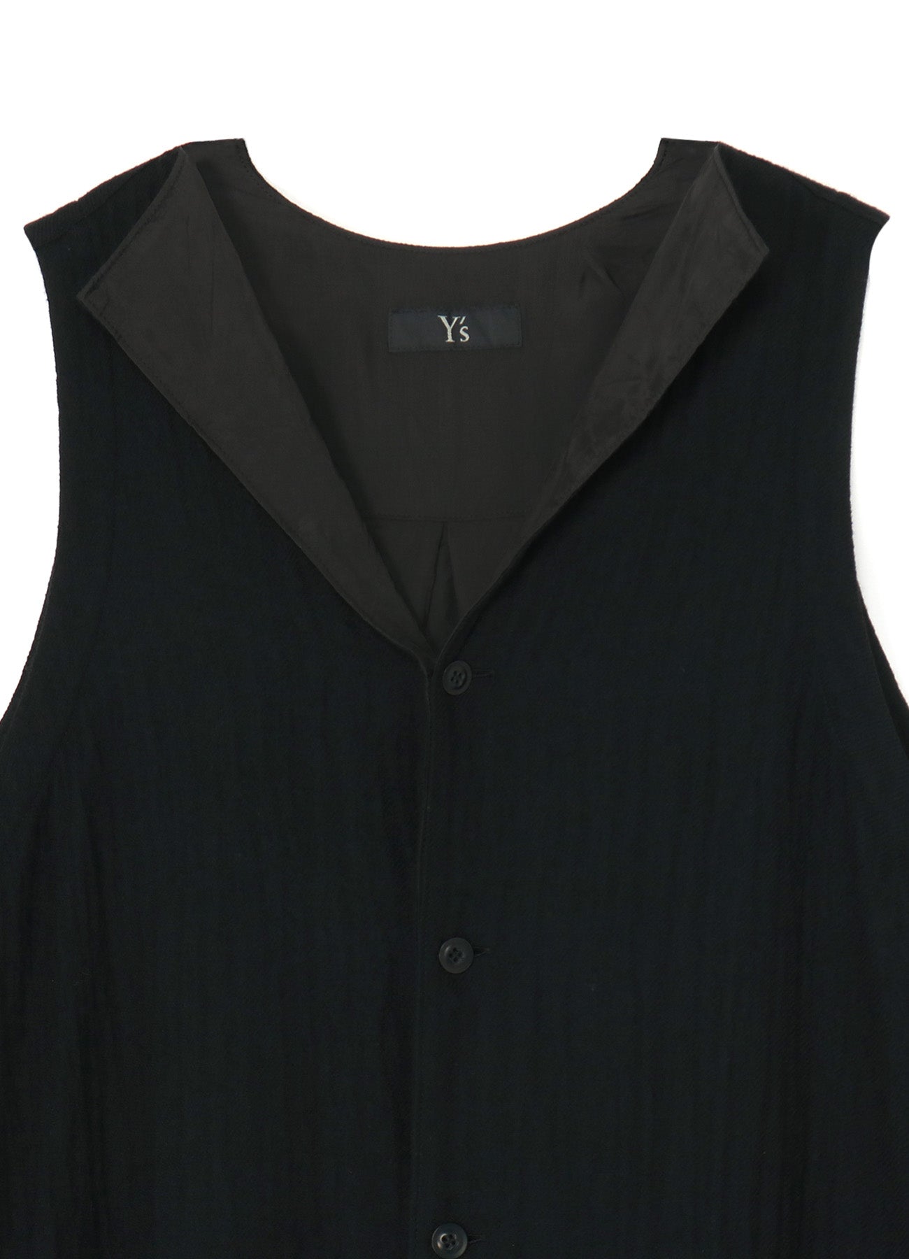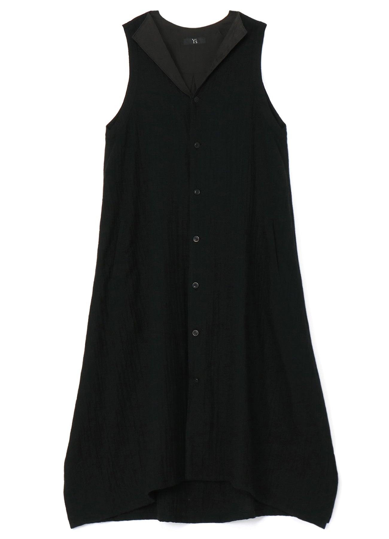 A wool sleeveless shirt dress treated with a soft-wash finish for a comfortable, textured feel. It features a roomy armhole suitable for inner wear layering and versatile styling as a long vest by unbuttoning the front. Accented subtly with inner lining peeking from the collar, available in basic colors.
