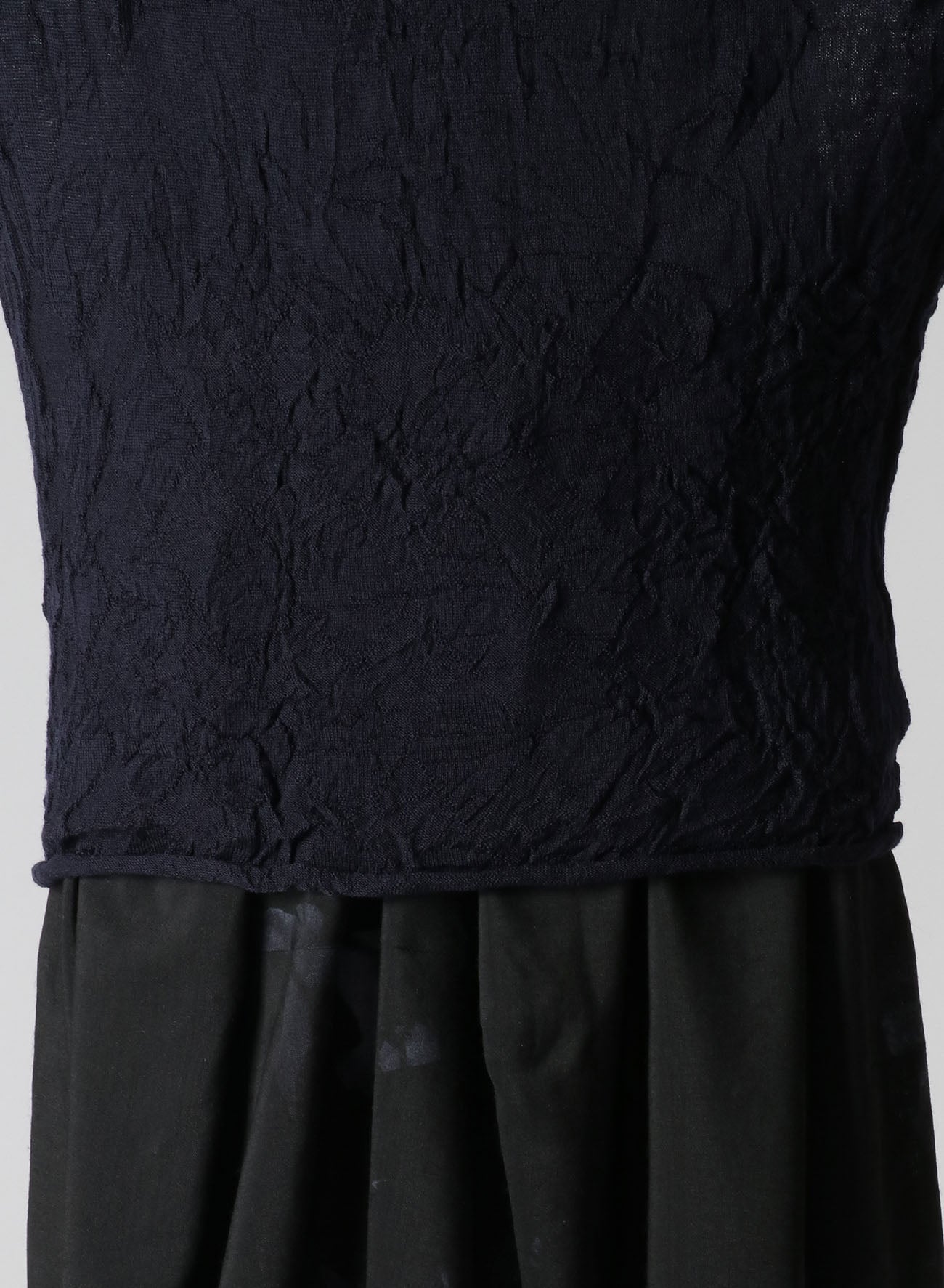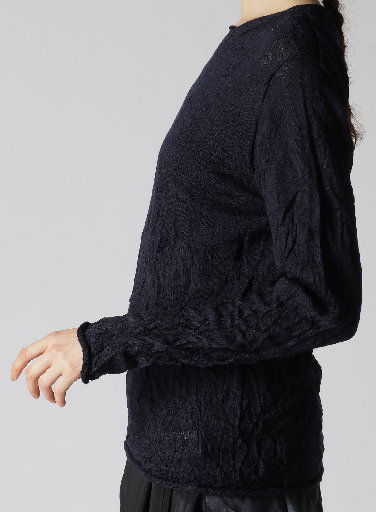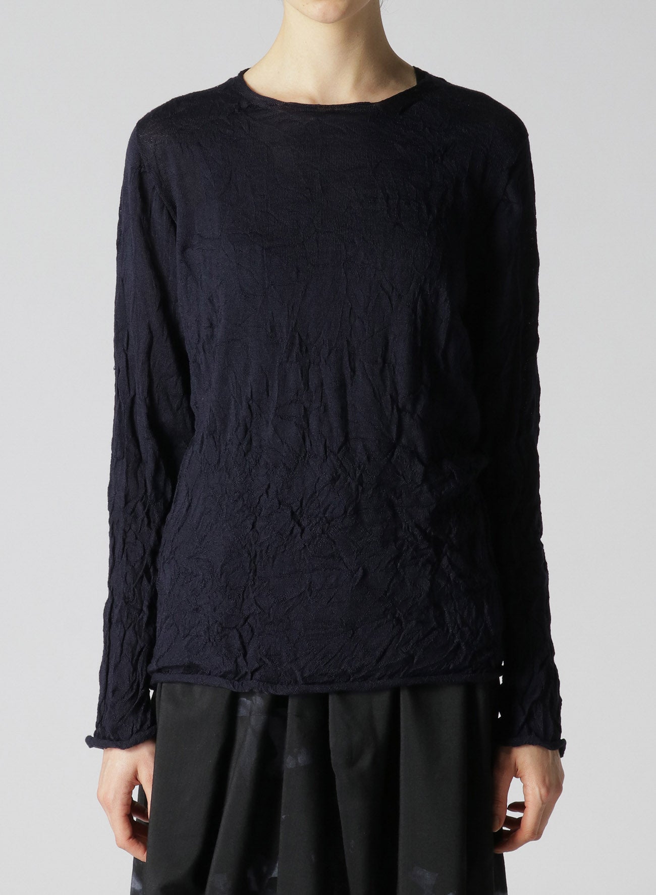 This is a popular crew-neck long-sleeve knit from Y's.... It features a distinctive crinkled fabric and curled hems. The woolen softness provides warmth, making it suitable for a single piece or as inner wear with a dress or jacket. Available in basic colors for easy styling.