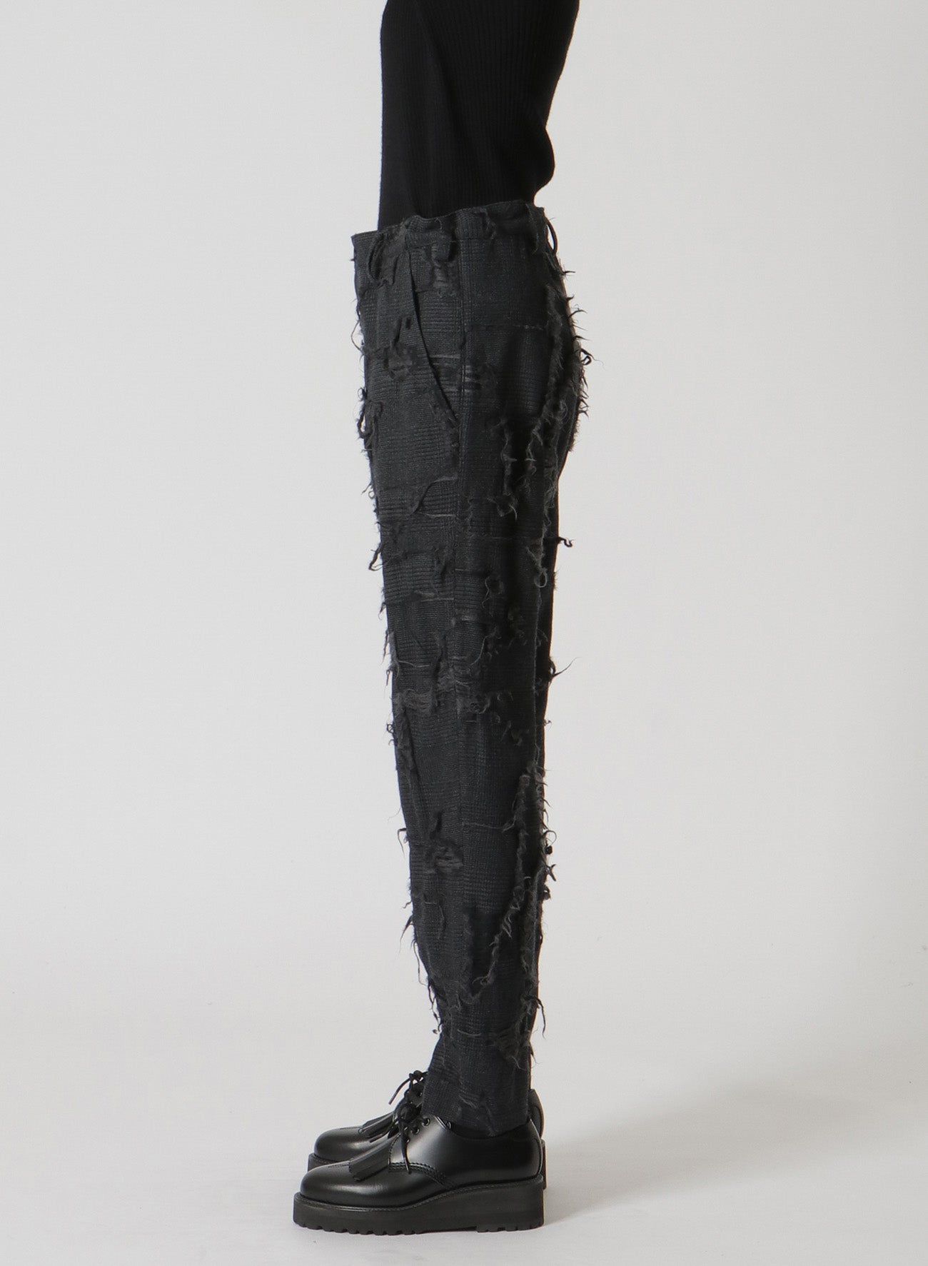 破けたような表情のグレンチェックスリムフィットパンツ。ウール素材を使用したグレンチェックをベースにランダム柄のカットジャガードを織り縮絨しています。すっきりとした細身のシルエットですが、ウエスト周りはゆったりとしており着やすいサイズ感です。