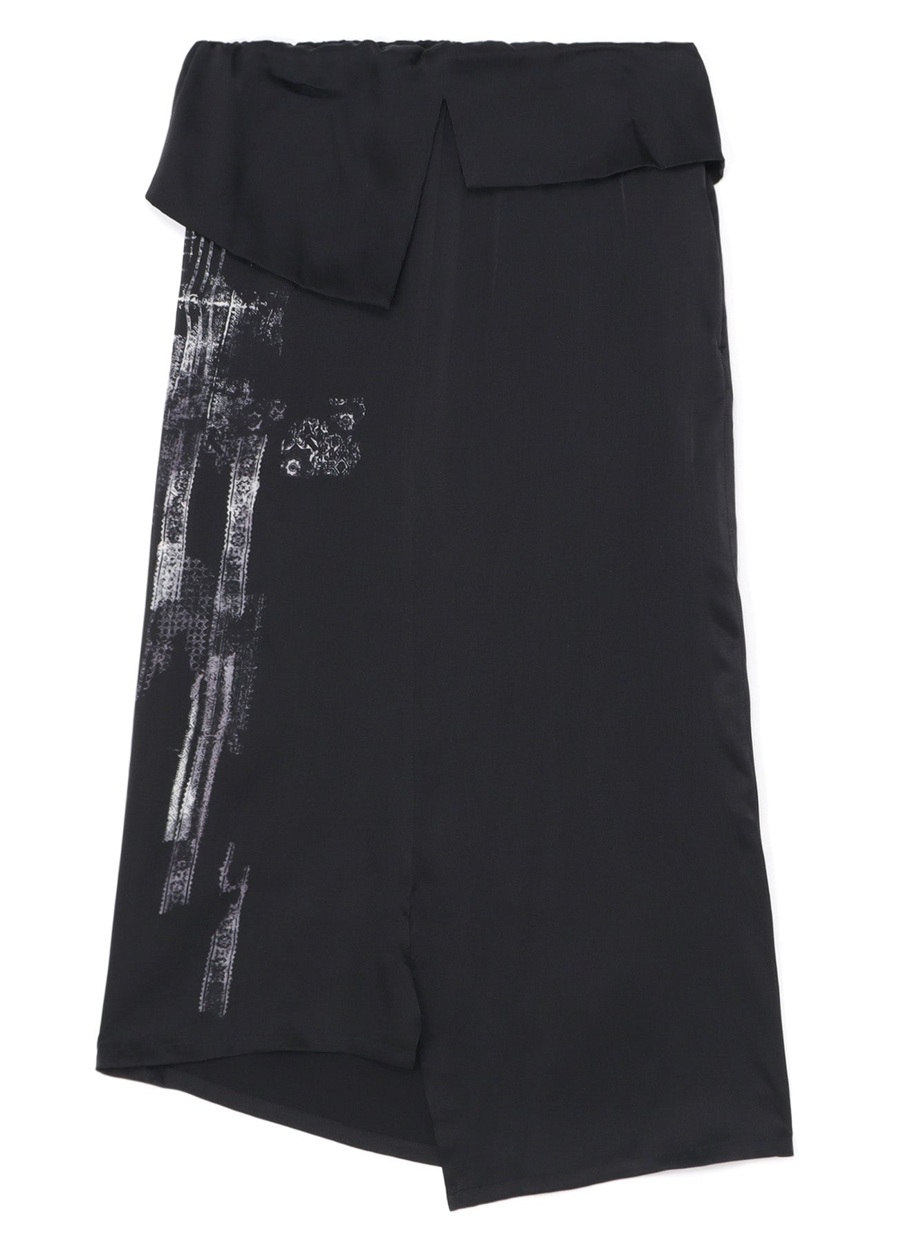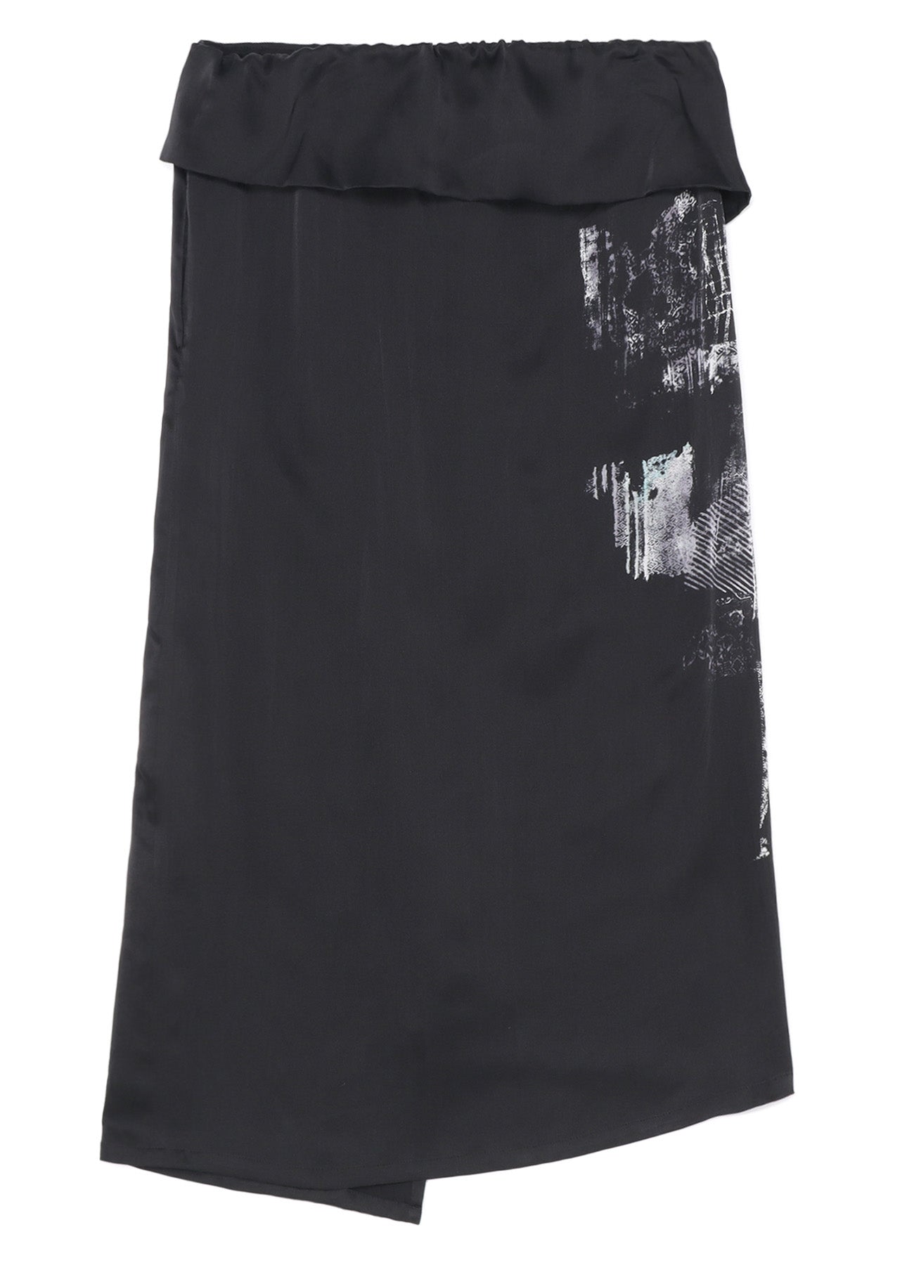 Silk asymmetric skirt with a luxurious sheen featuring an original print. Designed to be wrapped around the body, creating a unique hemline. The waist uses a drawstring to gather fabric at the front, forming ruffles when worn.