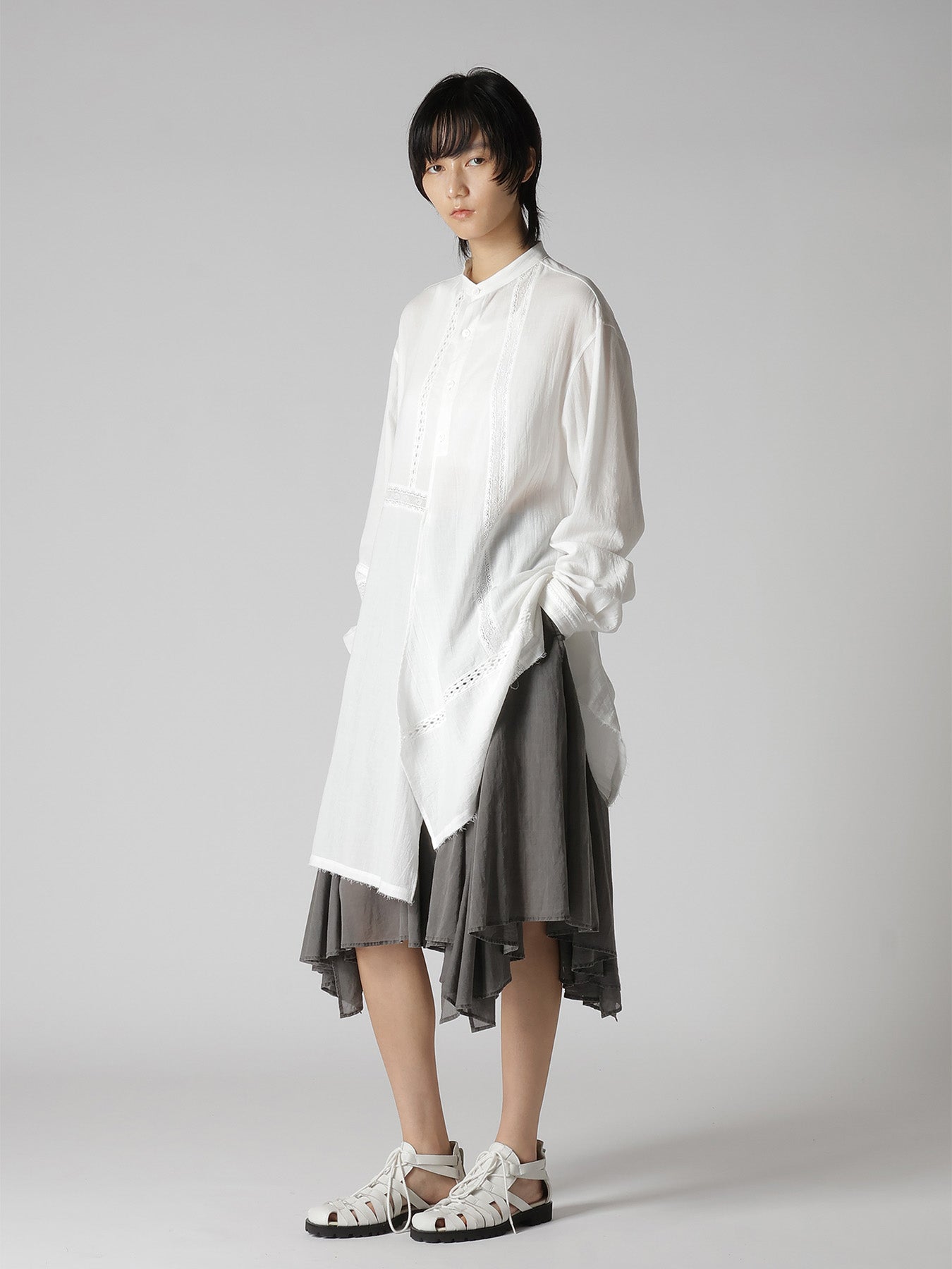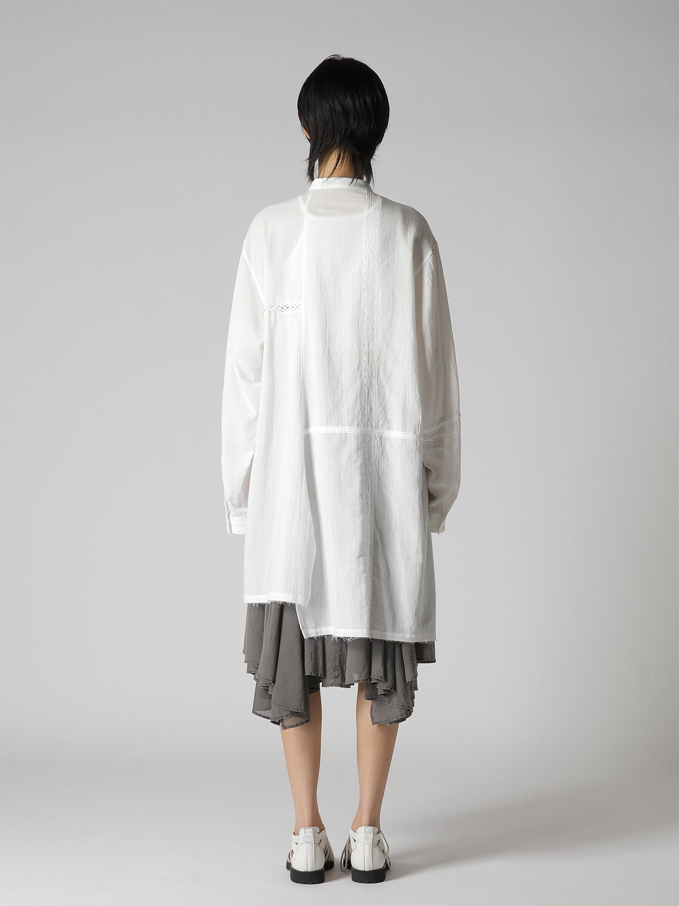 This blouse features a patchwork design with lace fabrics combined. The fabric has been softened through repeated kneading, resulting in a soft texture with a natural puff. The piece has an asymmetric silhouette with slits at four locations.