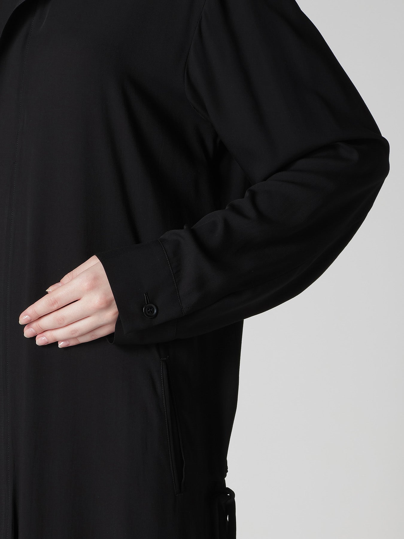 This drawstring dress is made from rayon fabric, achieving a deep black hue through multi-layer dyeing. It's designed with a long and lean silhouette, featuring front flares and back gathers for added movement, making it a sophisticated yet dynamic piece.