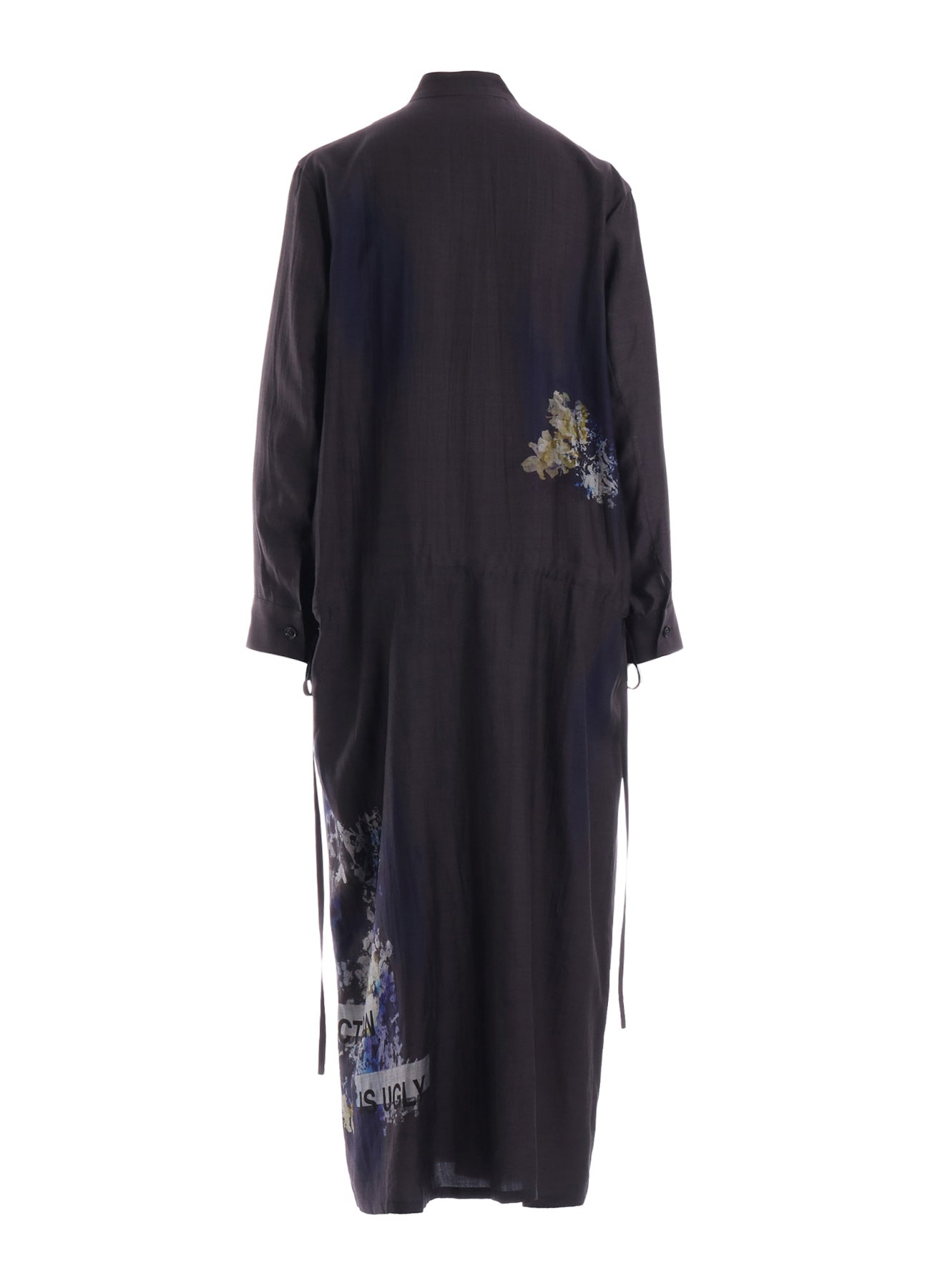 This dress in cupro fabric features the Yohji Yamamoto quote, "Perfection in ugly," celebrating imperfections. A long and lean silhouette is enhanced with front flares and back gathers for dynamic movement.