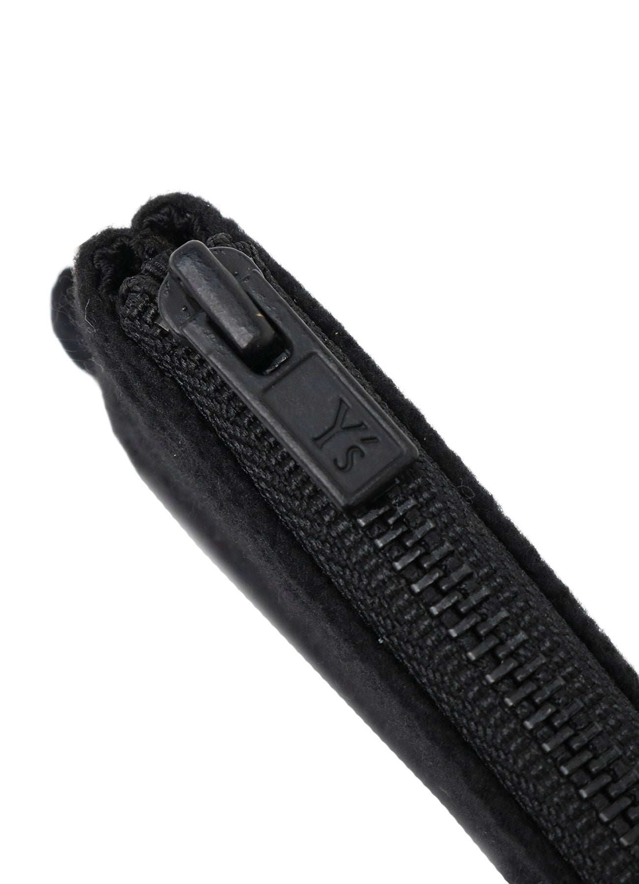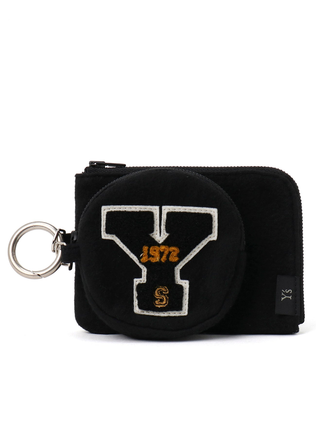A distinctive fleece double pouch with the iconic Y’s logo. The fabric is dyed with pigments and finished with stone bio treatment, featuring embroidery. The "Y" includes an "s" and the founding year "1972." It can be used as a wallet or small item holder, with a carabiner for bag charm use. Be cautious of slight color fading.