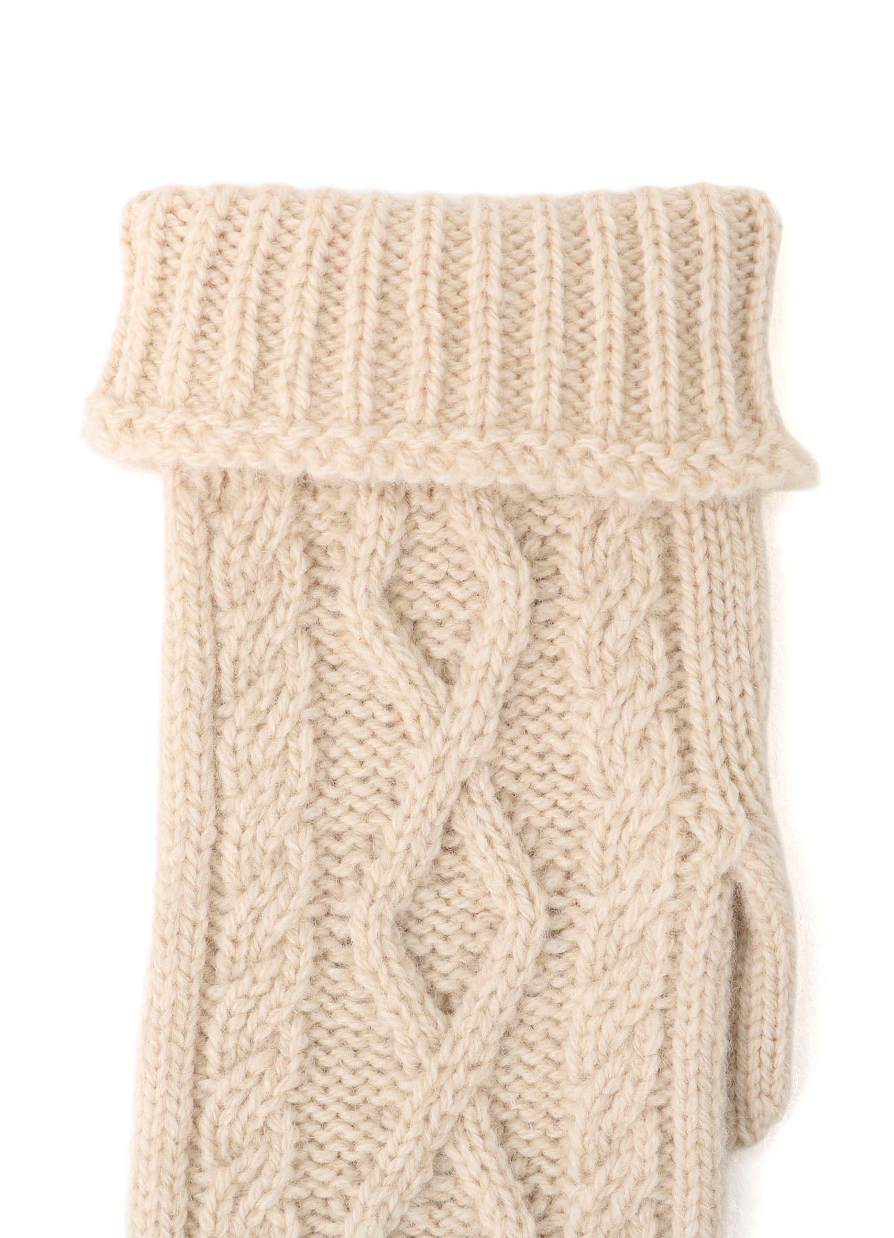 This mitten features hand stitching as an accent, inspired by vintage Aran sweaters, combining patterns for its design. The silhouette is puffy and pairs well with knitwear. As a knitted product, it may snag or fray from friction, so handle with care.