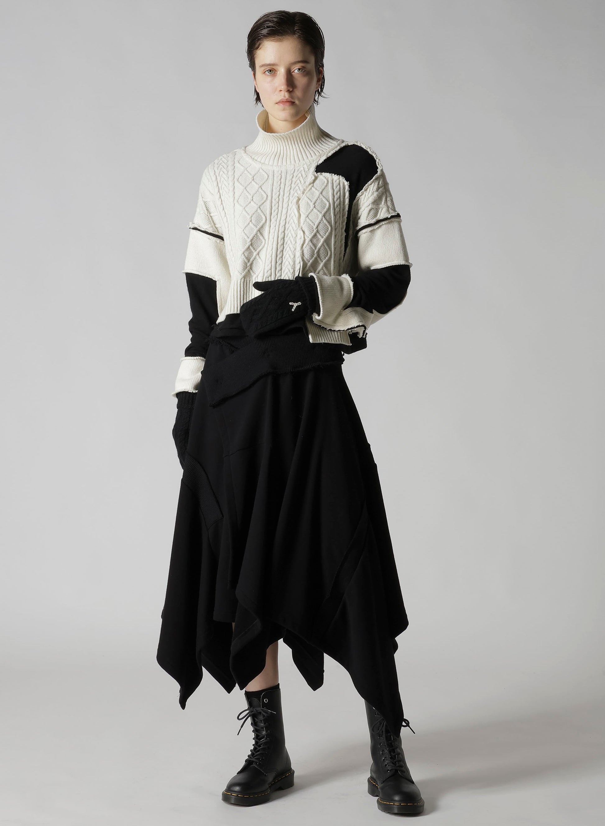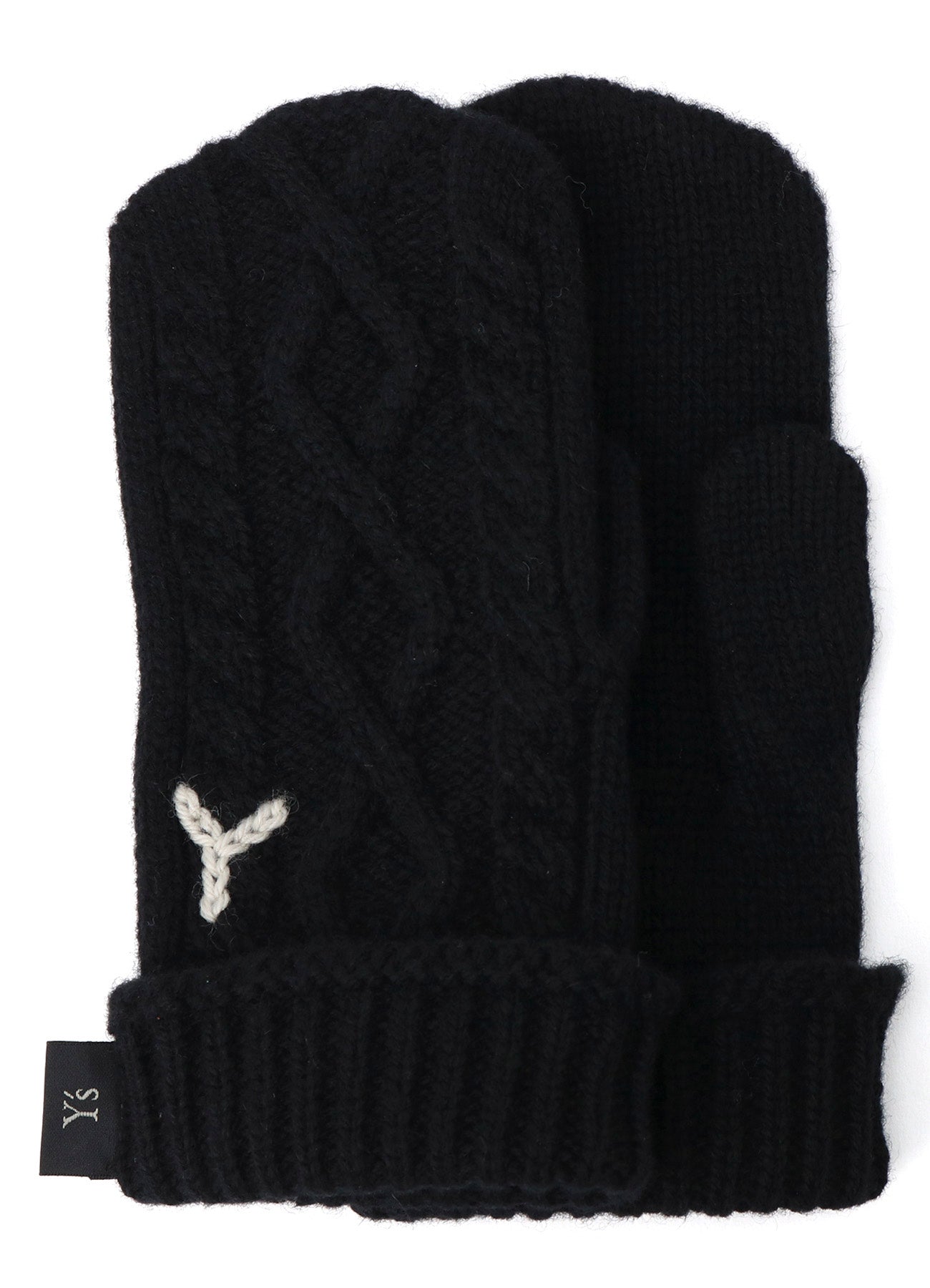 This mitten features hand stitching as an accent, inspired by vintage Aran sweaters, combining patterns for its design. The silhouette is puffy and pairs well with knitwear. As a knitted product, it may snag or fray from friction, so handle with care.