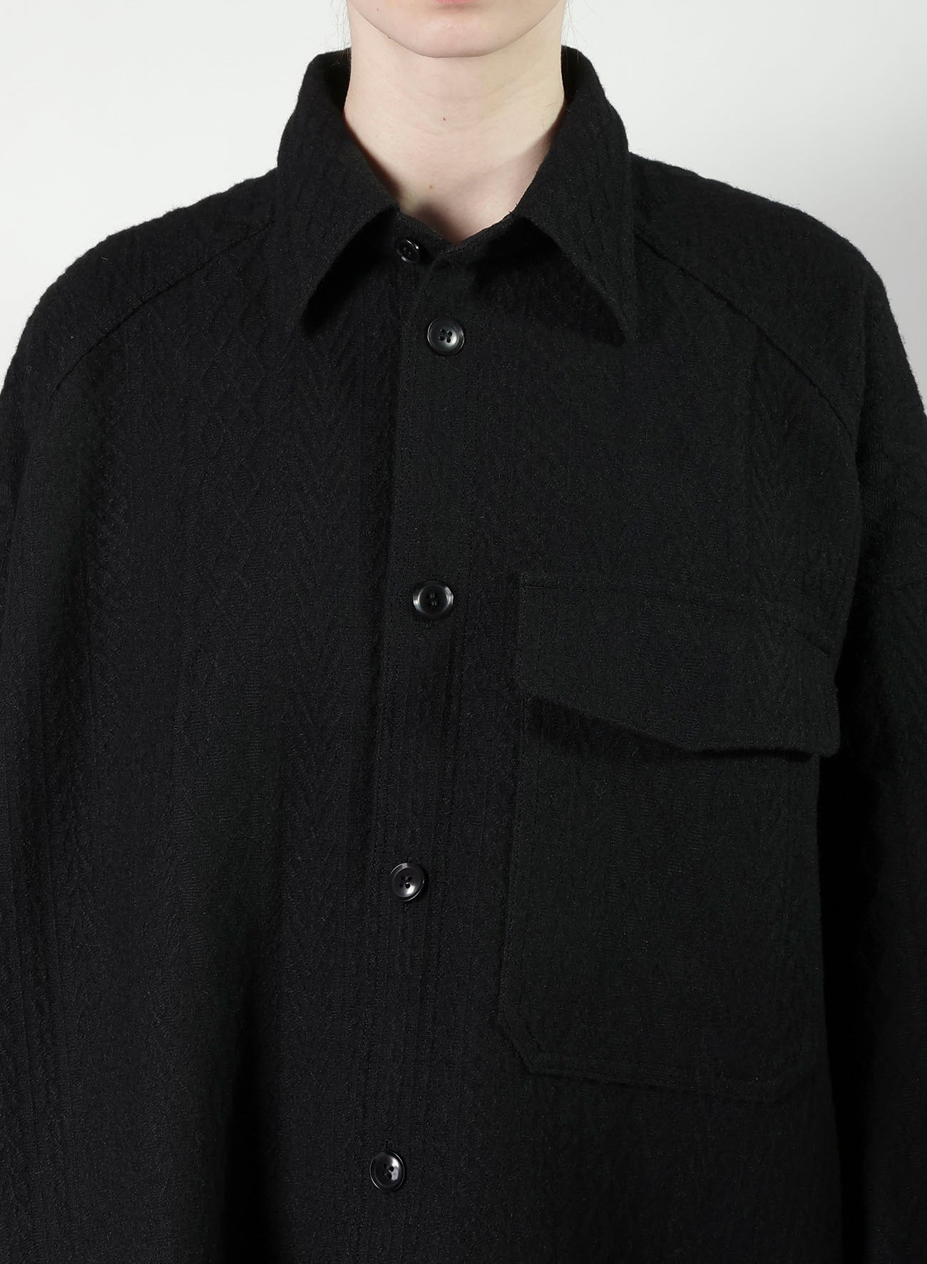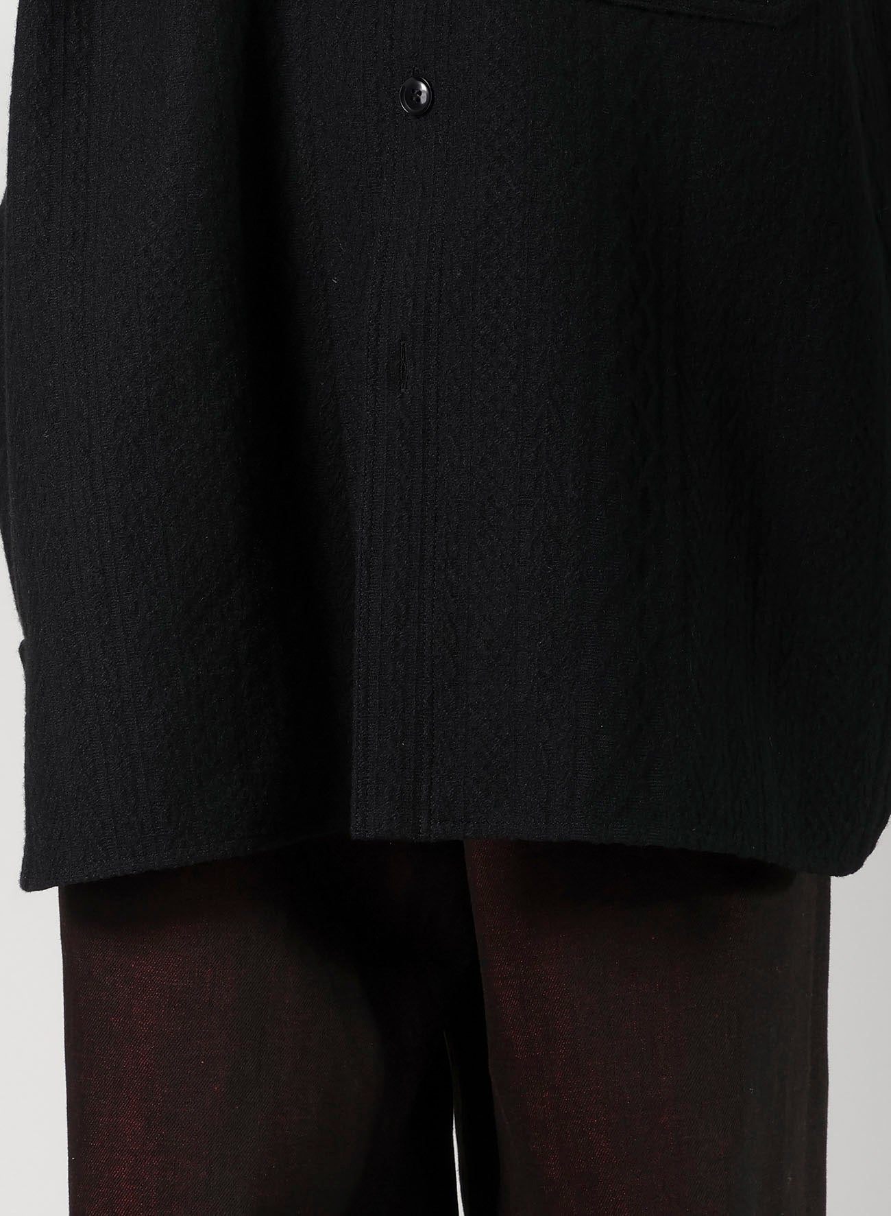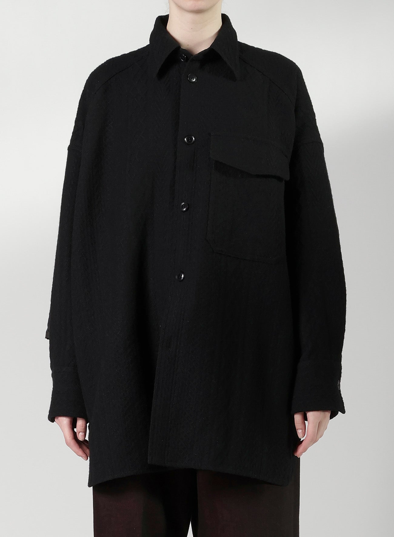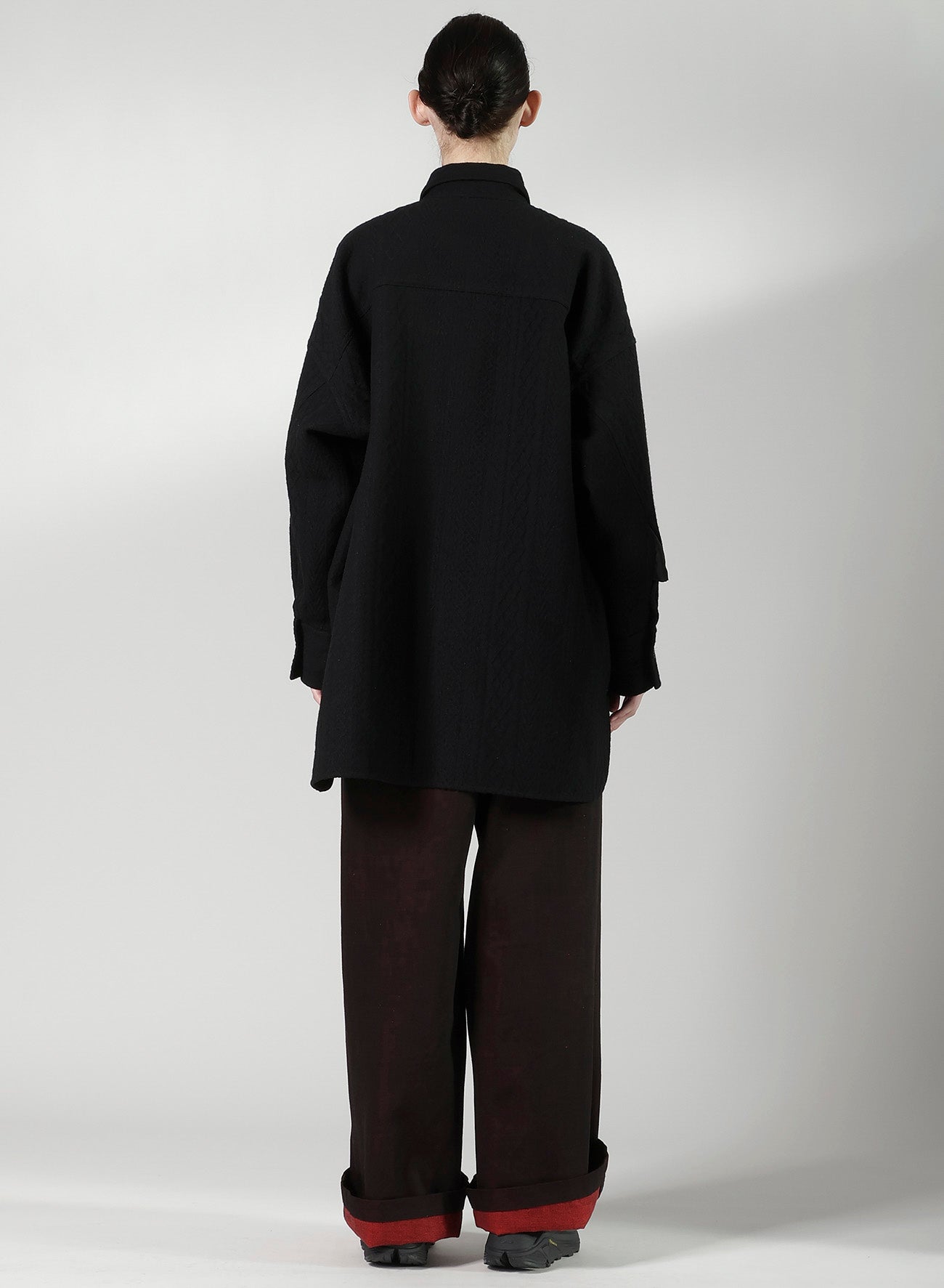"This blouse, crafted from fabric featuring a fisherman knit pattern, offers the feel of a light outerwear due to its sturdy and thick material. It's designed to be worn by all genders and serves as a versatile piece in your wardrobe.