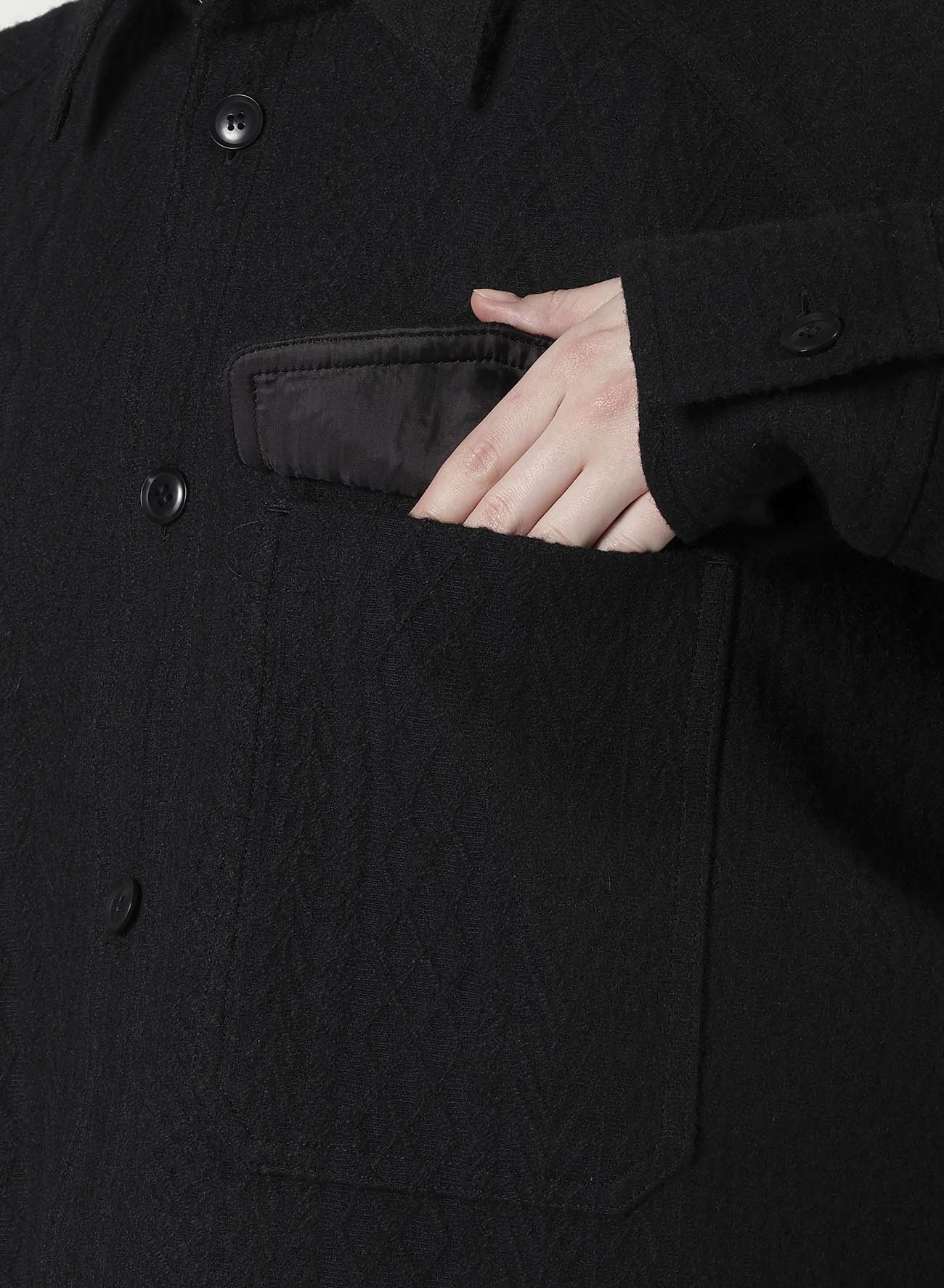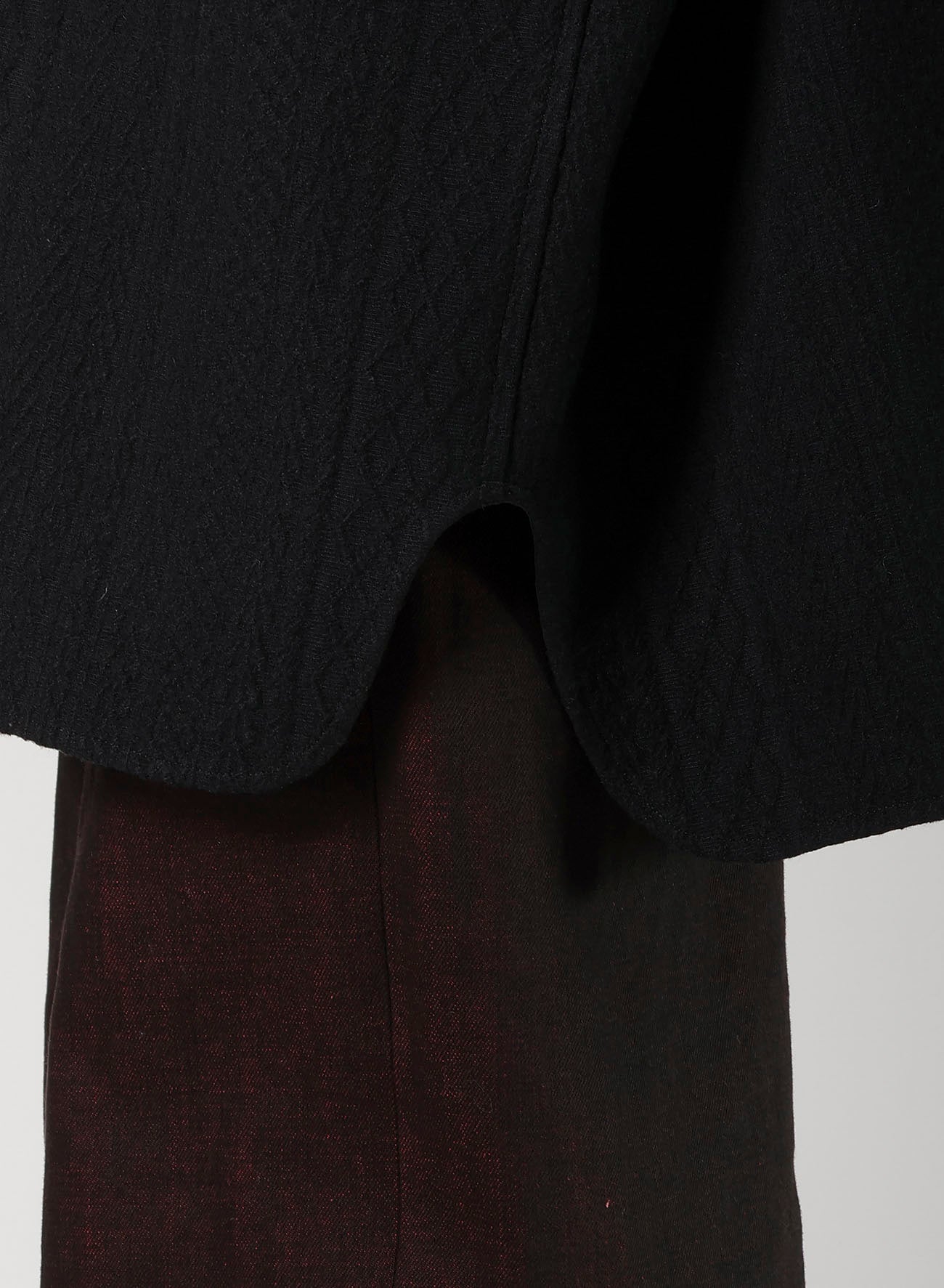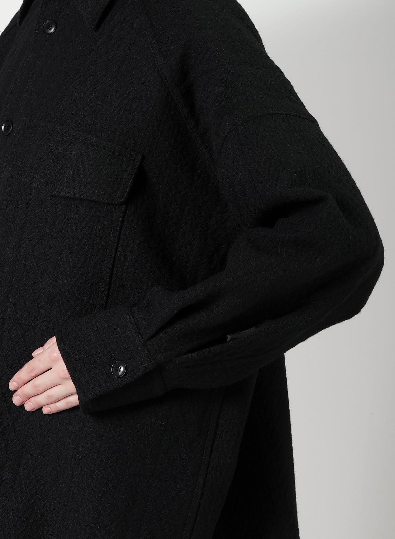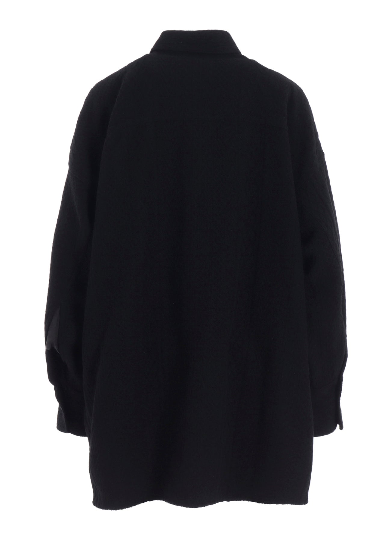 "This blouse, crafted from fabric featuring a fisherman knit pattern, offers the feel of a light outerwear due to its sturdy and thick material. It's designed to be worn by all genders and serves as a versatile piece in your wardrobe.