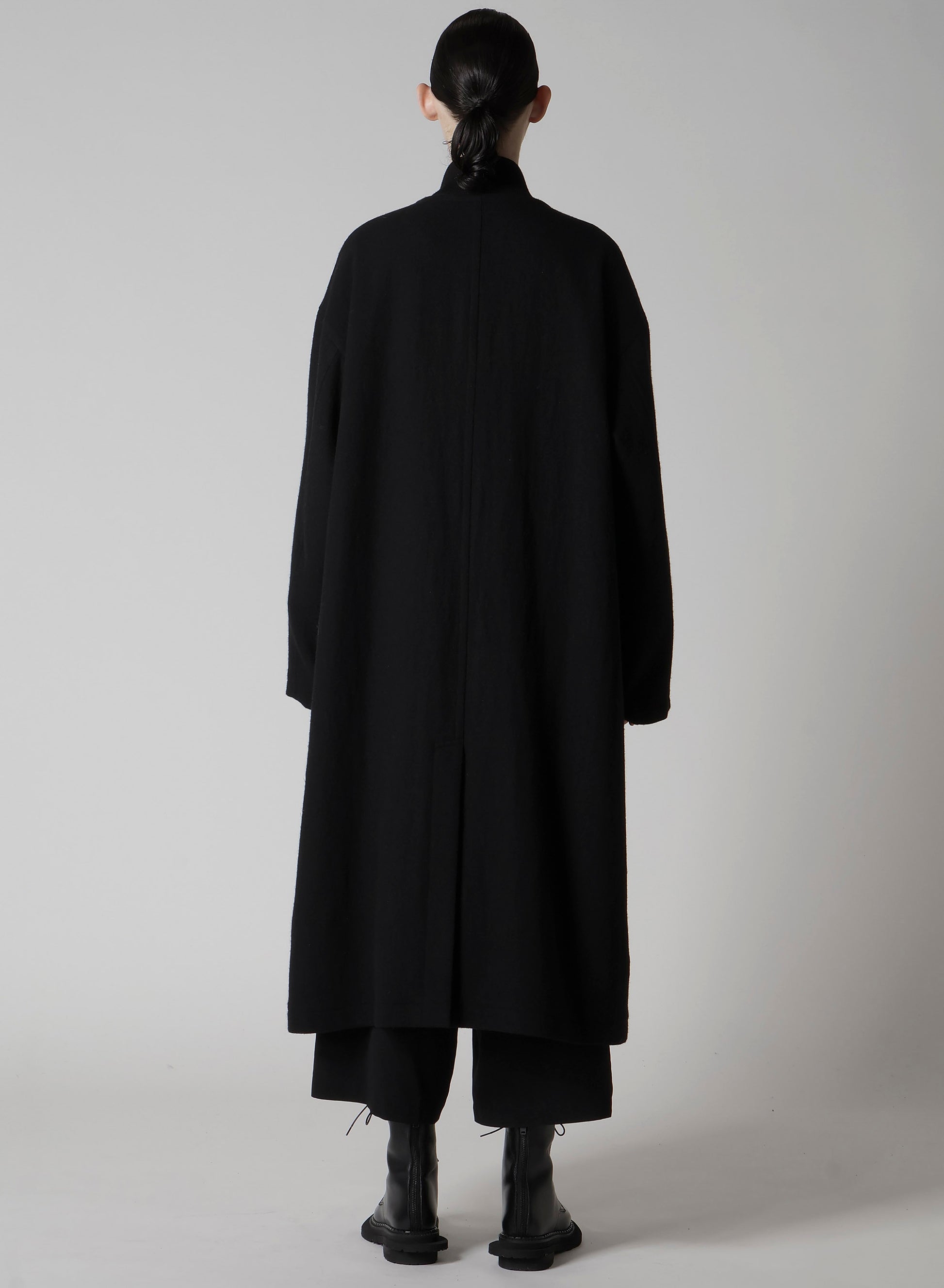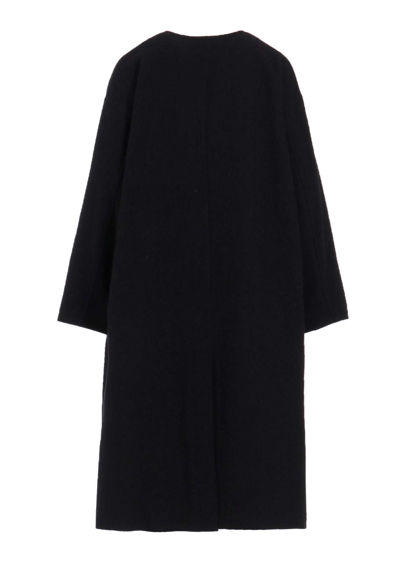 This flannel no-collar coat features a soft feel and is made from sustainable vintage flannel fabric using recycled wool yarns. The tumbler finish lends it a warm texture with some surface irregularity. Designed for a loose and light fit, it allows for comfortable layering, such as with inner down garments.