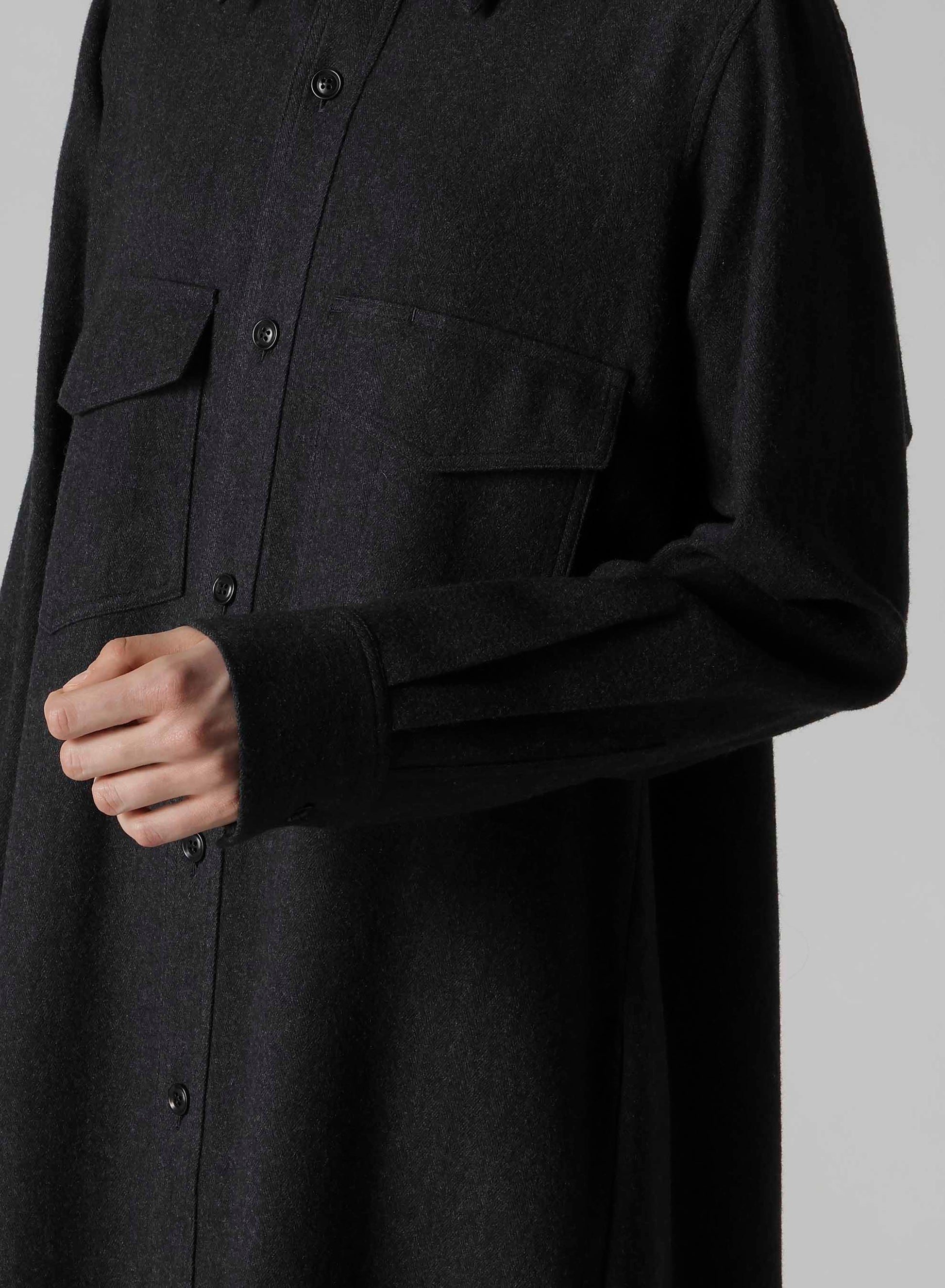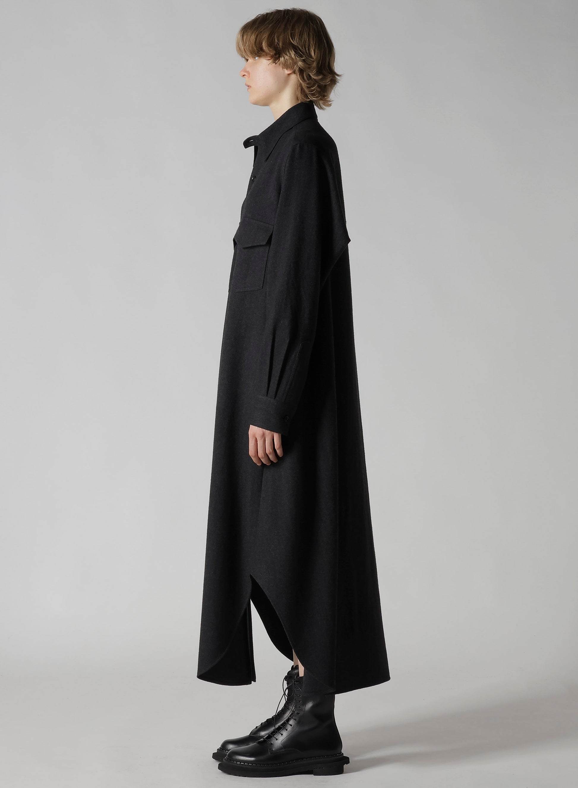 This dress uses wool from the Bishu region, offering a puffy and sturdy texture. Military details like the collar and pockets are included, and the back features flared fabric that flows when moving. It can be worn alone or styled with inner wear or pants.